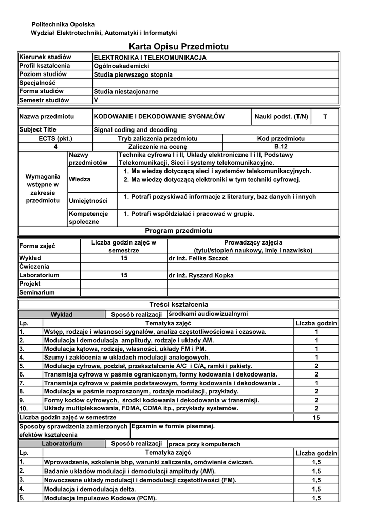 Politechnika Opolska Wydział Elektrotechniki, Automatyki i Informatyki Karta Opisu Przedmiotu Kierunek studiów Profil kształcenia Poziom studiów Specjalność Forma studiów Semestr studiów ELEKTRONIKA I TELEKOMUNIKACJA Ogólnoakademicki Studia pierwszego stopnia Nazwa przedmiotu KODOWANIE I DEKODOWANIE SYGNAŁÓW Studia niestacjonarne V Nauki podst. (T/N) T Subject Title Signal coding and decoding ECTS (pkt.) Tryb zaliczenia przedmiotu Kod przedmiotu B.12 4 Zaliczenie na ocenę Nazwy Technika cyfrowa I i II, Układy elektroniczne I i II, Podstawy przedmiotów Telekomunikacji, Sieci i systemy telekomunikacyjne. 1. Ma wiedzę dotyczącą sieci i systemów telekomunikacyjnych. Wymagania Wiedza 2. Ma wiedzę dotyczącą elektroniki w tym techniki cyfrowej. wstępne w zakresie 1. Potrafi pozyskiwać informacje z literatury, baz danych i innych przedmiotu Umiejętności Kompetencje społeczne 1. Potrafi współdziałać i pracować w grupie. Program przedmiotu Forma zajęć Wykład Ćwiczenia Laboratorium Projekt Seminarium Liczba godzin zajęć w semestrze 15 15 Prowadzący zajęcia (tytuł/stopień naukowy, imię i nazwisko) dr inż. Feliks Szczot dr inż. Ryszard Kopka Treści kształcenia Sposób realizacji środkami audiowizualnymi Lp. Tematyka zajęć 1. Wstęp, rodzaje i własnosci sygnałów, analiza częstotliwościowa i czasowa. 2. Modulacja i demodulacja amplitudy, rodzaje i układy AM. 3. Modulacja kątowa, rodzaje, własności, układy FM i PM. 4. Szumy i zakłócenia w układach modulacji analogowych. 5. Modulacje cyfrowe, podział, przekształcenie A/C i C/A, ramki i pakiety. 6. Transmisja cyfrowa w paśmie ograniczonym, formy kodowania i dekodowania. 7. Transmisja cyfrowa w paśmie podstawowym, formy kodowania i dekodowania . 8. Modulacja w paśmie rozproszonym, rodzaje modulacji, przykłady. 9. Formy kodów cyfrowych, środki kodowania i dekodowania w transmisji. Układy multipleksowania, FDMA, CDMA itp., przykłady systemów. 10. Liczba godzin zajęć w semestrze Sposoby sprawdzenia zamierzonych Egzamin w formie pisemnej. efektów kształcenia Laboratorium Sposób realizacji praca przy komputerach Tematyka zajęć Lp. 1. Wprowadzenie, szkolenie bhp, warunki zaliczenia, omówienie ćwiczeń. 2. Badanie układów modulacji i demodulacji amplitudy (AM). 3. Nowoczesne układy modulacji i demodulacji częstotliwości (FM). 4. Modulacja i demodulacja delta. 5. Modulacja Impulsowo Kodowa (PCM). Wykład Liczba godzin 1 1 1 1 2 2 1 2 2 2 15 Liczba godzin 1,5 1,5 1,5 1,5 1,5 6. Własności modulacji PWM i PPM. 1,5 7. Nowoczesne układy modulacji fazy BPSK, QPSK, QAM. 1,5 8. Badanie kodowania AMI, własności kodów nadmiarowych Hamminga. 1,5 9. Modulacja CDMA. 1,5 Zaliczenie. 10. 1,5 Liczba godzin zajęć w semestrze 15 Sposoby sprawdzenia zamierzonych Na podstawie ocen cząstkowych uzyskanych podczas poszczególnych zajęć. efektów kształcenia 1. Ma elementarną wiedzę w zakresie podstaw telekomunikacji oraz systemów i sieci telekomunikacyjnych, sposobów modulacji (demodulacji) i kodowanaia (dekodowania) Wiedza sygnałów. Efekty kształcenia dla przedmiotu - po zakończonym cyklu kształcenia Umiejętności Kompetencje społeczne 1. Potrafi pozyskiwać informacje z literatury, baz danych i innych źródeł; potrafi integrować uzyskane informacje, dokonywać ich interpretacji, a także wyciągać wnioski oraz formułować i uzasadniać opinie. 2. Potrafi opracować dokumentację dotyczącą realizacji zadania inżynierskiego i przygotować tekst zawierający omówienie wyników realizacji tego zadania. 3. Potrafi zbudować, uruchomić oraz przetestować zaprojektowany układ lub prosty system elektroniczny). 1. Rozumie potrzebę i zna możliwości ciągłego dokształcania się (studia drugiego i trzeciego stopnia, studia podyplomowe, kursy) - podnoszenia kompetencji zawodowych, osobistych i społecznych. Metody dydaktyczne: Wykład prowadzony przy pomocy prezentacji w formie elektronicznej. Zajęcia laboratoryjne prowadzone przy pomocy specjalnie przygotowanych zestawów pomiarowych. Forma i warunki zaliczenia przedmiotu: Wykład – zaliczenie pisemne, Laboratorium – na podstawie oceny przygotowania i wykonanie wszystkich ćwiczeń laboratoryjnych. Literatura podstawowa: [1] KULA S.: Systemy teletransmisyjne, WKŁ, Warszawa, 2004 [2] JAJSZCZYK A.: Wstęp do telekomutacji, WNT, Warszawa, 2000. [3] WESOŁOWSKI K.: Podstawy cyfrowych systemów telekomunikacyjnych, WKŁ, Warszawa, 2003. [4] KABACIŃSKI W., ŻAL M.: Sieci telekomunikacyjne, WKŁ, Warszawa, 2008. [5] WESOŁOWSKI K.: Systemy radiokomunikacji ruchomej, WKŁ, Warszawa, 2006. [6] HAYKIN S.: Systemy telekomunikacyjne. T.1, T.2, WKŁ, Warszawa, 2004. [7] HUBOWICZ W., SZWABE M.: Systemy radiowe z rozpraszaniem widma, CDMA: teoria standardy, aplikacje, Polsoft, Poznań, 1998. Literatura uzupełniająca: [1] Instrukcje laboratoryjne do wszystkich ćwiczeń [2] KAMIENIECKI A.: Współczesny oscyloskop: budowa i pomiary, Wydawnictwo btc, cop., Legionowo, 2009. ______________ * niewłaściwe przekreślić ………………………………………………….. ………………………………………………………. (kierownik jednostki organizacyjnej/bezpośredni przełożony: (Dziekan Wydziału pieczęć/podpis pieczęć/podpis)