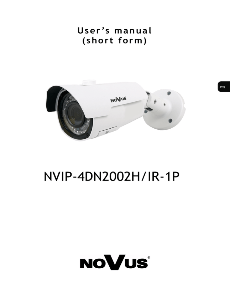 U s e r ’s m a n u a l (short form) NVIP-4DN2002H/IR-1P NVIP-4DN2002H/IR-1P - User’s manual (short form) ver 1.2 IMPORTANT SAFEGUARDS AND WARNINGS EMC (2004/108/EC) and LVD (2006/95/EC ) Directives CE Marking Our products are manufactured to comply with requirements of the following directives and national regulations implementing the directives: Electromagnetic compatibility EMC 2004/108/EC. Low voltage LVD 2006/95/EC with further amendment. The Directive applies to electrical equipment designed for use with a voltage rating of between 50VAC and 1000VAC as well as 75VDC and 1500VDC. WEEE Directive 2012/19/UE Information on Disposal for Users of Waste Electrical and Electronic Equipment This appliance is marked according to the European 1000VAC Directive on Waste Electrical and Electronic Equipment (2002/96/EC) and further amendments. By ensuring this product is disposed of correctly, you will help to prevent potential negative consequences for the environment and human health, which could otherwise be caused by inappropriate waste handling of this product. The symbol on the product, or the documents accompanying the product, indicates that this appliance may not be treated as household waste. It shall be handed over to the applicable collection point for used up electrical and electronic equipment for recycling purpose. For more information about recycling of this product, please contact your local authorities, your household waste disposal service or the shop where you purchased the product. RoHS Directive 2011/65/UE Information concerning the restriction of use of hazardous substances in electrical electronic equipment. Out of concern for human health protection and friendly environment, we assure that our products falling under RoHS Directive regulations, regarding the restriction of the use of hazardous substances in electrical and electronic equipment, have been designed and manufactured in compliance with the above mentioned regulations. Simultaneously, we claim that our products have been tested and do not contain hazardous substances whose exceeding limits could have negative impact on human health or natural environment Information The device, as a part of professional CCTV system used for surveillance and control, is not designed for self installation in households by individuals without technical knowledge. Excluding of responsibility in case of damaging data on a disk or other devices: The manufacturer does not bear any responsibility in case of damaging or losing data on a disk or other devices during device operation. WARNING! PRIOR TO UNDERTAKING ANY ACTION THAT IS NOT DESCRIBED FOR THE GIVEN PRODUCT IN USER’S MANUAL AND OTHER DOCUMENTS DELIVERED WITH THE PRODUCT, OR IF IT DOES NOT ARISE FROM THE USUAL APPLICATION OF THE PRODUCT, MANUFACTURER MUST BE CONTACTED UNDER THE RIGOR OF EXCLUDING THE MANUFACTURER’S RESPONSIBILITY FOR THE RESULTS OF SUCH AN ACTION. All rights reserved © AAT Holding S.A. 2 NVIP-4DN2002H/IR-1P - User’s manual (short form) ver 1.2 IMPORTANT SAFEGUARDS AND WARNINGS WARNING! THE KNOWLEDGE OF THIS SHORT MANUAL IS AN INDESPENSIBLE CONDITION OF A PROPER DEVICE ISTALLATION AND CONFIGURATION. YOU ARE KINDLY REQUSTED TO FAMILIRIZE YOURSELF WITH THE FULL USER MANUAL PRIOR TO FURTHER DEVICE EXPLOATATION. FULL USER MANUAL IS AVAILABLE ON www.novus.com/en WARNING! USER IS NOT ALLOWED TO DISASSEMBLE THE CASING AS THERE ARE NO USER-SERVICEABLE PARTS INSIDE THIS UNIT. ONLY AUTHORIZED SERVICE PERSONNEL MAY OPEN THE UNIT. INSTALLATION AND SERVICING SHOULD ONLY BE DONE BY QUALIFIED SERVICE PERSONNEL AND SHOULD CONFORM TO ALL LOCAL REGULATIONS 1. Prior to undertaking any action please consult the following manual and read all the safety and operating instructions before starting the device. 2. Please keep this manual for the lifespan of the device in case referring to the contents of this manual is necessary; 3. All the safety precautions referred to in this manual should be strictly followed, as they have a direct influence on user’s safety and durability and reliability of the device; 4. All actions conducted by the servicemen and users must be accomplished in accordance with the user’s manual; 5. The device should be disconnected from power sources during maintenance procedures; 6. Usage of additional devices and components neither provided nor recommended by the producer is forbidden; 7. You are not allowed to use the camera in high humidity environment (i.e. close to swimming pools, bath tubs, damp basements); 8. Mounting the device in places where proper ventilation cannot be provided (e. g. closed lockers etc.) is not recommended since it may lead to heat build-up and damaging the device itself as a consequence; 9. Mounting the camera on unstable surface or using not recommended mounts is forbidden. Improperly mounted camera may cause a fatal accident or may be seriously damaged itself. The camera must be mounted by qualified personnel with proper authorization, in accordance with this user’s manual. 10. Device should be supplied only from a power sources whose parameters are in accordance with those specified by the producer in the camera technical datasheet. Therefore, it is forbidden to supply the camera from a power sources with unknown parameters, unstable or not meeting producer’s requirements; Due to the product being constantly enhanced and optimized, certain parameters and functions described in the manual in question may change without further notice. We strongly suggest visiting the www.novuscctv.com/en website in order to access the newest manual All rights reserved © AAT Holding S.A. 3 NVIP-4DN2002H/IR-1P - User’s manual (short form) ver 1.2 TABLE OF CONTENTS TABLE OF CONTENTS.................................................................................................4 1. FOREWORD INFORMATION..................................................................................5 1.1. General characteristics .....................