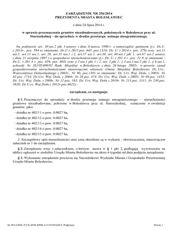 ZARZĄDZENIE NR 256/2014 PREZYDENTA MIASTA BOLESŁAWIEC z dnia 24 lipca 2014 r. w sprawie przeznaczenia gruntów niezabudowanych, położonych w Bolesławcu przy ul. Staroszkolnej – do sprzedaży w drodze przetargu ustnego nieograniczonego. Na podstawie art. 30 ust.2 pkt 3 ustawy z dnia 8 marca 1990 r. o samorządzie gminnym (j.t. Dz.U. z 2013r., poz. 594 ze zmianami; Dz.U.z 2013 poz. 645, poz.1318; Dz. U. z 2014 r. poz. 379) oraz art.11 ust.1, art.13 ust.1, art. 28, art.35 ust.1 i 2, art.37 ust.1, art.38, art. 40 ust.1 pkt 1, art.67 ust.2 ustawy z dnia 21 sierpnia 1997 r.o gospodarce nieruchomościami (j.t. Dz. U. z 201 4 r. poz. 51 8 ze zmianami : Dz.U. z 201 4 r. poz. 659, poz. 805) oraz § 2 ust.1 pkt 1 i 2, ust. 2 pkt 1, § 3 ust.1,ust.2 pkt 1, § 6 ust.1, uchwały Nr XLVII/400/02 Rady Miejskiej w Bolesławcu z dnia 26 lutego 2002r. w sprawie zasad gospodarowania nieruchomościami stanowiącymi własność Gminy Miejskiej Bolesławiec Dz. Urz.. Województwa Dolnośląskiego z 2002r., Nr 90, poz.1501 ze zmianami: Dz. Urz. Woj. Doln. z 2003r. Nr 83 poz. 1733; Dz.Urz. Woj. Doln. z 2004r. Nr 26 poz. 474; Dz. Urz. Woj. Doln. z 2005r. Nr 69 poz. 1453; Dz. Urz. Woj. Doln. z 2008r. Nr 12 poz. 193; Dz. Urz. Woj. Doln z 2010r. Nr 213 poz. 3311, Nr 230 poz. 3820; Dz.U.rz. Woj.Doln.z 2012r.poz.4622),zarządzam, co następuje: § 1. Przeznaczyć do sprzedaży w drodze przetargu ustnego nieograniczonego – nieruchomości gruntowe niezabudowane, położone w Bolesławcu przy ul. Staroszkolnej, oznaczone w ewidencji gruntów, jako: - działka nr 402/11 o pow. 0.0027 ha, - działka nr 402/12 o pow. 0.0027 ha, - działka nr 402/13 o pow. 0.0027 ha, - działka nr 402/14 o pow. 0.0027 ha, - działka nr 402/15 o pow. 0.0027 ha, 2. Szczegółowy opis nieruchomości oraz cena określone są w wykazie - obwieszczeniu, stanowiącym załacznik nr 1 do zarządzenia. § 2. Zarządzenie wraz z załacznikiem, o którym mowa w § 1 pkt 2, podlegają wywieszeniu na tablicy ogłoszeń w siedzibie Urzędu Miasta Bolesławiec na okres 6 tygodni od dnia podjęcia zarządzenia. § 3. Wykonanie zarządzenia powierza się Naczelnikowi Wydziału Mienia i Gospodarki Przestrzennej Urzędu Miasta Bolesławiec. Id: 061A204C-E376-4E94-809B-A1318350ADC9. Podpisany Strona 1 § 4. Zarządzenie wchodzi w życie z dniem podjęcia. I Zastępca Prezydenta Miasta Iwona Mandżuk - Dudek Id: 061A204C-E376-4E94-809B-A1318350ADC9. Podpisany Strona 2 Załącznik Nr 1 do Zarządzenia Nr 256/2014 Prezydenta Miasta Bolesławiec z dnia 24 lipca 2014 r. WYKAZ–OBWIESZCZENIE działek niezabudowanych, przewidzianych do sprzedaży w drodze przetargu ustnego nieograniczonego – z przeznaczeniem pod zabudowę garażową. 1. ul. Staroszkolna – działka niezabudowana nr 402/11 o pow. 0.0027 ha, AM 05, obręb 10, o użytku Bp. Cena gruntu (brutto ) wynosi – 6.000 zł – wywoławcza do przetargu 2. ul. Staroszkolna – działka niezabudowana nr 402/12 o pow. 0.0027 ha, AM 05, obręb 10, o użytku Bp. Cena gruntu (brutto) wynosi – 6.500 zł – wywoławcza do przetargu 3. ul. Staroszkolna – działka niezabudowana nr 402/13 o pow. 0.0027 ha, AM 05, obręb 10, o użytku Bp. Cena gruntu (brutto ) wynosi – 6.500 zł – wywoławcza do przetargu 4. ul. Staroszkolna – działka niezabudowana nr 402/14 o pow. 0.0027 ha, AM 05, obręb 10, o użytku Bp. Cena gruntu (brutto) wynosi – 7.500 zł – wywoławcza do przetargu 5. ul. Staroszkolma – działka niezabudowana nr 402/15 o pow. 0.0027 ha, AM 05, obręb 10, o użytku Bp. Cena gruntu (brutto ) wynosi – 7.500 zł – wywoławcza do przetargu W cenę gruntu wliczony jest należny podatek od towarów i usług według stawki aktualnej, obecnie 23%. Cena osiągnięta w przetargu, płatna będzie w całości przed zawarciem umowy notarialnej. 1.Działki położone są w odległości około 1300 m w linii prostej w kierunku północno-wschodnim od Rynku. W bezpośrednim otoczeniu nieruchomości znajduje się zabudowa o charakterze komercyjnym, ogródki działkowe, garaże. Dojazd uregulowany prawnie, drogą nieurządzoną. 2. W miejscowym planie zagospodarowania przestrzennego miasta Bolesławiec uchwalonym przez Radę Miasta Bolesławiec uchwałą nr VI/43/07 z dnia 14 marca 2007 r. – działki przeznaczone pod tereny obsługi komunikacji - symbol z planu C-KS4 . 3. Nabywca zobowiązany jest zapoznać się w terenie ze stanem zagospodarowania działki oraz na własny koszt uporządkować teren i przygotować go do zabudowy. 4. Działki wpisane są w księdze wieczystej KW nr JG1B/00014860/7 – założonej dla obrębu 10 prowadzonej przez V Wydział Ksiąg Wieczystych Sądu Rejonowego w Bolesławcu, bez obciążeń na rzecz osób trzecich. 5. Termin do złożenia wniosku przez osoby, którym przysługuje pierwszeństwo w nabyciu nieruchomości z odrębnych przepisów niż określone w niniejszym zarządzeniu, tj. na podstawie art. 34 ust.1 pkt 1 i pkt 2 ustawy o gospodarce nieruchomościami, upływa w dniu 5 września 2014r. Id: 061A204C-E376-4E94-809B-A1318350ADC9. Podpisany Strona 1 6. Informacja o przetargu oraz warunki przetargu zostaną podane do publicznej wiadomości po sześciu tygodniach od daty podpisania zarządzenia i wywieszenia niniejszego wykazu na tablicy ogłoszeń w siedzibie Urzędu Miasta Bolesławiec. I Zastępca Prezydenta Miasta Iwona Mandżuk - Dudek Id: 061A204C-E376-4E94-809B-A1318350ADC9. Podpisany Strona 2 Załącznik nr 2 do zarządzenia Prezydenta Miasta Bolesławiec Nr ……../2014 z dnia ………………………………… 2014 r. Id: 061A204C-E376-4E94-809B-A1318350ADC9. Podpisany Strona 3 UZASADNIENIE Zgodnie z uchwałą NR XL VII/400/02 Rady Miejskiej w Bolesławcu z dnia 26 lutego 2002 r. w sprawie zasad gospodarowania nieruchomościami stanowiącymi własność Gminy Miejskiej Bolesławiec, Prezydent Miasta Bolesławiec postanawia przeznaczyć do sprzedaży w drodze przetargu ustnego nieograniczonego - niezabudowane działki: nr 402/11, nr 402/12, nr 4