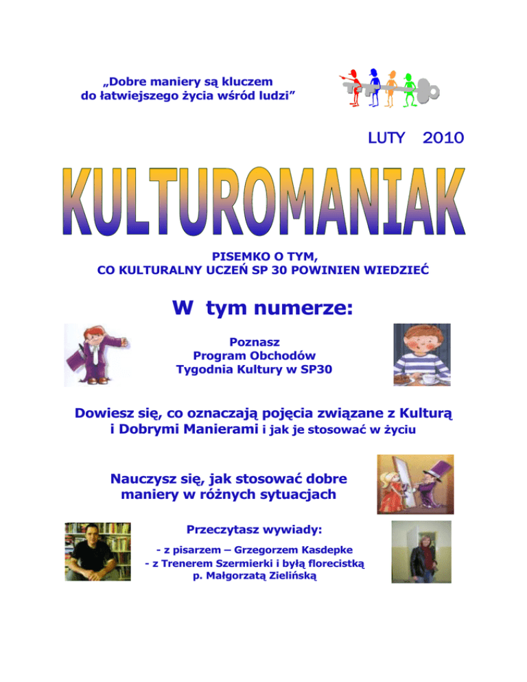 „Dobre maniery są kluczem do łatwiejszego życia wśród ludzi” LUTY 2010 PISEMKO O TYM, CO KULTURALNY UCZEŃ SP 30 POWINIEN WIEDZIEĆ W tym numerze: Poznasz Program Obchodów Tygodnia Kultury w SP30 Dowiesz się, co oznaczają pojęcia związane z Kulturą i Dobrymi Manierami i jak je stosować w życiu Nauczysz się, jak stosować dobre maniery w różnych sytuacjach Przeczytasz wywiady: - z pisarzem – Grzegorzem Kasdepke - z Trenerem Szermierki i byłą florecistką p. Małgorzatą Zielińską Znajdziesz „grzeczne” wierszyki Poznasz Kodeks sportowca i kibica SP30 Słowo wstępne Z wielką radością przekazujemy w Wasze ręce kolejny numer „Kulturomaniaka”. Tym razem ukazuje się on w zaplanowanym na początku tego roku szkolnego: „Tygodniu Kultury”. Mamy nadzieję, że przygotowane przez nas materiały pozwolą wszystkim bardzo dokładnie poznać zasady savoir-vivre’u i zachęcą uczniów SP30 do stosowania ich w praktyce. Liczymy na życzliwość i współpracę wszystkich nauczycieli oraz pracowników naszej szkoły, uczniów i ich rodziców. Chcemy, by bon ton był dla nas wszystkich sprawą ważną. Zależy nam na dobrej atmosferze pracy i nauki. Liczymy na Wasze zainteresowanie. Mamy nadzieję, że wspólnie z wychowawcą przeczytacie Kulturomaniaka „od deski do deski.” Chcielibyśmy także poznać Wasze opinie na poruszane przez nas tematy, zachęcić Was do refleksji i stałego podnoszenia poziomu kultury osobistej. Życzymy miłej lektury Redakcja Program Obchodów Tygodnia Kultury w SP30 Każdego dnia od poniedziałku (8 lutego ) do piątku (12 lutego) od godz. 7.45 do 16.00 w holu na parterze możecie: zapoznać się z informacjami związanymi z tematyką dnia, obejrzeć przygotowaną ekspozycję (np. zobaczyć jak powinien być ubrany uczeń naszej szkoły na co dzień, jak ma wyglądać jego miejsce pracy, czy też jak nakryć do stołu, gdy przychodzą goście), dopytać o szczegóły dyżurujących kolegów, umówić klasę na krótką lekcję dobrych manier, otrzymać wybrane materiały tekstowe, uczestniczyć w konkursach wiedzy dotyczącej dobrych manier, zdobyć tytuł „COOL…turomaniaka SP30 (na długich przerwach). Ponadto w wybrane dni będziecie mogli: poznać tajniki sukcesu najlepszych uczniów SP30 z I sem. 2009/10, porozmawiać z ubiegłorocznymi zdobywcami tytułu „Mistrza Dobrych Manier”, uczestniczyć w wybranych warsztatach (cyrkowym, teatralnym, tanecznym, dotyczącym pięknego składania serwetek i wykonywania papierowych ozdób oraz atrakcyjnego pakowania prezentów), obejrzeć krótką scenkę prezentującą stosowanie zasad savoir vivre’u w praktyce („z przymrużeniem oka”) - na podstawie książki Grzegorza Kasdepke: „Bon czy ton, czyli savoir-vivre dla dzieci, poznać laureatów konkursu dotyczącego znajomości i stosowania zasad fair play w sporcie, poznać tegorocznego Mistrza Fair Play naszej szkoły. Tematyka poszczególnych dni: Poniedziałek – Wprowadzenie - „Dbałość o całość”, czyli: zwroty grzecznościowe (powitanie na poziomie, pożegnanie „z klasą”, czarodziejskie „proszę, tajemnicze „dziękuję”), definicje pojęć – konwenanse, savoir-vivre, kurtuazja, bon ton, etykieta, maniery, zachęcanie do porządku. Wtorek - Dzień szkolny – „Sztuka kucia i nie tylko”, czyli: recepta na bycie prawdziwym kolegą, przyjacielem, dobrym uczniem i człowiekiem. Środa – Zachowanie przy stole – „Etykieta stołowa”, czyli: sposób nakrywania do posiłków, dekoracja stołu, mowa sztućców, zachowanie wobec gości. Czwartek – Szczególne miejsca kultury – „Sztuka z wiktem”, czyli: zachowanie w kinie, teatrze, na koncercie w filharmonii, obdarowanie prezentem, kwiatami, przyjmowanie prezentów, zwracanie uwagi na punktualność. Piątek – Sport i bon ton – „Zawody czystej wody”, czyli: fair play w sporcie, dbanie o bezpieczeństwo na lekcjach gimnastyki, na boisku i na ulicy.