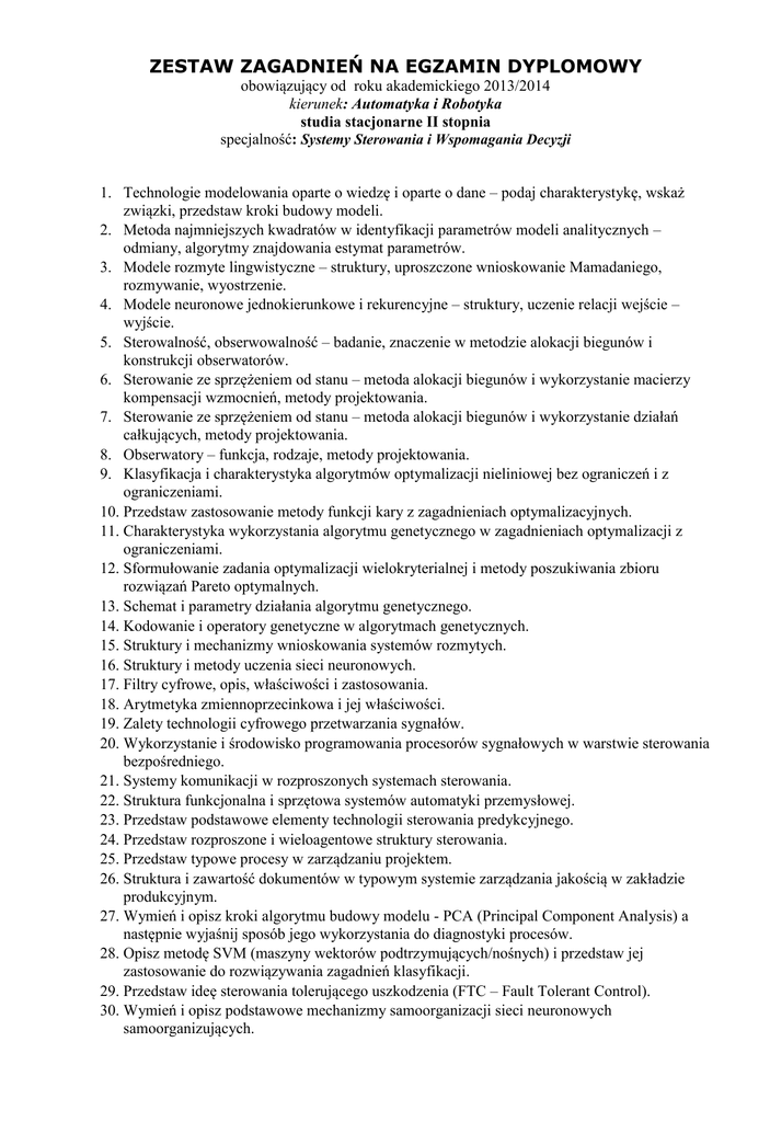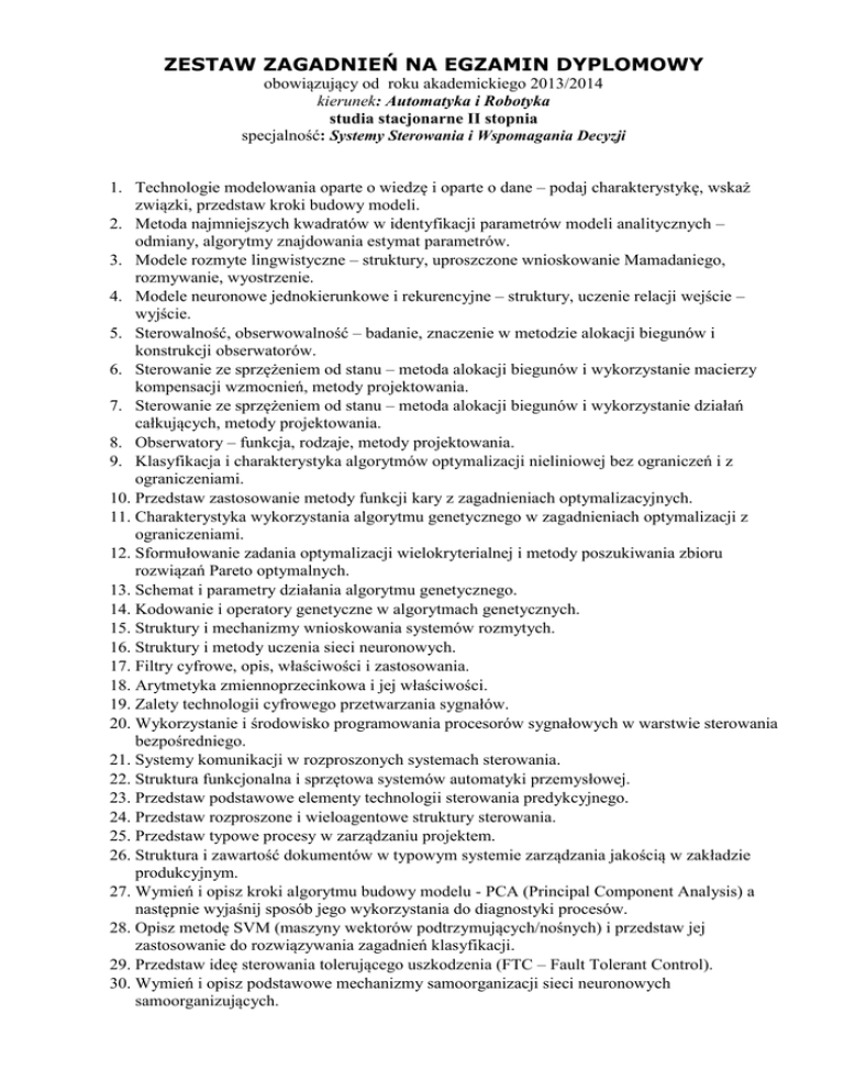 ZESTAW ZAGADNIEŃ NA EGZAMIN DYPLOMOWY obowiązujący od roku akademickiego 2013/2014 kierunek: Automatyka i Robotyka studia stacjonarne II stopnia specjalność: Systemy Sterowania i Wspomagania Decyzji 1. Technologie modelowania oparte o wiedzę i oparte o dane – podaj charakterystykę, wskaż związki, przedstaw kroki budowy modeli. 2. Metoda najmniejszych kwadratów w identyfikacji parametrów modeli analitycznych – odmiany, algorytmy znajdowania estymat parametrów. 3. Modele rozmyte lingwistyczne – struktury, uproszczone wnioskowanie Mamadaniego, rozmywanie, wyostrzenie. 4. Modele neuronowe jednokierunkowe i rekurencyjne – struktury, uczenie relacji wejście – wyjście. 5. Sterowalność, obserwowalność – badanie, znaczenie w metodzie alokacji biegunów i konstrukcji obserwatorów. 6. Sterowanie ze sprzężeniem od stanu – metoda alokacji biegunów i wykorzystanie macierzy kompensacji wzmocnień, metody projektowania. 7. Sterowanie ze sprzężeniem od stanu – metoda alokacji biegunów i wykorzystanie działań całkujących, metody projektowania. 8. Obserwatory – funkcja, rodzaje, metody projektowania. 9. Klasyfikacja i charakterystyka algorytmów optymalizacji nieliniowej bez ograniczeń i z ograniczeniami. 10. Przedstaw zastosowanie metody funkcji kary z zagadnieniach optymalizacyjnych. 11. Charakterystyka wykorzystania algorytmu genetycznego w zagadnieniach optymalizacji z ograniczeniami. 12. Sformułowanie zadania optymalizacji wielokryterialnej i metody poszukiwania zbioru rozwiązań Pareto optymalnych. 13. Schemat i parametry działania algorytmu genetycznego. 14. Kodowanie i operatory genetyczne w algorytmach genetycznych. 15. Struktury i mechanizmy wnioskowania systemów rozmytych. 16. Struktury i metody uczenia sieci neuronowych. 17. Filtry cyfrowe, opis, właściwości i zastosowania. 18. Arytmetyka zmiennoprzecinkowa i jej właściwości. 19. Zalety technologii cyfrowego przetwarzania sygnałów. 20. Wykorzystanie i środowisko programowania procesorów sygnałowych w warstwie sterowania bezpośredniego. 21. Systemy komunikacji w rozproszonych systemach sterowania. 22. Struktura funkcjonalna i sprzętowa systemów automatyki przemysłowej. 23. Przedstaw podstawowe elementy technologii sterowania predykcyjnego. 24. Przedstaw rozproszone i wieloagentowe struktury sterowania. 25. Przedstaw typowe procesy w zarządzaniu projektem. 26. Struktura i zawartość dokumentów w typowym systemie zarządzania jakością w zakładzie produkcyjnym. 27. Wymień i opisz kroki algorytmu budowy modelu - PCA (Principal Component Analysis) a następnie wyjaśnij sposób jego wykorzystania do diagnostyki procesów. 28. Opisz metodę SVM (maszyny wektorów podtrzymujących/nośnych) i przedstaw jej zastosowanie do rozwiązywania zagadnień klasyfikacji. 29. Przedstaw ideę sterowania tolerującego uszkodzenia (FTC – Fault Tolerant Control). 30. Wymień i opisz podstawowe mechanizmy samoorganizacji sieci neuronowych samoorganizujących. 31. Wymień i opisz kroki algorytmu budowy modelu Kernel PCA (Kernel Principal Component Analysis). Porównaj metodę Kernel PCA z metodą PCA. 32. Przedstaw hierarchiczny warstwowy model komputerowego systemu sterowania, scharakteryzuj poszczególne warstwy tego modelu i zaproponuj jego realizację sprzętowo – programową. 33. Przedstaw proces budowy zdecentralizowanego rozproszonego komputerowego systemu sterowania automatycznego. 34. Przedstaw jeden z możliwych sposobów realizacji regulatora predykcyjnego w komputerowym systemie sterowania. 35. Przedstaw zadania systemu wspomagania decyzji i możliwy model jego współpracy z komputerowym systemem sterowania automatycznego. 36. Przedstaw realizację algorytmu Dantzig’a – Wolfe’a w hierarchicznym systemie wspomagania decyzji. 37. Przedstaw obszary zastosowania i opisz technologię sterowania ślizgowego. 38. Przedstaw obszary zastosowania i opisz technologię sterowania z nieliniowym tłumieniem. 39. Przedstaw obszary zastosowania i opisz technologię sterowania w oparciu o linearyzację przez sprzężenie zwrotne dla obiektów deterministycznych oraz z niepewnością. 40. Przedstaw filtr Kalmana i opisz jego zastosowanie w strukturach sterowania. 41. Przedstaw sterowanie inteligentne z wykorzystaniem dynamicznych sieci neuronowych oraz systemów rozmytych Takagi-Sugeno. 42. Proces decyzyjny – przedstaw czym jest i scharakteryzuj jego niezbędne elementy; System wspomagania decyzji – funkcje, idee działania, możliwe elementy architektury. 43. Wieloatrybutowe zagadnienia decyzyjne – charakterystyka i wybrana metoda rozwiązywania. 44. Analizy wrażliwości w zagadnieniach decyzyjnych na przykładzie zagadnień liniowych – cele, przykłady możliwości realizacji. 45. Wielocelowe zagadnienia decyzyjne – algorytmy rozwiązywania z uwzględnieniem przyjętego porządku Pareto. 46. Wielocelowe zagadnienia decyzyjne – algorytmy rozwiązywania z uwzględnieniem przyjętego porządku leksykograficznego. 47. Wyjaśnij pojęcia i podaj przykłady zastosowania predykatu, reguły produkcji, reguły decyzyjnej oraz klauzuli. 48. Wymień i opisz podstawowe metody wnioskowania dedukcyjnego na podstawie faktów oraz na podstawie celów. 49. Przedstaw i opisz podstawową strukturę systemu ekspertowego. 50. Wymień i opisz podstawowe kroki algorytmu roju cząstek.