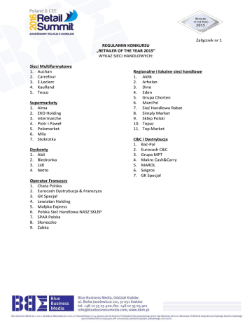 Załącznik nr 1 REGULAMIN KONKURSU „RETAILER OF THE YEAR 2015” WYKAZ SIECI HANDLOWYCH: Sieci Multiformatowe 1. Auchan 2. Carrefour 3. E.Leclerc 4. Kaufland 5. Tesco Supermarkety 1. Alma 2. EKO Holding 3. Intermarche 4. Piotr i Paweł 5. Polomarket 6. Mila 7. Stokrotka Dyskonty 1. Aldi 2. Biedronka 3. Lidl 4. Netto Operator Franczyzy 1. Chata Polska 2. Eurocash Dystrybucja & Franszyza 3. GK Specjał 4. Lewiatan Holding 5. Małpka Express 6. Polska Sieć Handlowa NASZ SKLEP 7. SPAR Polska 8. Słoneczko 9. Żabka Regionalne i lokalne sieci handlowe 1. Aldik 2. Arhelan 3. Dino 4. Eden 5. Grupa Chorten 6. MarcPol 7. Sieć Handlowa Rabat 8. Simply Market 9. Sklep Polski 10. Topaz 11. Top Market C&C i Dystrybucja 1. Bać-Pol 2. Eurocash C&C 3. Grupa MPT 4. Makro Cash&Carry 5. MAROL 6. Selgros 7. GK Specjał