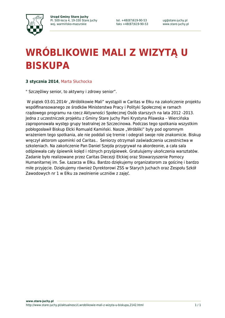 Urząd Gminy Stare Juchy Pl. 500-lecia 4, 19-330 Stare Juchy woj. warmińsko-mazurskie tel. +48(87)619-90-53 faks +48(87)619-90-53 [email protected] www.stare-juchy.pl WRÓBLIKOWIE MALI Z WIZYTĄ U BISKUPA 3 stycznia 2014, Marta Słuchocka " Szczęśliwy senior, to aktywny i zdrowy senior”. W piątek 03.01.2014r „Wróblikowie Mali” wystąpili w Caritas w Ełku na zakończenie projektu współfinansowanego ze środków Ministerstwa Pracy i Polityki Społecznej w ramach rządowego programu na rzecz Aktywności Społecznej Osób starszych na lata 2012 -2013. Jedna z uczestniczek projektu z Gminy Stare Juchy Pani Krystyna Pilawska – Wiercińska zaproponowała występ grupy teatralnej ze Szczecinowa. Podczas tego spotkania wszystkim pobłogosławił Biskup Ełcki Romuald Kamiński. Nasze „Wróbliki” były pod ogromnym wrażeniem tego spotkania, ale nie poddali się tremie i odegrali swoje role znakomicie. Biskup wręczył aktorom upominki od Caritas.. Seniorzy otrzymali zaświadczenia uczestnictwa w szkoleniach. Na zakończenie Pan Daniel Szejda przygrywał na akordeonie, a cała sala odśpiewała cały śpiewnik kolęd i różnych przyśpiewek. Gratulujemy ukończenia warsztatów. Zadanie było realizowane przez Caritas Diecezji Ełckiej oraz Stowarzyszenie Pomocy Humanitarnej im. Św. Łazarza w Ełku. Bardzo dziękujemy organizatorom za gościnę i bardzo miłe przyjęcie. Dziękujemy również Dyrektorowi ZSS w Starych Juchach oraz Zespołu Szkół Zawodowych nr 1 w Ełku za zwolnienie uczniów z zajęć. www.stare-juchy.pl http://www.stare-juchy.pl/aktualnosci/i,wroblikowie-mali-z-wizyta-u-biskupa,2142.html 1/1
