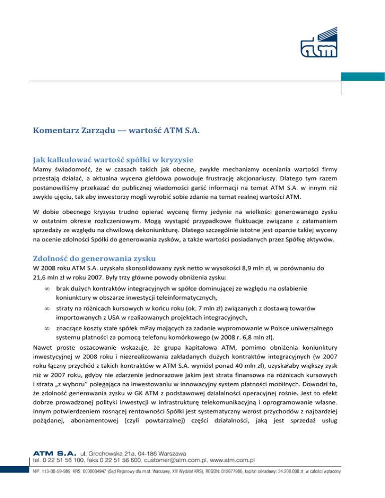 Komentarz Zarządu — wartość ATM S.A. Jak kalkulować wartość spółki w kryzysie Mamy świadomość, że w czasach takich jak obecne, zwykłe mechanizmy oceniania wartości firmy przestają działać, a aktualna wycena giełdowa powoduje frustrację akcjonariuszy. Dlatego tym razem postanowiliśmy przekazać do publicznej wiadomości garść informacji na temat ATM S.A. w innym niż zwykle ujęciu, tak aby inwestorzy mogli wyrobić sobie zdanie na temat realnej wartości ATM. W dobie obecnego kryzysu trudno opierać wycenę firmy jedynie na wielkości generowanego zysku w ostatnim okresie rozliczeniowym. Mogą wystąpić przypadkowe fluktuacje związane z załamaniem sprzedaży ze względu na chwilową dekoniunkturę. Dlatego szczególnie istotne jest oparcie takiej wyceny na ocenie zdolności Spółki do generowania zysków, a także wartości posiadanych przez Spółkę aktywów. Zdolność do generowania zysku W 2008 roku ATM S.A. uzyskała skonsolidowany zysk netto w wysokości 8,9 mln zł, w porównaniu do 21,6 mln zł w roku 2007. Były trzy główne powody obniżenia zysku: • brak dużych kontraktów integracyjnych w spółce dominującej ze względu na osłabienie koniunktury w obszarze inwestycji teleinformatycznych, • straty na różnicach kursowych w końcu roku (ok. 7 mln zł) związanych z dostawą towarów importowanych z USA w realizowanych projektach integracyjnych, • znaczące koszty stałe spółek mPay mających za zadanie wypromowanie w Polsce uniwersalnego systemu płatności za pomocą telefonu komórkowego (w 2008 r. 6,8 mln zł). Nawet proste oszacowanie wskazuje, że grupa kapitałowa ATM, pomimo obniżenia koniunktury inwestycyjnej w 2008 roku i niezrealizowania zakładanych dużych kontraktów integracyjnych (w 2007 roku łączny przychód z takich kontraktów w ATM S.A. wyniósł ponad 40 mln zł), uzyskałaby większy zysk niż w 2007 roku, gdyby nie zdarzenie jednorazowe jakim jest strata finansowa na różnicach kursowych i strata „z wyboru” polegająca na inwestowaniu w innowacyjny system płatności mobilnych. Dowodzi to, że zdolność generowania zysku w GK ATM z podstawowej działalności operacyjnej rośnie. Jest to efekt dobrze prowadzonej polityki inwestycji w infrastrukturę telekomunikacyjną i oprogramowanie własne. Innym potwierdzeniem rosnącej rentowności Spółki jest systematyczny wzrost przychodów z najbardziej pożądanej, abonamentowej (czyli powtarzalnej) części działalności, jaką jest sprzedaż usług telekomunikacyjnych. Przychody te stabilnie rosną z kwartału na kwartał, a ich przyrost w czwartym kwartale 2008 r. o 3,3 mln zł w stosunku do kwartału poprzedniego był rekordowy w historii firmy. Przegląd głównych aktywów ATM S.A., jak to wielokrotnie podkreślaliśmy, prowadzi swoją działalność w oparciu o cenny majątek trwały, którego wartość jeszcze nie w pełni odzwierciedlona jest w osiąganych zyskach operacyjnych. Tym niemniej wartość tego majątku, nawet pomniejszona o „dyskonto” związane z kryzysem, powinna stanowić fundament wyceny ATM. Obecnie znacznie przewyższa ona kapitalizację giełdową Spółki. Ogólnopolska szerokopasmowa sieć światłowodowa ATMAN W latach 2007–2008 zainwestowaliśmy znaczne środki w rozbudowę naszej sieci światłowodowej, podłączając do naszej sieci między innymi 300 km nowych światłowodów w miastach. Znaczenie sieci światłowodowych w świecie rośnie, ponieważ wraz z rozwojem technologii rośnie gwałtownie zapotrzebowanie na usługi szerokopasmowe. ATM ma jedną z największych miejskich sieci światłowodowych w Polsce — w 7 aglomeracjach łącznie około 580 km tras (ponad 16 tys. km par włókien). Na podstawie znanych transakcji rynkowych oceniamy, że potencjalna cena sprzedaży całej sieci światłowodowej — biorąc nawet pod uwagę aktualną dekoniunkturę — znacznie przekracza sumę 200 mln zł. Centrum Danych ATMAN Drugim ważnym celem inwestycyjnym w minionym okresie była (i pozostaje nadal) rozbudowa serwerowni, czyli Centrum Danych ATMAN. Rosnący popyt na usługi kolokacji i hostingu, wyrażony w konkretnych zamówieniach klientów, stale wyprzedza podaż. Infrastruktura do świadczenia tego rodzaju usług obejmuje już powierzchnię blisko 1500 m2 serwerowni i jest stale zwiększana. Jej wartość można oszacować chociażby na podstawie inwestycji koniecznych do profesjonalnego wyposażenia serwerowni tego typu, co daje kwotę znacznie przekraczającą 30 mln zł. Trwa realizacja projektów rozbudowy CD ATMAN adekwatnie do zgłoszonego przez klientów zapotrzebowania na lata 2009–2010. W tym czasie przewidujemy zwiększyć oferowaną klientom powierzchnię serwerowni co najmniej trzykrotnie. Udziały w spółkach Grupy Kapitałowej ATM Warto też pamiętać o majątku wyrażonym w udziałach, jakie ATM S.A. posiada w spółkach grupy kapitałowej, a które nie zawsze przekładają się na aktualnie generowany i konsolidowany zysk. Największe z dokonanych inwestycji to: Linx Telecommunications B.V. (63,5 mln zł), KLK S.A. (15,1 mln zł), Impulsy Sp. z o.o. (3,8 mln zł), Sputnik Software Sp. z o.o. (3,5 mln zł). Od momentu nabycia udziałów przez ATM, wyżej wymienione spółki znacznie powiększyły swoje przychody i zwielokrotniły zyski. Według naszej oceny, sumaryczna wartość tych aktywów w „normalnych czasach” znacznie by wzrosła, ale nawet w czasach dekoniunktury zapewne można ją oszacować jako przekraczającą wydatkowaną sumę 86 mln zł. 2 Dobrym przykładem jest inONE S.A. Spółka, która została utworzona w 2006 roku z udziałem ATM w wysokości 300 tys. zł. Drugi pełny rok działalności zamknęła przychodami ponad 10 mln zł i zyskiem netto ok. 0,9 mln zł. Jej aktualna wartość wielokrotnie przekracza zainwestowany kapitał. ATM S.A. zainwestowała także w spółki innowacyjne, takie jak mPay (łącznie 13,9 mln zł) oraz Cineman (0,5 mln zł) i iloggo (0,3 mln zł). S