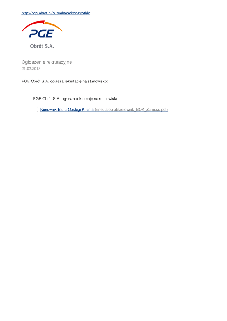 http://pge-obrot.pl/aktualnosci/wszystkie Ogłoszenie rekrutacyjne 21.02.2013 PGE Obrót S.A. ogłasza rekrutację na stanowisko: PGE Obrót S.A. ogłasza rekrutację na stanowisko: Kierownik Biura Obsługi Klienta (/media/obrot/kierownik_BOK_Zamosc.pdf)