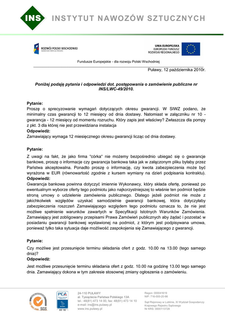 IN ST YTUT NAWO ZÓW SZ TUCZN YCH Fundusze Europejskie - dla rozwoju Polski Wschodniej __________________________________________________________________________________________ Puławy, 12 października 2010r. Poniżej podaję pytania i odpowiedzi dot. postępowania o zamówienie publiczne nr INS/LWC-49/2010. Pytanie: Proszę o sprecyzowanie wymagań dotyczących okresu gwarancji. W SIWZ podano, że minimalny czas gwarancji to 12 miesięcy od dnia dostawy. Natomiast w załączniku nr 10 gwarancja - 12 miesięcy od momentu rozruchu. Który zapis jest właściwy? Zwłaszcza dla pompy z pkt. 3 dla której nie jest przewidziana instalacja Odpowiedź: Zamawiający wymaga 12 miesięcznego okresu gwarancji licząc od dnia dostawy. Pytanie: Z uwagi na fakt, że jako firma "córka" nie możemy bezpośrednio ubiegać się o gwarancje bankowe, proszę o informacje czy gwarancja bankowa taka jak w załączonym pliku byłaby przez Państwa akceptowalna. Ponadto proszę o informację, czy kwota zabezpieczenia może być wyrażona w EUR (równowartość zgodnie z kursem wymiany na dzień podpisania kontraktu). Odpowiedź: Gwarancja bankowa powinna dotyczyć imiennie Wykonawcy, który składa ofertę, ponieważ po ewentualnym wyborze oferty tego podmiotu jako najkorzystniejszej to właśnie ten podmiot będzie stroną umowy o udzielenie zamówienia publicznego. Dlatego jeżeli podmiot nie może z jakichkolwiek względów uzyskać samodzielnie gwarancji bankowej, która dotyczyłaby zabezpieczenia roszczeń Zamawiającego względem tego podmiotu oznacza to, że nie jest możliwe spełnienie warunków zawartych w Specyfikacji Istotnych Warunków Zamówienia. Zamawiający jest zobligowany przepisami Prawa Zamówień publicznych aby żądać i pozostać w posiadaniu gwarancji bankowej wystawionej na podmiot, z którym jest podpisywana umowa, ponieważ tylko taka sytuacja daje możliwość zaspokojenia się Zamawiającego z gwarancji. Pytanie: Czy możliwe jest przesunięcie terminu składania ofert z godz. 10.00 na 13.00 (tego samego dnia)? Odpowiedź: Jest możliwe przesunięcie terminu składania ofert z godz. 10.00 na godzinę 13.00 tego samego dnia. Zamawiający dokona w tym zakresie stosownej zmiany ogłoszenia o zamówieniu. 24-110 PUŁAWY al. Tysiąclecia Państwa Polskiego 13A tel.: 48(81) 473 14 00, fax: 48(81) 473 14 10 e-mail: [email protected] www.ins.pulawy.pl Regon: 000041619 NIP: 716-000-20-98 Sąd Rejonowy w Lublinie, XI Wydział Gospodarczy Krajowego Rejestru Sądowego Nr KRS: 0000113728 IN ST YTUT NAWO ZÓW SZ TUCZN YCH Fundusze Europejskie - dla rozwoju Polski Wschodniej __________________________________________________________________________________________ Pytanie: Odnośnie umowy - pkt 6.3 i 6.4 mówią o dwóch różnych czasach na usunięcie usterki gwarancyjnej. Proszę o zweryfikowanie tej rozbieżności i skorygowanie projektu umowy. Odpowiedź: Odnośnie treści umowy w zakresie pkt 6.3 i 6.4. W treści umowy nie zostały zapisane dwa różne okresy na usunięcie usterki gwarancyjnej, w tych dwu punktach umowy są uregulowane dwa różne stany prawne. W pkt 6.3 została szczegółowo opisana procedura usuwania usterki i określony został okres, w jakim Dostawca jest obowiązany usunąć usterkę (10 dni od dnia zgłoszenia usterki), natomiast w pkt 6.4 wskazane zostały konsekwencje nie przystąpienia Dostawcy do usuwania usterki po zawiadomieniu Dostawcy (7 dni od powiadomienia). Innymi słowy w pkt. 6.3 został wskazany okres na usunięcie usterki oraz regulacje dotyczące obowiązku Dostawcy zamiany wadliwej części w przypadku bezskutecznego usuwania usterki, a w pkt 6.4 umowy okres po jakim bezskuteczność w zakresie przystąpienia do usuwania usterki przez Dostawcę uprawnia Zamawiającego do usunięcia usterki na koszt Dostawcy przez osobę trzecią bez utraty uprawnień z tytułu gwarancji . Jolanta Kobus Przewodnicząca Komisji Przetargowej 24-110 PUŁAWY al. Tysiąclecia Państwa Polskiego 13A tel.: 48(81) 473 14 00, fax: 48(81) 473 14 10 e-mail: [email protected] www.ins.pulawy.pl Regon: 000041619 NIP: 716-000-20-98 Sąd Rejonowy w Lublinie, XI Wydział Gospodarczy Krajowego Rejestru Sądowego Nr KRS: 0000113728