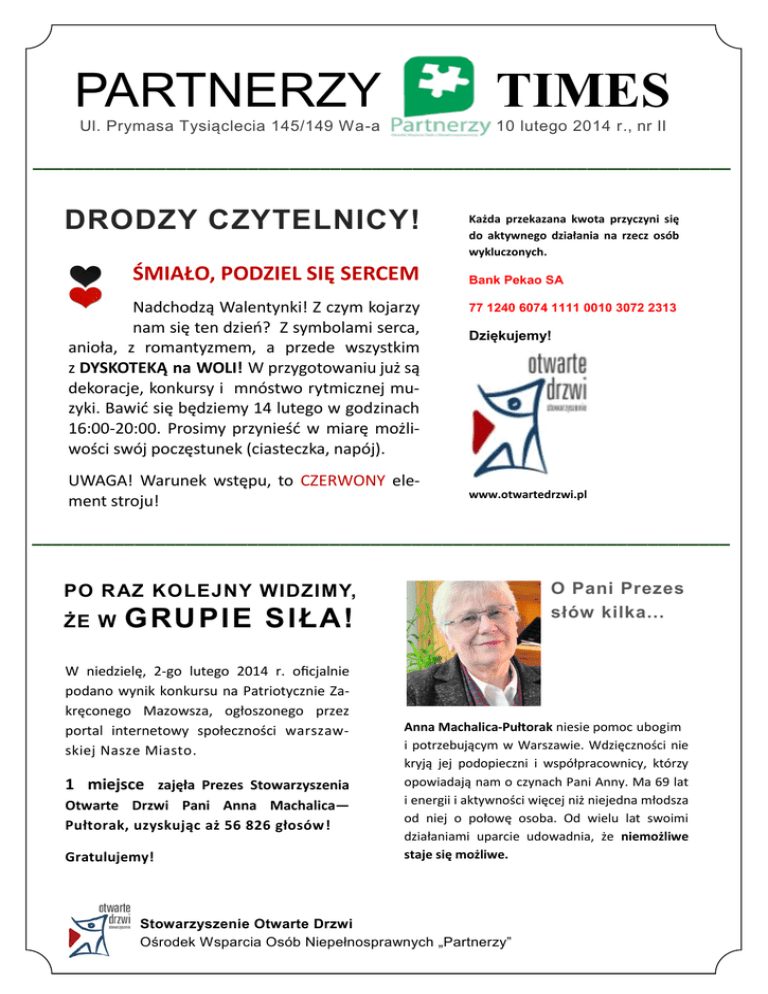 PARTNERZY TIMES Ul. Prymasa Tysiąclecia 145/149 Wa-a 10 lutego 2014 r., nr II ____________________________________________________________________ DRODZY CZYTELNICY! ŚMIAŁO, PODZIEL SIĘ SERCEM Nadchodzą Walentynki! Z czym kojarzy nam się ten dzień? Z symbolami serca, anioła, z romantyzmem, a przede wszystkim z DYSKOTEKĄ na WOLI! W przygotowaniu już są dekoracje, konkursy i mnóstwo rytmicznej muzyki. Bawić się będziemy 14 lutego w godzinach 16:00-20:00. Prosimy przynieść w miarę możliwości swój poczęstunek (ciasteczka, napój). UWAGA! Warunek wstępu, to CZERWONY element stroju! Każda przekazana kwota przyczyni się do aktywnego działania na rzecz osób wykluczonych. Bank Pekao SA 77 1240 6074 1111 0010 3072 2313 Dziękujemy! www.otwartedrzwi.pl ____________________________________________________________________ O Pani Prezes słów kilka... PO RAZ KOLEJNY WIDZIMY, ŻE W GRUPIE SIŁA! W niedzielę, 2-go lutego 2014 r. oficjalnie podano wynik konkursu na Patriotycznie Zakręconego Mazowsza, ogłoszonego przez portal internetowy społeczności warszawskiej Nasze Miasto. 1 miejsce zajęła Prezes Stowarzyszenia Otwarte Drzwi Pani Anna Machalica— Pułtorak, uzyskując aż 56 826 głosów! Gratulujemy! Anna Machalica-Pułtorak niesie pomoc ubogim i potrzebującym w Warszawie. Wdzięczności nie kryją jej podopieczni i współpracownicy, którzy opowiadają nam o czynach Pani Anny. Ma 69 lat i energii i aktywności więcej niż niejedna młodsza od niej o połowę osoba. Od wielu lat swoimi działaniami uparcie udowadnia, że niemożliwe staje się możliwe. Stowarzyszenie Otwarte Drzwi Ośrodek Wsparcia Osób Niepełnosprawnych „Partnerzy” WICI Z PRACOWNI spróbować swoich sił w pracy z tabletem i stworzyć coś niezwykłego. Praca stałą się przyjemniejsza! PRACOWNIA KOMPUTEROWA Paulina Weber, Instruktor Pracowni Komputerowej W tym tygodniu zaprojektowaliśmy kartkę pocztową Soczi 2014. W imieniu uczestników naszego Ośrodka załączyliśmy życzenia wytrwałości, dużej ilości medali i zdrowego zawodnictwa dla sportowców, biorących udział w tegorocznych Igrzyskach. W pracowni pojawił się nowy sprzęt—tablet, za pomocą którego możemy obsługiwać programy komputerowe, rysować. Przyrząd ćwiczy naszą sprawność manualną i percepcję. Nowy sprzęt wywołał spore zainteresowanie, każdy mógł ____________________________________________________________________ Mamy Członków Rady Społeczności! Droga Społeczności, znamy już laureatów demokratycznych wyborów do Rady Społeczności naszego Ośrodka! Przewodniczącym został pan Artur Hantschel, Zastępcą Przewodniczącego pani Natalia Szymańska, a Skarbnikiem pani Ania Chmielak. Sprawy naszego Ośrodka będą w dobrych rękach! Gratulujemy! ____________________________________________________________________ smakołyki MARMOLAD A Z CEBULI z domowej spiżarni 4 białe cebule, 1 czerwona cebula ok. 50 ml octu balsamicznego, garść cukru Cebulę obierz i posiekaj drobno, wysyp na rozgrzany olej, smaż na małym palniku, mieszając. Gdy cebula jest miękka dolej ocet i dosyp cukru. Smaż, aż do całkowitego skarmelizowania się cukru. Marmoladę podawaj z pieczywem. _________________________ ________________________ Kadra w QADRZE Marta Kończak Dawno, dawno temu, w słynnym mieście Kopernika i pierników—w Toruniu, przyszła na świat Marta Kończak. Po długiej i krętej wędrówce po Polsce i Anglii, pani Marta trafiła do Warszawy. Szukając inspiracji do samorealizacji, trafiła na Stowarzyszenie Otwarte Drzwi. Początkowo była wolontariuszem. W 2008 roku wyjechała na swój pierwszy turnus rehabilitacyjny, na którym utwierdziła wszystkich w przekonaniu, że pasuje jak ulał do tej społeczności. Pani Marta zdała egzamin dojrzałości i została zatrudniona jako instruktor Pracowni Komputerowej w Ośrodku Partnerzy na Woli. Biorąc pod uwagę ogromne zaangażowanie w pracę i troskę o los uczestników, pani Marta objęła bardziej adekwatne dla siebie stanowisko Asystenta Osoby Niepełnosprawnej. Dziś pani Marta pracuje jako Organizator Pracy Socjalnej w naszym Ośrodku, codziennie wychodząc naprzeciw naszym problemom finansowym i mieszkaniowym. __________________________________________________ Kierownik Izabela Zabielska 609-762-749 e-mail: [email protected] www.partnerzy.otwartedrzwi.pl
