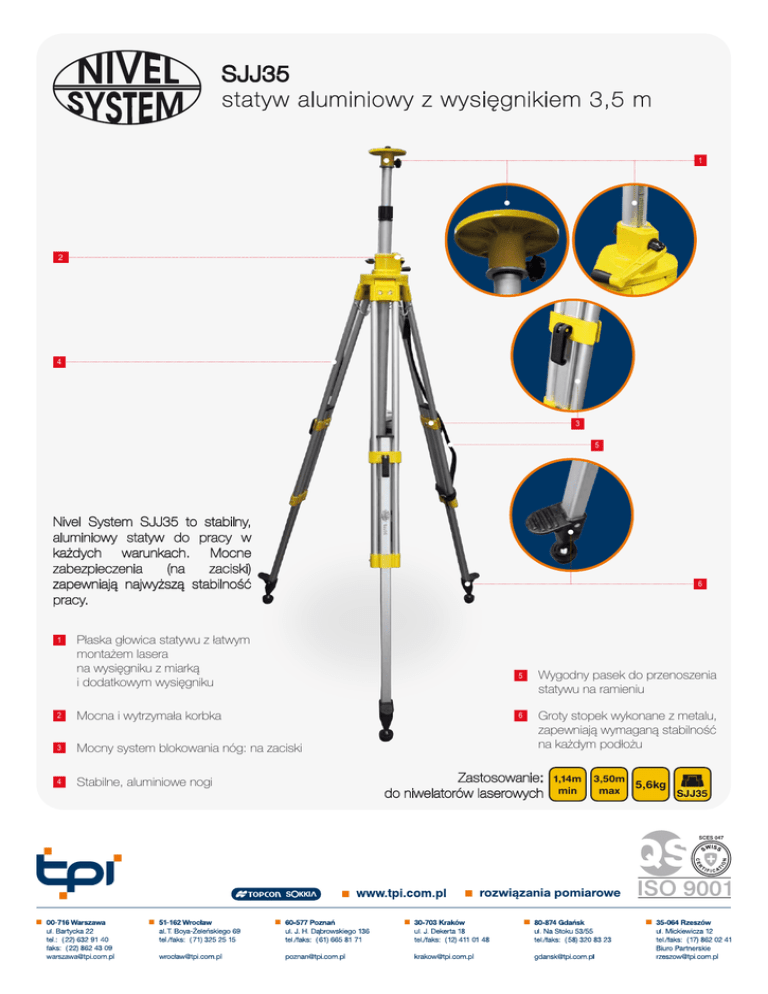 SJJ35 statyw aluminiowy z wysiêgnikiem 3,5 m 1 2 4 3 5 Nivel System SJJ35 to stabilny, aluminiowy statyw do pracy w ka¿dych warunkach. Mocne zabezpieczenia (na zaciski) zapewniaj¹ najwy¿sz¹ stabilnośæ pracy. 1 P³aska g³owica statywu z ³atwym monta¿em lasera na wysiêgniku z miark¹ i dodatkowym wysiêgniku 2 Mocna i wytrzyma³a korbka 3 Mocny system blokowania nóg: na zaciski 4 Stabilne, aluminiowe nogi 6 5 Wygodny pasek do przenoszenia statywu na ramieniu 6 Groty stopek wykonane z metalu, zapewniaj¹ wymagan¹ stabilnośæ na ka¿dym pod³o¿u Zastosowanie: do niwelatorów laserowych 1,14m min 3,50m max 5,6kg SJJ35