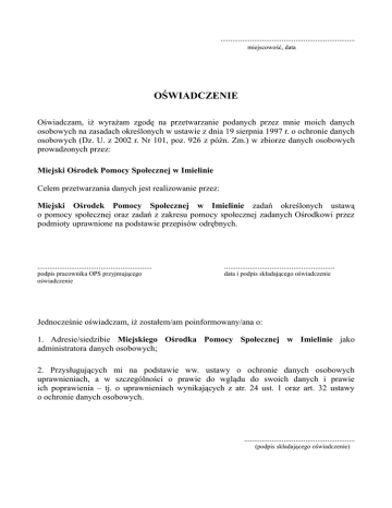 .................................................................... miejscowość, data OŚWIADCZENIE Oświadczam, iż wyrażam zgodę na przetwarzanie podanych przez mnie moich danych osobowych na zasadach określonych w ustawie z dnia 19 sierpnia 1997 r. o ochronie danych osobowych (Dz. U. z 2002 r. Nr 101, poz. 926 z późn. Zm.) w zbiorze danych osobowych prowadzonych przez: Miejski Ośrodek Pomocy Społecznej w Imielinie Celem przetwarzania danych jest realizowanie przez: Miejski Ośrodek Pomocy Społecznej w Imielinie zadań określonych ustawą o pomocy społecznej oraz zadań z zakresu pomocy społecznej zadanych Ośrodkowi przez podmioty uprawnione na podstawie przepisów odrębnych. .......................................................... ........................................................ podpis pracownika OPS przyjmującego oświadczenie data i podpis składającego oświadczenie Jednocześnie oświadczam, iż zostałem/am poinformowany/ana o: 1. Adresie/siedzibie Miejskiego Ośrodka Pomocy Społecznej w Imielinie jako administratora danych osobowych; 2. Przysługujących mi na podstawie ww. ustawy o ochronie danych osobowych uprawnieniach, a w szczególności o prawie do wglądu do swoich danych i prawie ich poprawienia – tj. o uprawnieniach wynikających z atr. 24 ust. 1 oraz art. 32 ustawy o ochronie danych osobowych. ........................................................ (podpis składającego oświadczenie)
