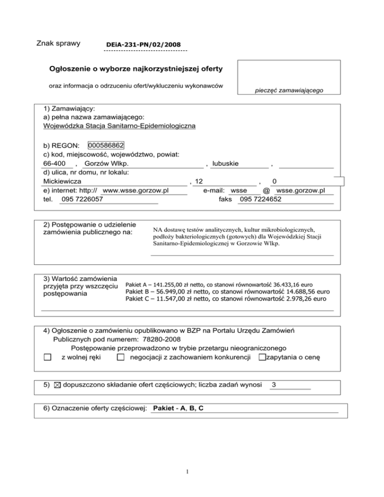Znak sprawy DEiA-231-PN/02/2008 Ogłoszenie o wyborze najkorzystniejszej oferty oraz informacja o odrzuceniu ofert/wykluczeniu wykonawców pieczęć zamawiającego 1) Zamawiający: a) pełna nazwa zamawiającego: Wojewódzka Stacja Sanitarno-Epidemiologiczna b) REGON: 000586862 c) kod, miejscowość, województwo, powiat: 66-400 , Gorzów Wlkp. d) ulica, nr domu, nr lokalu: Mickiewicza e) internet: http:// www.wsse.gorzow.pl tel. 095 7226057 2) Postępowanie o udzielenie zamówienia publicznego na: 3) Wartość zamówienia przyjęta przy wszczęciu postępowania , lubuskie , 12 , , 0 e-mail: wsse @ wsse.gorzow.pl faks 095 7224652 NA dostawę testów analitycznych, kultur mikrobiologicznych, podłoży bakteriologicznych (gotowych) dla Wojewódzkiej Stacji Sanitarno-Epidemiologicznej w Gorzowie Wlkp. Pakiet A – 141.255,00 zł netto, co stanowi równowartość 36.433,16 euro Pakiet B – 56.949,00 zł netto, co stanowi równowartość 14.688,56 euro Pakiet C – 11.547,00 zł netto, co stanowi równowartość 2.978,26 euro 4) Ogłoszenie o zamówieniu opublikowano w BZP na Portalu Urzędu Zamówień Publicznych pod numerem: 78280-2008 Postępowanie przeprowadzono w trybie przetargu nieograniczonego z wolnej ręki negocjacji z zachowaniem konkurencji zapytania o cenę 5) dopuszczono składanie ofert częściowych; liczba zadań wynosi 6) Oznaczenie oferty częściowej: Pakiet - A, B, C 1 3 7) Dane o ofertach: a) liczba złożonych ofert: b) liczba ofert odrzuconych i ofert nie rozpatrzonych z powodu wykluczenia oferenta: Pakiet C - 1 Pakiet A - 1 Pakiet C - 3 Pakiet B – postępowanie unieważnione Numer oferty Nazwa urządzenia/aparatury (Grupa) Firma (nazwa) lub nazwisko wykonawcy Kryteria oceny Ocena (liczba punktów) 1 Pakiet C Biomerieux Sp. Z o.o. Ul. Żeromskiego 17 01-882 Warszawa Cena – 100 % 100,00 2 Pakiet C Emapol Sp. Z o.o. Ul. Budowlanych 68 80-298 Gdańsk Cena – 100 % Oferta odrzucona Cena – 100 % 100,00 Cena – 100 % 79,27 Pakiet A 3 Pakiet C Alfalab Hurtownia Chemiczna Sp. Z o.o. Ul. Św.Antoniego 24 61-359 Poznań 8) Powody odrzucenia ofert/wykluczenia wykonawców: dotyczy pakietu C Zgodnie Art. 89.1 pkt.2 ustawy z dnia 29 stycznia 2004r. Prawo zamówień publicznych (Dz.U. Nr 223 z 2007r. poz. 1655) wykonawca złożył ofertę, której treść nie odpowiada treści specyfikacji istotnych warunków zamówienia. Dokumenty dostarczone na wezwanie Zamawiającego dotyczące uzupełnienia metodyki podłoży wykazały, iż oferta nie spełnia wymagań określonych w SIWZ. Skład ilościowy i jakościowy zaoferowanych podłoży odbiega od składu podłoży stosowanych w naszym laboratorium, które Wskazane zostały przez Zamawiającego w załączniku nr 3 do SIWZ jako wyznacznik parametrów uzytkowo-technicznych oraz jakościowych przedmiotu zamówienia. Przykładowo: 1. Chocolate Agar + PolyVitex firmy Emapol: mieszanka wybranych peptonów – 10g/l , chlorek sodowy 5,0g/l, kwaśny ortofosforan jednopotasowy – 1,0 g/l, agar A -12,0g/l, pepton bakteriologiczny – 5,0g/l, skrobia rozpuszczalna – 1,0 g/l. kwaśny ortofosforan dwupotasowy – 4,0 g/l. Natomiast skład Chocolate Agar + PolyVitex wymagany przez Zamawiającego: pepton kazeinowy (wołowy) -7,5g, pepton mięsny (wołowy lub wieprzowy) – 7,5 g , skrobia kukurydziana 1,0 g, fosforan dipotasowy – 4,0, chlorek sodu – 5,0g, hemoglobina (wołowa) – 10g. agar -10 g, polyViteX – 10ml, oczyszczona woda – 1l 2. Mueller Hinton II Agar firmy Emapol: wchodzą dodatkowo jony wapnia i jony magnezu ( pH podłoża firmy Emapol – 7,4 Natomiast pH Agar Mueller Hinton 2 + 5% krwi baraniej (MHS) wymagany przez Zamawiającego wynosi 7,3) 3. Podłoże Yersinia CIN firmy EMAPOL zawiera inną ilość siarczanu magnezu 0.0056g/l aniżeli wymagane przez Zamawiającego tj. – siarczanu magnezu 0,010g/l. 2 - wybrano ofertę (9a) 9) Zgodnie z kryteriami oceny ofert określonych w Specyfikacji Istotnych Warunków Zamówienia tj. Kryterium wyboru oferty najkorzystniejszej będzie suma punktów uzyskanych według poniższego algorytmu dla danego pakietu tj. A, B, C. 1. Cena zaoferowana na przedmiot niniejszego postępowania określonego w załączniku nr 3 do SIWZ – 100%. Oferta najtańsza spośród ofert nie odrzuconych otrzyma 100 punktów. Pozostałe proporcjonalnie mniej, według formuły: (Cn / Cof.b. x 100) x 100% = ilość punktów, gdzie: • Cn – najniższa cena spośród ofert nie odrzuconych, • Cof.b – cena oferty badanej nie odrzuconej, • 100 – wskaźnik stały, • 100% – procentowe znaczenie kryterium ceny. wybrano następujące oferty: Pakiet A numer oferty 3 firma (nazwa) Alfalab Hurtownia Chemiczna Sp. Z o.o. adres ul. Św.Antoniego 24 61-359 Poznań Najkorzystniejsza złożona, ważna oferta na dostawę przedmiotu niniejszego postępowania - Wartość punktowa oferty -100,00 pkt. Pakiet C numer oferty 1 firma (nazwa) Biomerieux Sp. z o.o. adres ul. Żeromskiego 17 01-882 Warszawa Najkorzystniejsza złożona, ważna oferta na dostawę przedmiotu niniejszego postępowania - Wartość punktowa oferty -100,00 pkt - przetarg unieważniono (9b) 10) Postępowanie unieważniono w części dotyczącej pakietu B. 3