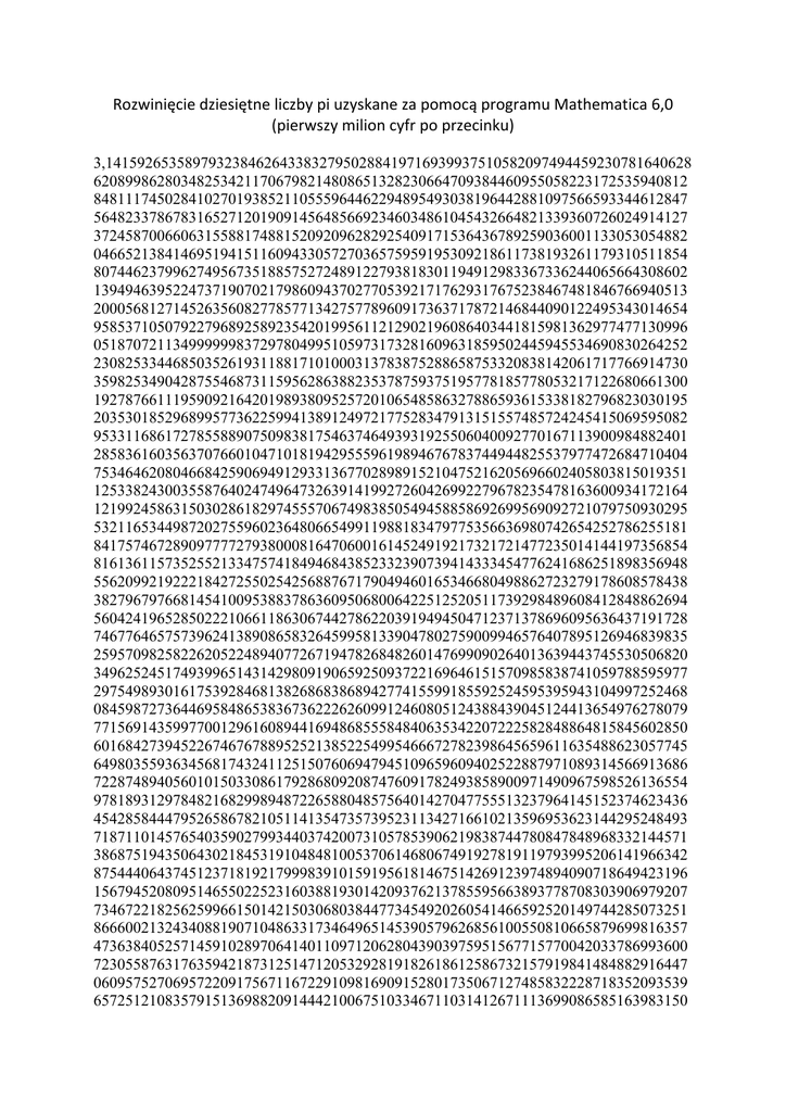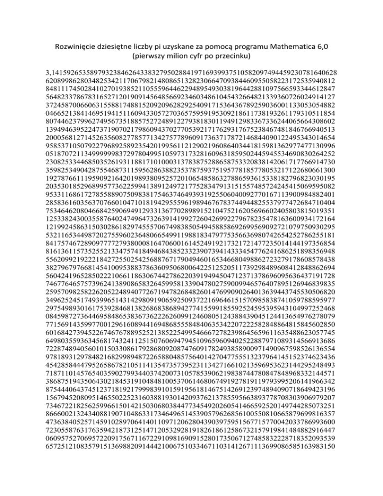 Rozwinięcie dziesiętne liczby pi uzyskane za pomocą programu Mathematica 6,0 (pierwszy milion cyfr po przecinku) 3,14159265358979323846264338327950288419716939937510582097494459230781640628 620899862803482534211706798214808651328230664709384460955058223172535940812 848111745028410270193852110555964462294895493038196442881097566593344612847 564823378678316527120190914564856692346034861045432664821339360726024914127 372458700660631558817488152092096282925409171536436789259036001133053054882 046652138414695194151160943305727036575959195309218611738193261179310511854 807446237996274956735188575272489122793818301194912983367336244065664308602 139494639522473719070217986094370277053921717629317675238467481846766940513 200056812714526356082778577134275778960917363717872146844090122495343014654 958537105079227968925892354201995611212902196086403441815981362977477130996 051870721134999999837297804995105973173281609631859502445945534690830264252 230825334468503526193118817101000313783875288658753320838142061717766914730 359825349042875546873115956286388235378759375195778185778053217122680661300 192787661119590921642019893809525720106548586327886593615338182796823030195 203530185296899577362259941389124972177528347913151557485724245415069595082 953311686172785588907509838175463746493931925506040092770167113900984882401 285836160356370766010471018194295559619894676783744944825537977472684710404 753464620804668425906949129331367702898915210475216205696602405803815019351 125338243003558764024749647326391419927260426992279678235478163600934172164 121992458631503028618297455570674983850549458858692699569092721079750930295 532116534498720275596023648066549911988183479775356636980742654252786255181 841757467289097777279380008164706001614524919217321721477235014144197356854 816136115735255213347574184946843852332390739414333454776241686251898356948 556209921922218427255025425688767179049460165346680498862723279178608578438 382796797668145410095388378636095068006422512520511739298489608412848862694 560424196528502221066118630674427862203919494504712371378696095636437191728 746776465757396241389086583264599581339047802759009946576407895126946839835 259570982582262052248940772671947826848260147699090264013639443745530506820 349625245174939965143142980919065925093722169646151570985838741059788595977 297549893016175392846813826868386894277415599185592524595395943104997252468 084598727364469584865383673622262609912460805124388439045124413654976278079 771569143599770012961608944169486855584840635342207222582848864815845602850 601684273945226746767889525213852254995466672782398645659611635488623057745 649803559363456817432411251507606947945109659609402522887971089314566913686 722874894056010150330861792868092087476091782493858900971490967598526136554 978189312978482168299894872265880485756401427047755513237964145152374623436 454285844479526586782105114135473573952311342716610213596953623144295248493 718711014576540359027993440374200731057853906219838744780847848968332144571 386875194350643021845319104848100537061468067491927819119793995206141966342 875444064374512371819217999839101591956181467514269123974894090718649423196 156794520809514655022523160388193014209376213785595663893778708303906979207 734672218256259966150142150306803844773454920260541466592520149744285073251 866600213243408819071048633173464965145390579626856100550810665879699816357 473638405257145910289706414011097120628043903975951567715770042033786993600 723055876317635942187312514712053292819182618612586732157919841484882916447 060957527069572209175671167229109816909152801735067127485832228718352093539 657251210835791513698820914442100675103346711031412671113699086585163983150 197016515116851714376576183515565088490998985998238734552833163550764791853 589322618548963213293308985706420467525907091548141654985946163718027098199 430992448895757128289059232332609729971208443357326548938239119325974636673 058360414281388303203824903758985243744170291327656180937734440307074692112 019130203303801976211011004492932151608424448596376698389522868478312355265 821314495768572624334418930396864262434107732269780280731891544110104468232 527162010526522721116603966655730925471105578537634668206531098965269186205 647693125705863566201855810072936065987648611791045334885034611365768675324 944166803962657978771855608455296541266540853061434443185867697514566140680 070023787765913440171274947042056223053899456131407112700040785473326993908 145466464588079727082668306343285878569830523580893306575740679545716377525 420211495576158140025012622859413021647155097925923099079654737612551765675 135751782966645477917450112996148903046399471329621073404375189573596145890 193897131117904297828564750320319869151402870808599048010941214722131794764 777262241425485454033215718530614228813758504306332175182979866223717215916 077166925474873898665494945011465406284336639379003976926567214638530673609 657120918076383271664162748888007869256029022847210403172118608204190004229 661711963779213375751149595015660496318629472654736425230817703675159067350 235072835405670403867435136222247715891504953098444893330963408780769325993 978054193414473774418426312986080998886874132604721569516239658645730216315 981931951673538129741677294786724229246543668009806769282382806899640048243 540370141631496589794092432378969070697794223625082216889573837986230015937 764716512289357860158816175578297352334460428151262720373431465319777741603 199066554187639792933441952154134189948544473456738316249934191318148092777 710386387734317720754565453220777092120190516609628049092636019759882816133 231666365286193266863360627356763035447762803504507772355471058595487027908 143562401451718062464362679456127531813407833033625423278394497538243720583 531147711992606381334677687969597030983391307710987040859133746414428227726 346594704745878477872019277152807317679077071572134447306057007334924369311 383504931631284042512192565179806941135280131470130478164378851852909285452 0116583934196562134914341595625