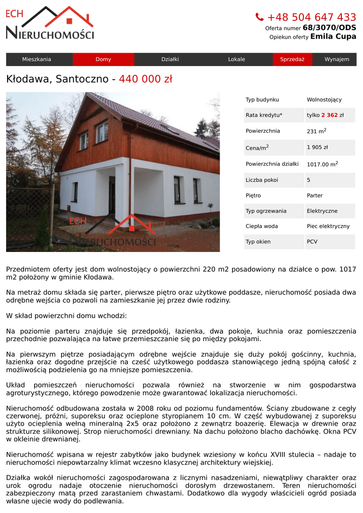 +48504647433 Ofertanumer68/3070/ODS OpiekunofertyEmilaCupa Mieszkania Domy Działki Lokale Sprzedaż Wynajem Kłodawa,Santoczno-440000zł Typbudynku Wolnostojący Ratakredytu* tylko2362zł Powierzchnia 231m2 Cena/m2 1905zł Powierzchniadziałki 1017.00m2 Liczbapokoi 5 Piętro Parter Typogrzewania Elektryczne Ciepławoda Piecelektryczny Typokien PCV Przedmiotemofertyjestdomwolnostojącyopowierzchni220m2posadowionynadziałceopow.1017 m2położonywgminieKłodawa. Nametrażdomuskładasięparter,pierwszepiętroorazużytkowepoddasze,nieruchomośćposiadadwa odrębnewejściacopozwolinazamieszkaniejejprzezdwierodziny. Wskładpowierzchnidomuwchodzi: Na poziomie parteru znajduje się przedpokój, łazienka, dwa pokoje, kuchnia oraz pomieszczenia przechodniepozwalającanałatweprzemieszczaniesiępomiędzypokojami. Na pierwszym piętrze posiadającym odrębne wejście znajduje się duży pokój gościnny, kuchnia, łazienka oraz dogodne przejście na cześć użytkowego poddasza stanowiącego jedną spójną całość z możliwościąpodzieleniagonamniejszepomieszczenia. Układ pomieszczeń nieruchomości pozwala również na stworzenie w nim gospodarstwa agroturystycznego,któregopowodzeniemożegwarantowaćlokalizacjanieruchomości. Nieruchomośćodbudowanazostaław2008rokuodpoziomufundamentów.Ścianyzbudowanezcegły czerwonej, próżni, suporeksu oraz ocieplone styropianem 10 cm. W część wybudowanej z suporeksu użyto ocieplenia wełną mineralną 2x5 oraz położono z zewnątrz boazerię. Elewacja w drewnie oraz strukturzesilikonowej.Stropnieruchomościdrewniany.Nadachupołożonoblachodachówkę.OknaPCV wokleiniedrewnianej. Nieruchomość wpisana w rejestr zabytków jako budynek wziesiony w końcu XVIII stulecia – nadaje to nieruchomościniepowtarzalnyklimatwczesnoklasycznejarchitekturywiejskiej. Działka wokół nieruchomości zagospodarowana z licznymi nasadzeniami, niewątpliwy charakter oraz urok ogrodu nadaje otoczenie nieruchomości dorosłym drzewostanem. Teren nieruchomości zabezpieczony matą przed zarastaniem chwastami. Dodatkowo dla wygody właścicieli ogród posiada własneujeciewodydopodlewania. Przepiękna zabytkowa nieruchomość w malowniczej okolicy to zapewne niebywałe połączenie świadczące o atrakcyjności nieruchomości. Dom otoczony lasami, w sąsiedztwie licznych jezior jest idealnymmiejscemdlaosóbceniącychsobieciszęispokój. ISTNIEJEMOŻLIWOŚĆZAMIANYNAMIESZKANIEZDOPŁATĄWNOWYMBUDOWNICTWIE. ZAPRASZAMYNAPREZENTACJĘNIERUCHOMOŚCI! BEZPŁATNIE POMAGAMY W UZYSKANIU KREDYTU NA DOGODNYCH WARUNKACH NA ZAKUP TEJ NIERUCHOMOŚCI-OFERTA25BANKÓW. ul.MieszkaI-go2/3,66-400GorzówWlkp.,telefon:+48504647443,e-mail:[email protected]