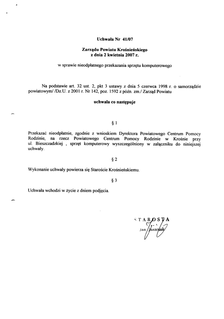 U chwała Nr 41/07 Zarządu Powiatu Krośnieńskiego z dnia 2 kwietnia 2007 r. w sprawie nieodpłatnego przekazania sprzętu komputerowego Na podstawie art. 32 ust. 2, pkt 3 ustawy z dnia 5 czerwca 1998 r. o powiatowym/ /Dz.U z 2001r.Nr142, poz. 1592 z późn. zm./ Zarząd Powiatu uchwała co samorządzie następuje §1 Przekazać nieodpłatnie, zgodnie z wnioskiem Dyrektora Powiatowego Centrum Pomocy Rodzinie, na rzecz Powiatowego Centrum Pomocy Rodzinie w Krośnie przy ul. Bieszczadzkiej , sprzęt komputerowy wyszczególniony w załączniku do niniejszej uchwały. §2 Wykonanie uchwały powierza się Staroście Krośnieńskiemu. §3 Uchwała wchodzi w życie z dniem podjęcia. ~TA J1,?,s7~ )a(/"tf Załącznik do Uchwały Zarządu N r41/07 z dnia 02.04.2007 r. Wykaz spnętu komputerowego pnekazanego nieodpłatnie na rzecz Powiatowego Centrum Pomocy Rodzinie Lp. 1 Wyszczególnienie Nr inwentanowy Wartość /zł./ OA-125 5.281,53 F-126 3.597,68 Zestaw komputerowy: - monitor OPTI View II l 5B - jednostka centralna, - drukarka HP DJ 640, - - skaner Pustek OpticPro UA 18, - klawiatura, - mysz 2 Zestaw komputerowy: - monitor OPTIView II l 5B, - jednostka centralna, - klawiatura, - mysz A4Tech