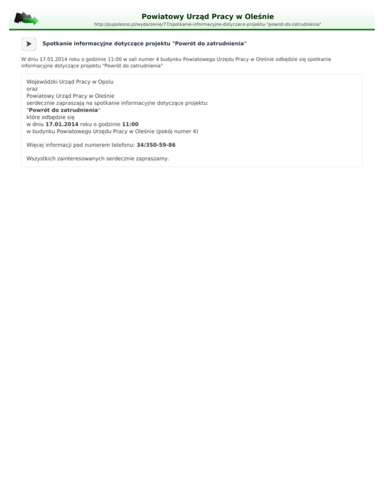 Powiatowy Urząd Pracy w Oleśnie http://pupolesno.pl/wydarzenie/77/spotkanie-informacyjne-dotyczace-projektu-"powrot-do-zatrudnienia" Spotkanie informacyjne dotyczące projektu "Powrót do zatrudnienia" W dniu 17.01.2014 roku o godzinie 11:00 w sali numer 4 budynku Powiatowego Urzędu Pracy w Oleśnie odbędzie się spotkanie informacyjne dotyczące projektu "Powrót do zatrudnienia" Wojewódzki Urząd Pracy w Opolu oraz Powiatowy Urząd Pracy w Oleśnie serdecznie zapraszają na spotkanie informacyjne dotyczące projektu: "Powrót do zatrudnienia" które odbędzie się w dniu 17.01.2014 roku o godzinie 11:00 w budynku Powiatowego Urzędu Pracy w Oleśnie (pokój numer 4) Więcej informacji pod numerem telefonu: 34/350-59-86 Wszystkich zainteresowanych serdecznie zapraszamy.
