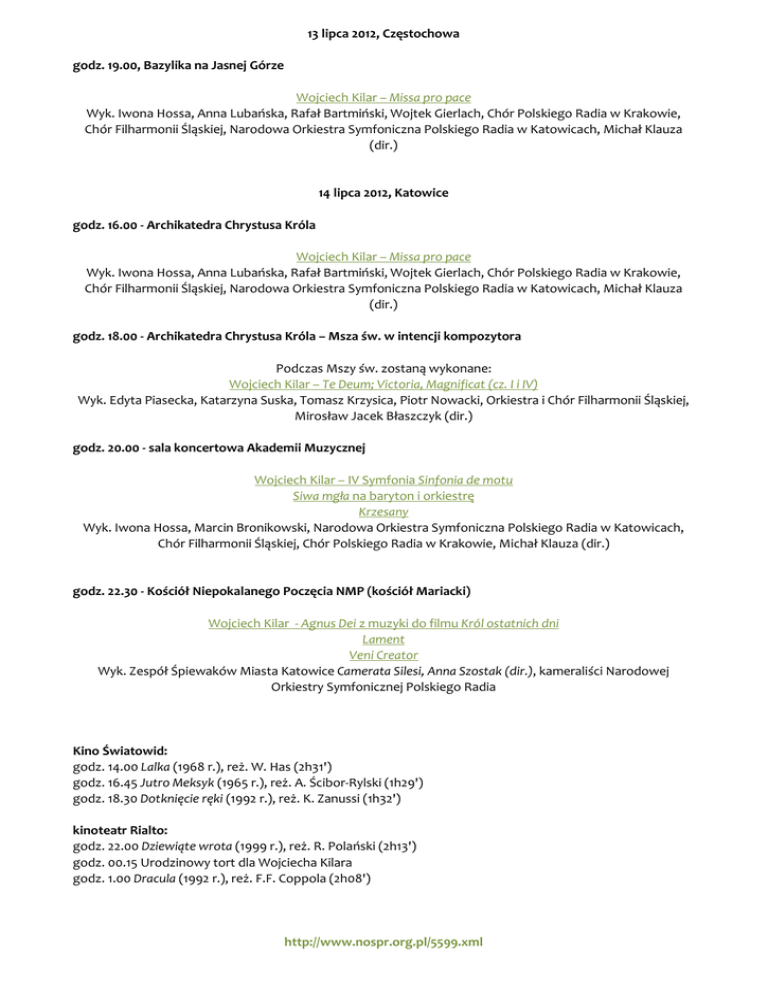 13 lipca 2012, Częstochowa godz. 19.00, Bazylika na Jasnej Górze Wojciech Kilar – Missa pro pace Wyk. Iwona Hossa, Anna Lubańska, Rafał Bartmiński, Wojtek Gierlach, Chór Polskiego Radia w Krakowie, Chór Filharmonii Śląskiej, Narodowa Orkiestra Symfoniczna Polskiego Radia w Katowicach, Michał Klauza (dir.) 14 lipca 2012, Katowice godz. 16.00 - Archikatedra Chrystusa Króla Wojciech Kilar – Missa pro pace Wyk. Iwona Hossa, Anna Lubańska, Rafał Bartmiński, Wojtek Gierlach, Chór Polskiego Radia w Krakowie, Chór Filharmonii Śląskiej, Narodowa Orkiestra Symfoniczna Polskiego Radia w Katowicach, Michał Klauza (dir.) godz. 18.00 - Archikatedra Chrystusa Króla – Msza św. w intencji kompozytora Podczas Mszy św. zostaną wykonane: Wojciech Kilar – Te Deum; Victoria, Magnificat (cz. I i IV) Wyk. Edyta Piasecka, Katarzyna Suska, Tomasz Krzysica, Piotr Nowacki, Orkiestra i Chór Filharmonii Śląskiej, Mirosław Jacek Błaszczyk (dir.) godz. 20.00 - sala koncertowa Akademii Muzycznej Wojciech Kilar – IV Symfonia Sinfonia de motu Siwa mgła na baryton i orkiestrę Krzesany Wyk. Iwona Hossa, Marcin Bronikowski, Narodowa Orkiestra Symfoniczna Polskiego Radia w Katowicach, Chór Filharmonii Śląskiej, Chór Polskiego Radia w Krakowie, Michał Klauza (dir.) godz. 22.30 - Kościół Niepokalanego Poczęcia NMP (kościół Mariacki) Wojciech Kilar - Agnus Dei z muzyki do filmu Król ostatnich dni Lament Veni Creator Wyk. Zespół Śpiewaków Miasta Katowice Camerata Silesi, Anna Szostak (dir.), kameraliści Narodowej Orkiestry Symfonicznej Polskiego Radia Kino Światowid: godz. 14.00 Lalka (1968 r.), reż. W. Has (2h31') godz. 16.45 Jutro Meksyk (1965 r.), reż. A. Ścibor-Rylski (1h29') godz. 18.30 Dotknięcie ręki (1992 r.), reż. K. Zanussi (1h32') kinoteatr Rialto: godz. 22.00 Dziewiąte wrota (1999 r.), reż. R. Polański (2h13') godz. 00.15 Urodzinowy tort dla Wojciecha Kilara godz. 1.00 Dracula (1992 r.), reż. F.F. Coppola (2h08') http://www.nospr.org.pl/5599.xml