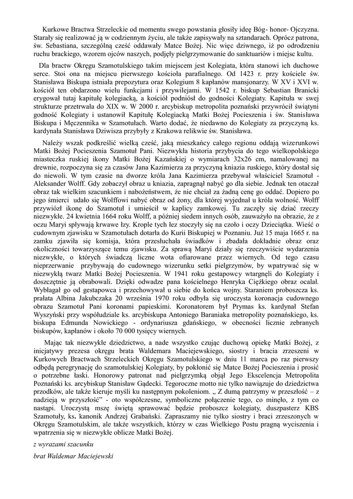 Kurkowe Bractwa Strzeleckie od momentu swego powstania głosiły ideę Bóg- honor- Ojczyzna. Starały się realizować ją w codziennym życiu, ale także zapisywały na sztandarach. Oprócz patrona, św. Sebastiana, szczególną cześć oddawały Matce Bożej. Nic więc dziwnego, iż po odrodzeniu ruchu brackiego, wzorem ojców naszych, podjęły pielgrzymowanie do sanktuariów i miejsc kultu. Dla bractw Okręgu Szamotulskiego takim miejscem jest Kolegiata, która stanowi ich duchowe serce. Stoi ona na miejscu pierwszego kościoła parafialnego. Od 1423 r. przy kościele św. Stanisława Biskupa istniała prepozytura oraz Kolegium 8 kapłanów mansjonarzy. W XV i XVI w. kościół ten obdarzono wielu funkcjami i przywilejami. W 1542 r. biskup Sebastian Branicki erygował tutaj kapitułę kolegiacką, a kościół podniósł do godności Kolegiaty. Kapituła w swej strukturze przetrwała do XIX w. W 2000 r. arcybiskup metropolita poznański przywrócił świątyni godność Kolegiaty i ustanowił Kapitułę Kolegiacką Matki Bożej Pocieszenia i św. Stanisława Biskupa i Męczennika w Szamotułach. Warto dodać, że niedawno do Kolegiaty za przyczyną ks. kardynała Stanisława Dziwisza przybyły z Krakowa relikwie św. Stanisława. Należy wszak podkreślić wielką cześć, jaką mieszkańcy całego regionu oddają wizerunkowi Matki Bożej Pocieszenia Szamotuł Pani. Niezwykła historia przybycia do tego wielkopolskiego miasteczka ruskiej ikony Matki Bożej Kazańskiej o wymiarach 32x26 cm, namalowanej na drewnie, rozpoczyna się za czasów Jana Kazimierza za przyczyną kniazia ruskiego, który dostał się do niewoli. W tym czasie na dworze króla Jana Kazimierza przebywał właściciel Szamotuł Aleksander Wolff. Gdy zobaczył obraz u kniazia, zapragnął nabyć go dla siebie. Jednak ten otaczał obraz tak wielkim szacunkiem i nabożeństwem, że nie chciał za żadną cenę go oddać. Dopiero po jego śmierci udało się Wolffowi nabyć obraz od żony, dla której wyjednał u króla wolność. Wolff przywiózł ikonę do Szamotuł i umieścił w kaplicy zamkowej. Tu zaczęły się dziać rzeczy niezwykłe. 24 kwietnia 1664 roku Wolff, a później siedem innych osób, zauważyło na obrazie, że z oczu Maryi spływają krwawe łzy. Krople tych łez stoczyły się na czoło i oczy Dzieciątka. Wieść o cudownym zjawisku w Szamotułach dotarła do Kurii Biskupiej w Poznaniu. Już 15 maja 1665 r. na zamku zjawiła się komisja, która przesłuchała świadków i zbadała dokładnie obraz oraz okoliczności towarzyszące temu zjawisku. Za sprawą Maryi działy się rzeczywiście wydarzenia niezwykłe, o których świadczą liczne wota ofiarowane przez wiernych. Od tego czasu nieprzerwanie przybywają do cudownego wizerunku setki pielgrzymów, by wpatrywać się w niezwykłą twarz Matki Bożej Pocieszenia. W 1941 roku gestapowcy wtargnęli do Kolegiaty i doszczętnie ją obrabowali. Dzięki odwadze pana kościelnego Henryka Ciężkiego obraz ocalał. Wybłagał go od gestapowca i przechowywał u siebie do końca wojny. Staraniem proboszcza ks. prałata Albina Jakubczaka 20 września 1970 roku odbyła się uroczysta koronacja cudownego obrazu Szamotuł Pani koronami papieskimi. Koronatorem był Prymas ks. kardynał Stefan Wyszyński przy współudziale ks. arcybiskupa Antoniego Baraniaka metropolity poznańskiego, ks. biskupa Edmunda Nowickiego - ordynariusza gdańskiego, w obecności licznie zebranych biskupów, kapłanów i około 70 000 tysięcy wiernych. Mając tak niezwykłe dziedzictwo, a nade wszystko czując duchową opiekę Matki Bożej, z inicjatywy prezesa okręgu brata Waldemara Maciejewskiego, siostry i bracia zrzeszeni w Kurkowych Bractwach Strzeleckich Okręgu Szamotulskiego w dniu 11 marca po raz pierwszy odbędą peregrynację do szamotulskiej Kolegiaty, by pokłonić się Matce Bożej Pocieszenia i prosić o potrzebne łaski. Honorowy patronat nad pielgrzymką objął Jego Ekscelencja Metropolita Poznański ks. arcybiskup Stanisław Gądecki. Tegoroczne motto nie tylko nawiązuje do dziedzictwa przodków, ale także kieruje myśli ku następnym pokoleniom. „ Z dumą patrzymy w przeszłość – z nadzieją w przyszłość” - oto współczesne, symboliczne połączenie tego, co minęło, z tym co nastąpi. Uroczystą mszę świętą sprawować będzie proboszcz kolegiaty, duszpasterz KBS Szamotuły, ks. kanonik Andrzej Grabański. Zapraszamy nie tylko siostry i braci zrzeszonych w Okręgu Szamotulskim, ale także wszystkich, którzy w czas Wielkiego Postu pragną wyciszenia i wpatrzenia się w niezwykłe oblicze Matki Bożej. z wyrazami szacunku brat Waldemar Maciejewski