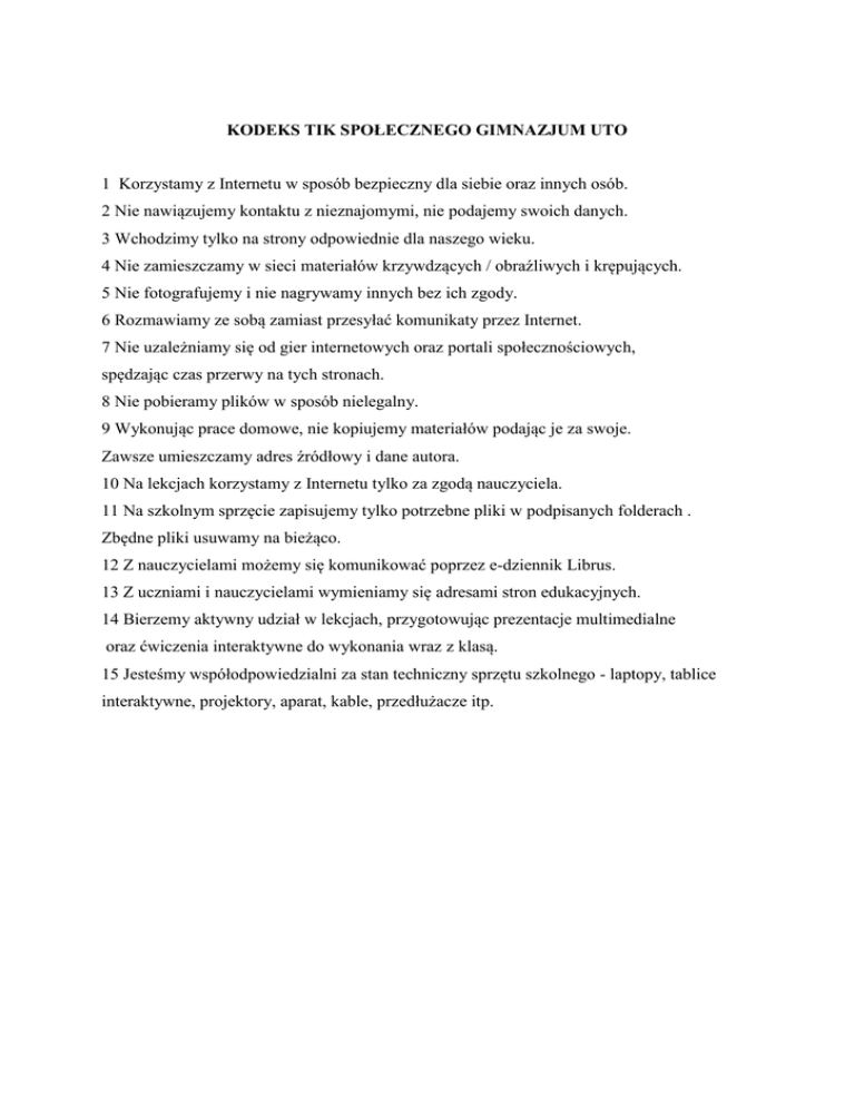 KODEKS TIK SPOŁECZNEGO GIMNAZJUM UTO 1 Korzystamy z Internetu w sposób bezpieczny dla siebie oraz innych osób. 2 Nie nawiązujemy kontaktu z nieznajomymi, nie podajemy swoich danych. 3 Wchodzimy tylko na strony odpowiednie dla naszego wieku. 4 Nie zamieszczamy w sieci materiałów krzywdzących / obraźliwych i krępujących. 5 Nie fotografujemy i nie nagrywamy innych bez ich zgody. 6 Rozmawiamy ze sobą zamiast przesyłać komunikaty przez Internet. 7 Nie uzależniamy się od gier internetowych oraz portali społecznościowych, spędzając czas przerwy na tych stronach. 8 Nie pobieramy plików w sposób nielegalny. 9 Wykonując prace domowe, nie kopiujemy materiałów podając je za swoje. Zawsze umieszczamy adres źródłowy i dane autora. 10 Na lekcjach korzystamy z Internetu tylko za zgodą nauczyciela. 11 Na szkolnym sprzęcie zapisujemy tylko potrzebne pliki w podpisanych folderach . Zbędne pliki usuwamy na bieżąco. 12 Z nauczycielami możemy się komunikować poprzez e-dziennik Librus. 13 Z uczniami i nauczycielami wymieniamy się adresami stron edukacyjnych. 14 Bierzemy aktywny udział w lekcjach, przygotowując prezentacje multimedialne oraz ćwiczenia interaktywne do wykonania wraz z klasą. 15 Jesteśmy współodpowiedzialni za stan techniczny sprzętu szkolnego - laptopy, tablice interaktywne, projektory, aparat, kable, przedłużacze itp.
