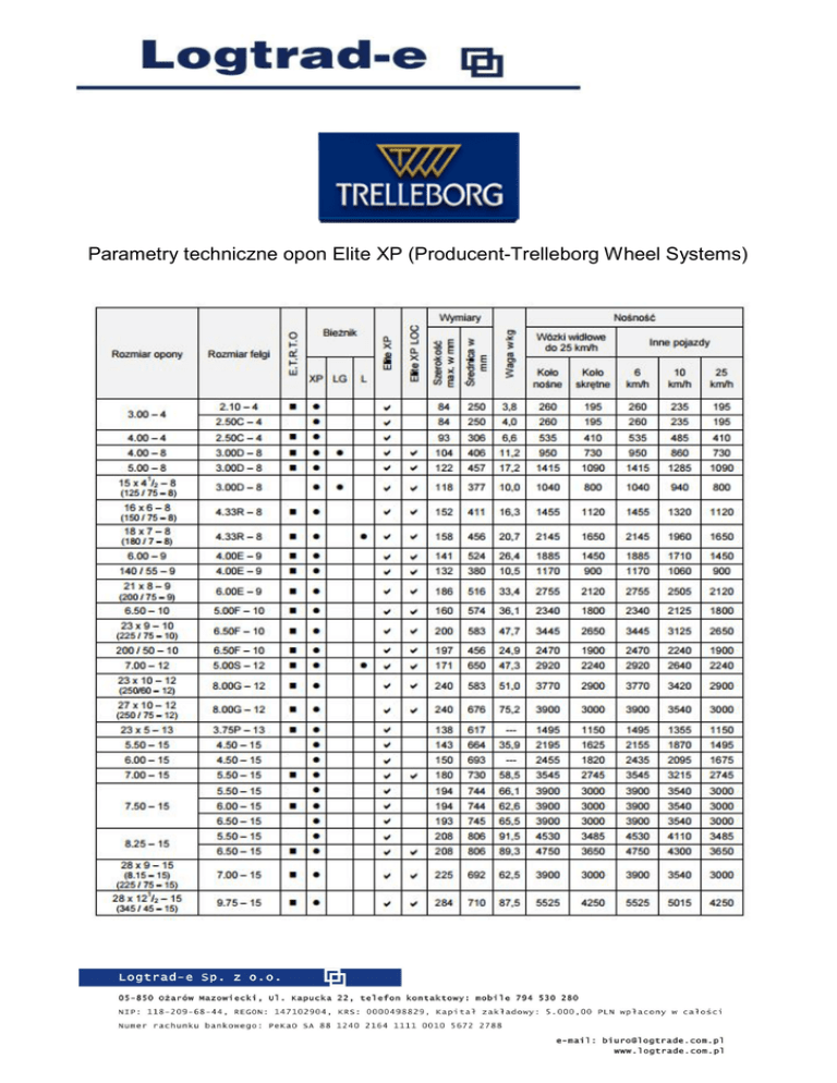 Parametry techniczne opon Elite XP (Producent-Trelleborg Wheel Systems) Dostępne wersje opony Elite XP: NM – nie brudząca powierzchni ELCON / ELF – antystatyczna High Load – na większe obciążenia (wysoki komfort jazdy i lepsze odprowadzenie ciepła) LOC- szybki montaż