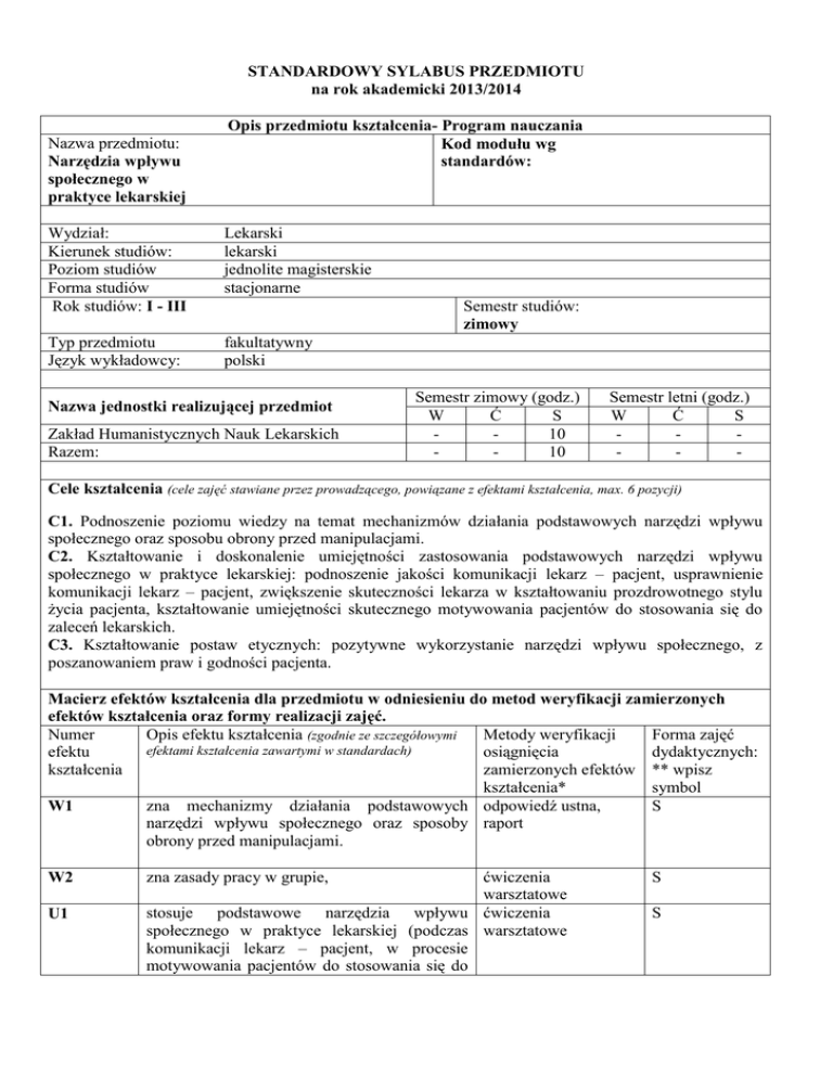 STANDARDOWY SYLABUS PRZEDMIOTU na rok akademicki 2013