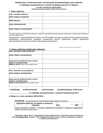 Deklaracja o kontynuowaniu wychowania przedszkolnego przez dziecko w oddziale przedszkolnym w Szkole Podstawowej Nr 2 w Sierpcu w roku szkolnym 2015/2016 (deklarację proszę wypełnić drukowanymi literami) 1. Dane dziecka: Imię i nazwisko dziecka Data i miejsce urodzenia PESEL dziecka Adres zameldowania Adres miejsca zamieszkania* 'Pouczenie: zgodnie z art.25 Kodeksu Cywilnego : miejscem zamieszkania osoby fizycznej jest miejscowość, w której osoba ta przebywa z zamiarem stałego pobytu. Uprzedzona/y o odpowiedzialności karnej z art.233 kodeksu karnego za podanie nieprawdziwych danych potwierdzam własnoręcznym podpisem prawdziwość danych adresowych Jestem świadoma/y odpowiedzialności karnej za złożenie fałszywego oświadczenia. podpis rodzica/opiekuna prawnego/ 2. Dane rodziców/opiekunów dziecka: Imię i nazwisko matki/opiekunki Adres miejsca zamieszkania Adres poczty elektronicznej i numer telefonu kontaktowego Miejsce pracy (pełna nazwa zakładu pracy) imię i nazwisko ojca/opiekuna Adres miejsca zamieszkania Adres poczty elektronicznej i numer telefonu kontaktowego Miejsce pracy(pełna nazwa zakładu pracy) 3. Deklaruję kontynuowanie wychowania przedszkolnego córki/syna ..................................... w oddziale przedszkolnym w Szkole Podstawowej Nr 2 w Sierpcu w roku szkolnym 2015/2016. 4.PLANUJĘ : /proszę zaznaczyć X jeśli dziecko będzie korzystać z tej formy/ Zapisanie dziecka na obiad w stołówce szkolnej TAK NIE Zasady korzystania z obiadów i wnoszenia odpłatności są określone w odrębnych regulaminach, ustalonych przez dyrektora szkoły. Deklarację należy złożyć w sekretariacie szkoły podstawowej w nieprzekraczalnym terminie do dnia 27 kwietnia 2015r. do godz. 15.00. Niespełnienie tego wymogu oznacza rezygnację z miejsca * w oddziale przedszkolnym. TAK NIE Moje dziecko będzie korzystać z opieki w świetlicy szkolnej Zasady korzystania z zajęć świetlicowych są określone w odrębnych regulaminie. Korzystanie ze świetlicy szkolnej jest TAK NIE nieodpłatne. 5. Do niniejszej DEKLARACJI załączam: 1)DRUK: Dodatkowe informacje o dziecku lub rodzinie, które są ważne wg. opiekunów (w tym.np. przewlekła choroba, dieta itp.) 2)opinię/orzeczenie poradni psychologiczno-pedagogicznej TAK NIE 6.Oświadczenia: 1) .Niniejszym przyjmuję do wiadomości i wyrażam zgodę na gromadzenie, przetwarzanie i udostępnianie danych osobowych zawartych w deklaracji, w systemach informatycznych szkoły oraz organów uprawnionych do nadzoru nad jednostkami oświatowymi. Przetwarzanie danych odbywać się będzie zgodnie z ustawą o ochronie danych osobowych (t.j. Dz.U. z 2002r. Nr 101 poz.926 z późn.zm.) 2. Zobowiązuję się do niezwłocznego zgłaszania dyrektor szkoły wszelkich zmian danych ujętych w niniejszej DEKLARACJI. 3. Zobowiązuję się do podpisania do 13 czerwca br. z dyrektorem w/w placówki UMOWY o świadczenie usług w zakresie wychowania przedszkolnego na rok szkolny 2015/2016. podpis matki lub ojca /opiekuna prawnego/ Data przyjęcia DEKLARACJI: Liczba załączników: Podpis dyrektora/osoby przyjmującej deklarację Uwaga: Przydział do oddziałów dzieci kontynuujących i nowoprzyjętych na rok szkolny 2015/2016 nastąpi po zakończeniu postępowania rekrutacyjnego. Organizacja oddziału uzależniona jest od liczby i wieku dzieci przyjętych oraz możliwości organizacyjnych szkoły. Deklarację należy złożyć w szkole w nieprzekraczalnym terminie do dnia 27 kwietnia 2015r do qodz.15.00. Niespełnienie tego wymogu oznacza rezygnację z miejsca w oddziale przedszkolnym. Załącznik nr 2 do Zarządzenia Nr 28.WOK.2015 Burmistrza Miasta Sierpc z dnia 23 marca 2015r. Data wpływu do szkoły WNIOSEK O PRZYJĘCIE DZIECKA DO ODDZIAŁU PRZEDSZKOLNEGO W SZKOLE PODSTAWOWEJ w Sierpcu na rok szkolny 2015/2016 (proszę wypełnić drukowanymi literami) Liczba załączników: ................. I. Proszę o przyjęcie do oddziału przedszkolnego w Szkole Podstawowej nr 2 dziecka ...................................................... ........................................................................................ ur.dn ............................. 20 ........ r. w........................................................... .. /imię i nazwisko dziecka/ PESEL: ................................. seria i numer paszportu lub innego dokumentu potwierdzającego tożsamość*....................................................... Adres zamieszkania** dziecka: ................................................................................................................................... .................... Pouczenie: ♦wymagane podanie tylko w przypadku braku nr PESEL ♦♦zgodnie z art.25 Kodeksu Cywilnego miejscem zamieszkania osoby fizycznej jest miejscowość, w której osoba ta przebywa z zamiarem stałego pobytu. Uprzedzona/y o odpowiedzialności karnej z art.233 kodeksu karnego za podanie nieprawdziwych danych potwierdzam własnoręcznym podpisem prawdziwość danych adresowych. Jestem świadoma/y czytelny podpis rodzica /opiekuna prawnego/ Matka/opiekunka prawna imię i nazwisko Ojciec/opiekun prawny adres zamieszkania numer telefonu do kontaktu z rodzicem WYPEŁNIAJĄ które OSOBY, chcą skorzystać z KRYTERIUM DODATKOWE GO nr 5 adres poczty elektronicznej poświadczenie o zatrudnieniu przez zakład pracy /pieczęć firmowa i podpis osoby upoważnionej/ odpowiedzialności karnej za złożenie fałszywego oświadczenia. III. ZGŁOSZENIE DZIECKA /proszę zaznaczyćX/ NA OBIAD W STOŁÓWCE SZKOLNEJ TAK □ NIE □ Zasady korzystania z obiadów i wnoszenia odpłatności sq określone w odrębnym regulaminieh, ustalonym przez dyrektor szkoły. Moje dziecko będzie korzystać z opieki w świetlicy szkolnej TAK NIE ii. DANE O RODZ1CACH/OPIEKUNACH PRAWNYCH DZIECKA: Zasady korzystania z zajęć świetlicowych sq określone w odrębnych regulaminie. Korzystanie ze świetlicy szkolnej jest nieodpłatne. IV.SPEŁNIONE KRYTERIA PRZYJĘ
