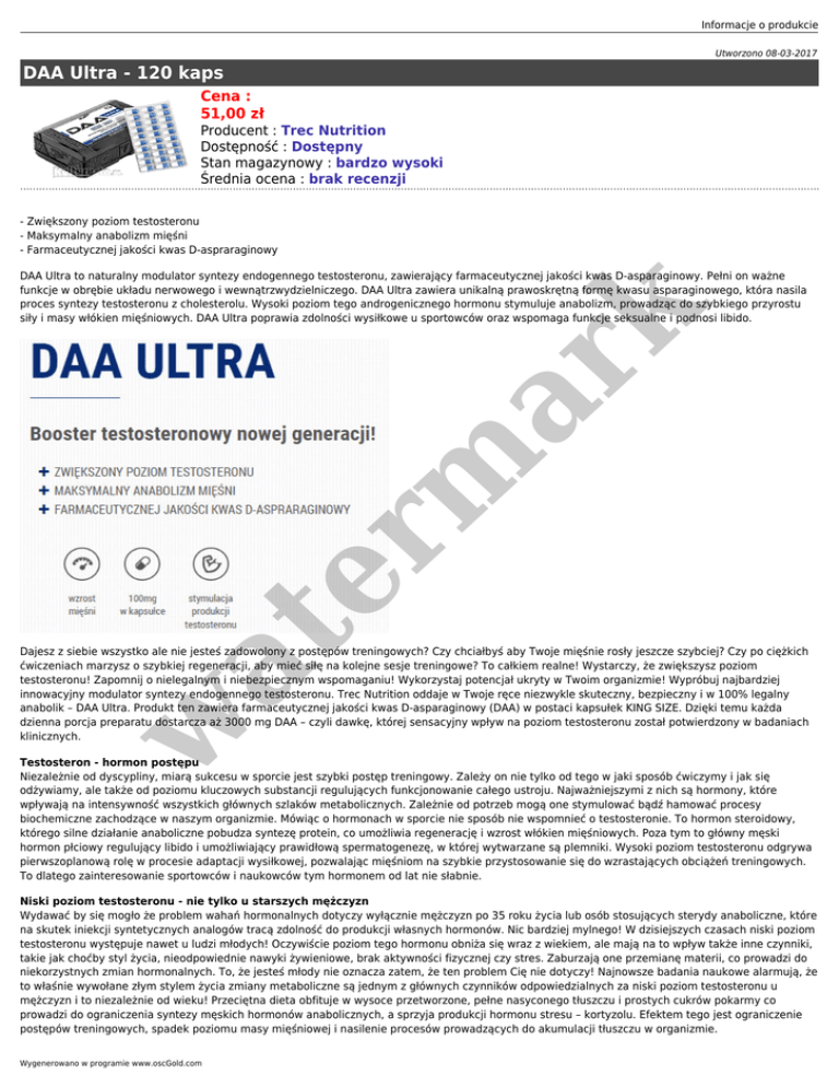Informacje o produkcie Utworzono 08-03-2017 DAA Ultra - 120 kaps Cena : 51,00 zł Producent : Trec Nutrition Dostępność : Dostępny Stan magazynowy : bardzo wysoki Średnia ocena : brak recenzji - Zwiększony poziom testosteronu - Maksymalny anabolizm mięśni - Farmaceutycznej jakości kwas D-aspraraginowy at er m ar k DAA Ultra to naturalny modulator syntezy endogennego testosteronu, zawierający farmaceutycznej jakości kwas D-asparaginowy. Pełni on ważne funkcje w obrębie układu nerwowego i wewnątrzwydzielniczego. DAA Ultra zawiera unikalną prawoskrętną formę kwasu asparaginowego, która nasila proces syntezy testosteronu z cholesterolu. Wysoki poziom tego androgenicznego hormonu stymuluje anabolizm, prowadząc do szybkiego przyrostu siły i masy włókien mięśniowych. DAA Ultra poprawia zdolności wysiłkowe u sportowców oraz wspomaga funkcje seksualne i podnosi libido. w Dajesz z siebie wszystko ale nie jesteś zadowolony z postępów treningowych? Czy chciałbyś aby Twoje mięśnie rosły jeszcze szybciej? Czy po ciężkich ćwiczeniach marzysz o szybkiej regeneracji, aby mieć siłę na kolejne sesje treningowe? To całkiem realne! Wystarczy, że zwiększysz poziom testosteronu! Zapomnij o nielegalnym i niebezpiecznym wspomaganiu! Wykorzystaj potencjał ukryty w Twoim organizmie! Wypróbuj najbardziej innowacyjny modulator syntezy endogennego testosteronu. Trec Nutrition oddaje w Twoje ręce niezwykle skuteczny, bezpieczny i w 100% legalny anabolik – DAA Ultra. Produkt ten zawiera farmaceutycznej jakości kwas D-asparaginowy (DAA) w postaci kapsułek KING SIZE. Dzięki temu każda dzienna porcja preparatu dostarcza aż 3000 mg DAA – czyli dawkę, której sensacyjny wpływ na poziom testosteronu został potwierdzony w badaniach klinicznych. Testosteron - hormon postępu Niezależnie od dyscypliny, miarą sukcesu w sporcie jest szybki postęp treningowy. Zależy on nie tylko od tego w jaki sposób ćwiczymy i jak się odżywiamy, ale także od poziomu kluczowych substancji regulujących funkcjonowanie całego ustroju. Najważniejszymi z nich są hormony, które wpływają na intensywność wszystkich głównych szlaków metabolicznych. Zależnie od potrzeb mogą one stymulować bądź hamować procesy biochemiczne zachodzące w naszym organizmie. Mówiąc o hormonach w sporcie nie sposób nie wspomnieć o testosteronie. To hormon steroidowy, którego silne działanie anaboliczne pobudza syntezę protein, co umożliwia regenerację i wzrost włókien mięśniowych. Poza tym to główny męski hormon płciowy regulujący libido i umożliwiający prawidłową spermatogenezę, w której wytwarzane są plemniki. Wysoki poziom testosteronu odgrywa pierwszoplanową rolę w procesie adaptacji wysiłkowej, pozwalając mięśniom na szybkie przystosowanie się do wzrastających obciążeń treningowych. To dlatego zainteresowanie sportowców i naukowców tym hormonem od lat nie słabnie. Niski poziom testosteronu - nie tylko u starszych mężczyzn Wydawać by się mogło że problem wahań hormonalnych dotyczy wyłącznie mężczyzn po 35 roku życia lub osób stosujących sterydy anaboliczne, które na skutek iniekcji syntetycznych analogów tracą zdolność do produkcji własnych hormonów. Nic bardziej mylnego! W dzisiejszych czasach niski poziom testosteronu występuje nawet u ludzi młodych! Oczywiście poziom tego hormonu obniża się wraz z wiekiem, ale mają na to wpływ także inne czynniki, takie jak choćby styl życia, nieodpowiednie nawyki żywieniowe, brak aktywności fizycznej czy stres. Zaburzają one przemianę materii, co prowadzi do niekorzystnych zmian hormonalnych. To, że jesteś młody nie oznacza zatem, że ten problem Cię nie dotyczy! Najnowsze badania naukowe alarmują, że to właśnie wywołane złym stylem życia zmiany metaboliczne są jednym z głównych czynników odpowiedzialnych za niski poziom testosteronu u mężczyzn i to niezależnie od wieku! Przeciętna dieta obfituje w wysoce przetworzone, pełne nasyconego tłuszczu i prostych cukrów pokarmy co prowadzi do ograniczenia syntezy męskich hormonów anabolicznych, a sprzyja produkcji hormonu stresu – kortyzolu. Efektem tego jest ograniczenie postępów treningowych, spadek poziomu masy mięśniowej i nasilenie procesów prowadzących do akumulacji tłuszczu w organizmie. Wygenerowano w programie www.oscGold.com Kwas D-asparaginowy - innowacyjny booster testosteronu Co zrobić, kiedy dotknie nas problem obniżonego poziomu testosteronu? Czy istnieją naturalne sposoby, które pomogą nam zwiększyć jego syntezę niezależnie od tego czy mamy lat 18 czy 35? Okazuje się, że pomocne mogą być jak zwykle aminokwasy. Nie chodzi jednak o składniki występujące w konformacji „L” (lewoskrętne np. L-glutamina), które budują większość tkanek naszego organizmu, lecz o formy „D” czyli prawoskrętne. Naukowcy zajmujący się analizą wpływu D-aminokwasów na organizm, które nie pełnią funkcji budulcowej odkryli, że występują one w zwiększonych ilościach min. w tkankach układu nerwowego i wydzielniczego. Co więcej badania prowadzone na zwierzętach wykazały, że organizm pozbawiony źródła D-aminokwasów nie jest zdolny do wzrostu i normalnego funkcjonowania. W ten sposób potwierdziły się przypuszczenia, że pełnią one funkcje neuromodulatorów i regulatorów hormonalnych. Szczególną uwagę badaczy przykuł „brat bliźniak” kwasu L-asparaginowego – DAA (kwas D-asparaginowy). Ten endogenny aminokwas produkowany jest w procesach fizjologicznych zachodzących w podwzgórzu, przysadce mózgowej oraz jądrach. Składnik ten posiada zdolności detoksykacyjne – bierze czynny udział w rozkładzie amoniaku, zabezpieczając organizm, a w szczególności ośrodkowy układ nerwowy przed jego niekorzystnym wpływem. Co dla nas najważniejsze – kwas D-asparaginowy zwiększa poziom aktywnego testosteronu, potęgując tym samym anaboliczny efekt wywołany tre