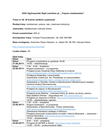 XXIX Ogólnopolski Rajd Leśników pt. ,,Tropem niedźwiedzia” Trasa nr 28: W krainie wielkich szybowisk. Rodzaj trasy: autokarowo, piesza, rejs, rowerowa (drezyny) Jednostka: Nadleśnictwo Ustrzyki Dolne Koszt uczestnictwa: 820 zł Koordynator trasy: Tomasz Puszczałowski , tel. 602 359 868 Baza noclegowa: Gościniec Pięciu Stawów, ul. Jasień 59, 38-700, Ustrzyki Dolne http://ustrzyki-gosciniec.pl/kontakt Liczba miejsc: 50 Opis trasy Dzień Dzień 21.06.2017r. Dzień 22.06.2017r. Opis Przyjazd uczestników po godzinie 16:00. 18:00 – obiadokolacja. 7:30 – 8:30 – śniadanie. Wyjazd autokarem - w programie: Przejazd przez Kopalnię Ropy Naftowej w Łodynie. www.mojebieszczady.com/atrakcja/kopalnia-ropy-naftowej Przełęczą Wolańską, Leszczowate. Zwiedzanie Cerkwi pw. św. Paraskewy w Leszczowatem www.twojebieszczady.net/st_cerkwie/cerkiew_leszcz.php Zwiedzanie w Ośrodku Caritas w Myczkowcach Miniaturowych świątyń Centrum Kultury Ekumenicznej. http://www.twojebieszczady.net/warto/cke.php Przejazd do zapory w Myczkowcach. http://www.twojebieszczady.net/zapora.php Przejazd przez Bóbrkę – Łobozew Dolny do Soliny od strony Jaworu Rejs statkiem Werlas . Degustacja win. http://port-solina.pl/ Przejście po Zaporze w Solinie. http://www.twojebieszczady.net/zapora.php 19:00 – obiadokolacja, ognisko. Dzień 7:30 – 8:30 – śniadanie. 23.06.2017r. Wyjazd autokarem - w programie: Szybowisko w Bezmiechowej - Pokaz sokolnictwa. http://www.twojebieszczady.net/sor/szybowiska.php Zwiedzanie Kamienia Leskiego w Glinnym. Przejazd drezynami rowerowymi na trasie: Uherce Mineralne – Jankowce – Uherce Mineralne. http://www.drezynyrowerowe.pl/ 19:00 – obiadokolacja. Dzień 8:00 – 9:30 – śniadanie. 24.06.2017r. Przyjazd do MOSiR w Sanok. http://www.mosir-sanok.pl/ 13:00 – 22:00 – podsumowanie rajdu. Ustrzyki Dolne Trasa 28 – W Krainie wielkich szybowisk https://drive.google.com/open?id=1mBqu6gAK8AKwZVxvQ2NVw1p_eqI&usp=sharing