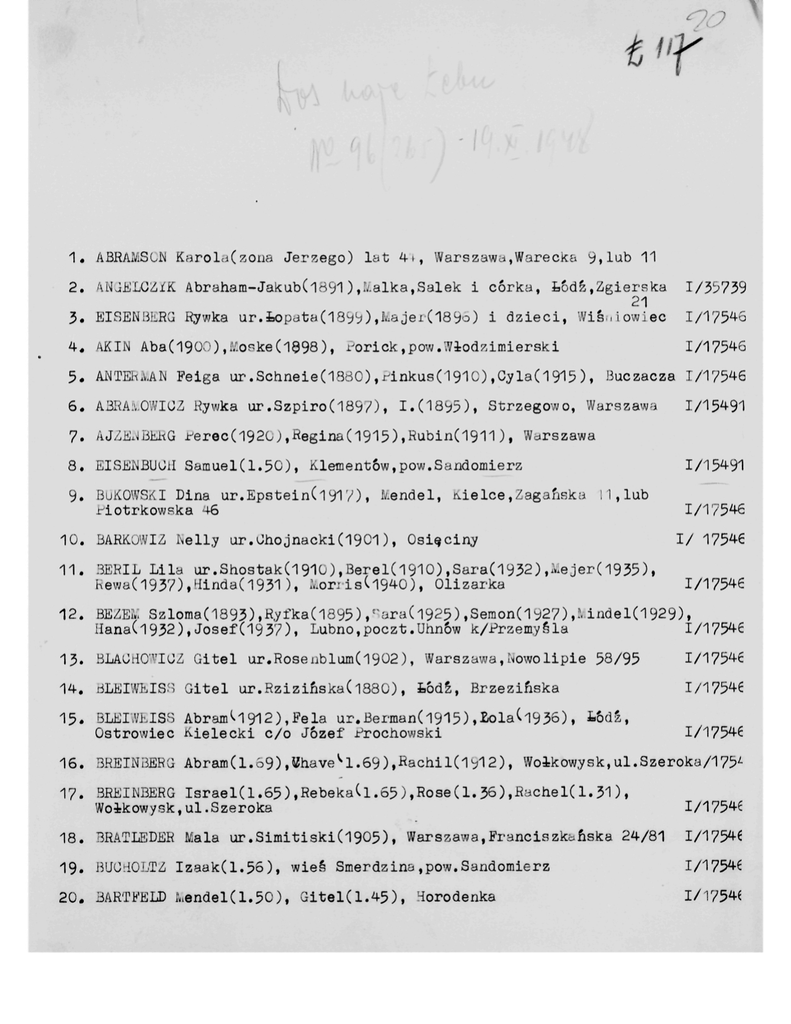 S'f 1 . ABRAMSON Earola(zona Jerzego) l a t 4 i , Warszawa,Warecka 9,lub 11 2 . ANGELOZrK Abraham-Jakub( 1 891 ),. r .'.alka,Salek i corka, L6dz,Zgierska 21 1/3^739 3 . EISENBERG Rywka u r . £ o p a t a ( 1 8 9 9 ) . k a j e r ( 1 8 9 o ) 1/17546 i d z i e c i , Wi&..iowiec 4 . AKIN Aba(1900),Koske(lQ98), i J orick,pow.Wlod7,imierski 1/17546 5 . ANTEhiAN Feiga ur .Schneie(1880),rdnkus(191C) ,Cyla(1915 ) , Buczacza 1/17546 6 . ABRAMOWICZ Hywka u r . S z p i r o ( 1 8 9 / ) , 1.(1895), Strzegowo, Warszawa 7 . AJZEflBERG ^ e r e c ( 1 9 2 0 , R e g i n a ( 1 9 1 5 ) , R u b i n ( 1 9 1 1 ) , Warszawa 8. EISENBUGlI Samuel(1.5C), Klement&w,pow.Sandomierz 9. BUKOWSKI Dina u r . E p s t e i n ( l 9 1 V), Mendel, Kielce,Zaganska ! i , l u b riotrkowska 46 10. BARKOWIZ Kelly ur.Chojnacki(19C1), Osi<*ciny 1/15491 1/15491 1/17546 1 / 17546 1 1 . BERIL Lila u r . S h o s t a k ( l 9 l O ) , B e r e l ( l 9 1 0 ) , S a r a ( 1 9 3 2 ) , ^ e j e r ( l 9 3 5 ) , Kewa(l937),Hinda(l93D, Morn a ( W O ) , Olizarka 1/175^6 12. BEZEii Szloma(1893),Ryfka(l895), 5 'ara( 1925),Seraon(1y27),Mndel(1929), Hana(l932),Josef(1937), Lubno,poczt.Uhn&w k/Przem.ysla 1/175^6 13. BLACHOWIGZ G i t e l ur.Rosenblum(l902), Warszawa,Nowolipie 58/95 1/17546 14. BLBIWEISS G i t e l u r . R z i z i n s k a ( l 8 8 0 ) , Lodz, Brzezihska 1/17546 1 5 . BLEIWEISS Abram^1912),Pela u r . B e r m a n ( l 9 1 5 ) , £ o l a ( l 9 3 6 ) , i&dz, Ostrowiec K i e l e c k i c/o Jozef Prochowski 1/1754-6 16. BREINBERG A b r a m ( l . 6 9 ) , W h a v e v 1 . 6 9 ) , R a c h i l ( i y i 2 ) , Wolkowysk,ul.Szeroka/175 i 17. BREINBERG I s r a e l ( l . 6 5 ) , R e b e k a ( l . 6 5 ) , R o s e ( l . 3 6 ) , R a c h e l ( l . 3 1 ) , Wolkowysk.ul.Szeroka 1/17546 18. BRATLEDER Mala u r . S i m i t i s k i ( l 9 0 5 ) , Warszawa,Franciszkanska 24/81 1/1754-6 19. BUOH.OLTZ I z a a k ( 1 . 5 6 ) , wies Smerdzina ,pow.Sandomierz 1/1754-6 2 0 . BARTFELD ?„endel(1.50), G i t e l ( 1 . 4 5 ) , 4orodenka 1/1754* - 2 - 2 1 . BALSER Mejer(l880),Riwa ur .Nagel,Natan(l91 3) ,Feiga-Rose(l920), J a s i e n i c a . Galicja n/i 1/1754-6 2 2 . BAUMAO E s t e r ur.Litev>ski(1887),Dawid(l887) ,Ghaja-Cela(l922), £6dz,Zgierska 32 1/17546 2 3 . BERLINER Abraham, Bela ur.Stawiskowska, Augusto-, 3-go Mao a 1 1/17546 2 4 . BAUMANN Majer, Malka ur.Haftman,Abraham(1913),Golda(l915), Bolech&w k / S t r y j a 1/17546 2 5 . BORUGHO'VIGZ Dawid(Bolek)ur.1925, £&dz, 1944-5. ob&z,£»6dz, Gzestochowa L/25147 2 6 . BERGER Frimet(1875),Helfant(1891), Krak&w, Szopena 18 1/35728 27. BERGER Gustaw(l918),syn Jakuba i Gecylii Szumas, Lwow, w 1945r. w r o c i i z ZSRB do r o l s k i 28. GIKGOT Noma u r . F r y d l a n d ( 1 9 0 0 ) , Kosonicz 0/36412 1/17546 2 9 . GUSOVSKI Nachman(1895), Liebe(1925),Aron(1918), Ghomsko.pow.Drohiczyn 1/17546 30. GEBEL iVioisze(1875),Bajle(1878),.Vecbel(l90C),Fiszel(1902), Krosno, Szkolna 88 1/17546 3 1 . GAUiEKIN Bela u r . G i n s b e r g ( 1 . 5 0 ) , r J i n c h e s ( 1 . 5 5 ) , F a l e n i c a , Warszawa, Listopada 21 1/17546 32. GINSBuRG E i d e l u r . Z a g e r ( 1 L. 4 5 ) , I s - . k ( l . 4 5 ) , S z m i l ( l . 1 5 ) , M e c h a l ( l . 1 3 ) , iwosen(l.11),i.:achlee(l.9), awidgr6dek,pow.Stolin 1/17546 33. GIN OLD J u l i u s ( 1 . 4 0 ) , Krakow, Bank Zachodni 1/17546 3 4 . GLANS Minnie ur.Domb(1.45),maz(1.50), Gostynin 1/17546 3 5 . GOLDWASSER E l i a s z ( l 8 9 8 ) , G u s t a w ( 1 9 0 8 ) , Warszawa, Mila 20 1/17546 36. GONOIARZ Rywka ur.'l'eitelbaum(1914),Rywen(l912) , S u r a ( l 9 3 8 ) , '"iedzyrzec 1/17546 37. GRINBERG Maike u r . L i e t z m a n ( l 9 0 5 ) , Ghaskiel(1895), Woiyh 1/17546 38. GRUSZCZANSKA rfanna-Oipe u r . A j z e n b e r g ( 1 . 4 5 ) , I s a k - L e i b ( l . 2 1 ) , T o v e Z 4 a t a ( l . 1 6 ) , .<.arkuszow,pow.Lublin 1/17546 39. GAG- N E s t e r ur.Balsei (1915), J a s i e n i c a 1/17546 4 0 . GUTTMAM Mendel(1890),Sara-Elka ur.Dickman(l8^3),ur.w Buczaczu k / Lwowa,zam.Warszawa,Novolipie :>1/31, P/a Wertans 1/15491 4 1 . GUTTIIEIMER Anka ur.Ladowska i d z i e c k o ( l . 9 ) , iodz,iviarczynska 4 1/35728 # 2 . GREENFIELD Isidore(1.48).Minna u r . F l i e g e r ( 1 . 4 6 ) , G h im(l.21),Channa ( l . 1 9 ) , S ' n i k a - S u u l ( l . 1 6 ) , Dabki k/Horodenki 1/17546 4 3 . DORMB (DAB) Schia l a t 40, Gostynin,D^browskiego 6 9 / 9 , ^oznafi 1/17546 - J 4 4 . DICKER Mina u r . R a u b f o g e l ( l 9 G C ) , J o s e f C l 9 2 2 ) , M a j e r ( l 9 2 4 ) , F e i g a ( 1 9 2 7 ) , I s a k ( 1 9 3 7 ) , Bereznow, Woiyh 1/17546 4 5 . DZIK A r o n ( 1 . 3 5 ) , L i b e s z ( 3 : > 1. ) , S a r a ( l . 4 0 J , R i f k a ( l . 3 7 ) , T o b a ( l . 3 1 ) , Lowicz 1/17546 4 6 . DT.VAN r o d z i n a , Warszawa 4 7 . HACK N a t a n ^ O g ) , v J e r s z o n ( 1 9 l 2 ) , Oiechan&w 1/17546 4 8 . tfANKOR <>.aks, Brzezany 1/17546 4 9 . HELFENBEIH Ruchel u r . T e i t e l b a u m ( l 9 0 7 ) , M e n d e l ( l 9 0 7 ) , F r e i d e l ( 1 9 2 9 ) , S u r a ( 1 9 3 3 ) , S z e i n d l d 9 3 7 ) , M i e d z y r z e c , Szkolna 1/17 46 5 0 . iffiNDEL M o i s z e - A r o n ( 1 8 7 7 ) , B i n i m - L e i b ( 1 9 0 7 ) , 0 a l e l C l 9 1 0 ) , fc&dz, Wschodn i a 35 1/17546 5 1 . tlORO.VITZ F a n i u r . A n d e r m a n ( l . 4 0 ) , M a j e r ( l . 4 2 ) , B u s i a ( l . 1 5 ) , ^ y b l i k i e w i c z a 159 Buczacz, 1/17546 5 2 . HERSOfl Dora u r . G e b e l ( l 8 9 8 ) , K r o s n o , u l . S z k o l n a 88 1/17546 5 3 . HALPERN Dora u r . B a u m a n n ( l 9 0 4 ) , S a r a ( l 9 3 3 ) , 1/17546 Bolech&w k / S t r y j a 5 4 . WURZEL N a t a l i a u r . F a l e k ( 1 8 9 1 ) , H e r m a n ( 1 3 9 5 ) , S z u l i m ( 1 9 2 9 ) , Rilzno ^ow.y S ¥ c z , 5 5 . WAS ERM/vN I e n r y k d 9 1 4 ) , Lw&w, w.yj.do ZSRR 5 6 . WUZEL E s t e r a , 1/17546 3/31587 Lodz 5 7 . T'ITi'LBAU.7 P i n c h u s ( l 9 1 4 ) , w d e d z y r z e c , S z k o l n a 1/17546 5 8 . IZBIGKA u r . L e w i n e - L a d o w s k a ( 1 9 0 9 ) , L6dz, Marczyhska 4 1/35728 5 9 . JUNGERMAN S a r a u r . F r y d l a n d ( 1 8 7 3 ) , Warszawa , Nalewki 4 1 / 5 0 1