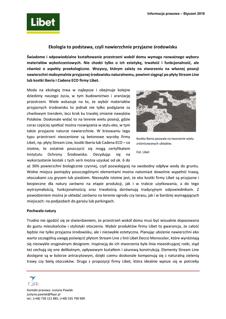 Informacja prasowa – Styczeń 2016 Ekologia to podstawa, czyli nawierzchnie przyjazne środowisku Świadome i odpowiedzialne kształtowanie przestrzeni wokół domu wymaga rozważnego wyboru materiałów wykończeniowych. Nie chodzi tylko o ich estetykę, trwałość i funkcjonalność, ale również o aspekty proekologiczne. Wszyscy, którym zależy na stworzeniu na własnej posesji nawierzchni maksymalnie przyjaznej środowisku naturalnemu, powinni sięgnąć po płyty Stream Line lub kostki Iberia i Cadena ECO firmy Libet. Moda na ekologię trwa w najlepsze i obejmuje kolejne dziedziny naszego życia, w tym budownictwo i aranżację przestrzeni. Wiele wskazuje na to, że wybór materiałów przyjaznych środowisku to jednak nie tylko podążanie za chwilowym trendem, lecz krok ku trwałej zmianie nawyków Polaków. Doskonale widać to na terenie wielu posesji, gdzie coraz częściej spotkać można rozwiązania w stylu eko, w tym także przyjazne naturze nawierzchnie. W kreowaniu tego typu przestrzeni nieocenione są betonowe wyroby firmy Kostka Iberia pozwala na tworzenie wielu Libet, np. płyty Stream Line, kostki Iberia lub Cadena ECO – co zróżnicowanych układów. istotne, te ostatnie poszczycić się mogą certyfikatem Fot. Libet Instytutu Ochrony Środowiska. Decydując się na wykorzystanie kostek z tych serii można uzyskać od ok. 6 do aż 36% powierzchni biologicznie czynnej, czyli pozwalającej na swobodny odpływ wody do gruntu. Wolne miejsca pomiędzy poszczególnymi elementami można natomiast dowolnie wypełnić trawą, otoczakami czy grysem lub piaskiem. Niezwykle istotne jest, że eko kostki firmy Libet są przyjazne i bezpieczne dla natury zarówno na etapie produkcji, jak i w trakcie użytkowania, a do tego wytrzymałością, funkcjonalnością oraz trwałością dorównują tradycyjnym odpowiednikom. Z powodzeniem można je układać zarówno na terenie ogrodu czy tarasu, jak i w bardziej wymagających miejscach: na podjazdach do garażu lub parkingach. Pochwała natury Trudno nie zgodzić się ze stwierdzeniem, że przestrzeń wokół domu musi być wizualnie dopasowana do gustu mieszkańców i stylistyki otoczenia. Wybór produktów firmy Libet to gwarancja, że całość będzie nie tylko przyjazna środowisku, ale i niezwykle estetyczna. Planując ułożenie nawierzchni eko warto szczególną uwagę poświęcić płytom Stream Line z linii Libet Decco Monocolor, które wyróżniają się niezwykle oryginalnym designem. Inspiracją do ich stworzenia była linia meandrującej rzeki, stąd też cechują się one delikatnym, opływowym kształtem i ażurową konstrukcją. Elementy Stream Line dostępne są w kolorze antracytowym, dzięki czemu doskonale komponują się z naturalną zielenią trawy czy bielą otoczaków. Druga z propozycji firmy Libet, która idealnie wpisze się w potrzeby Kontakt prasowy: Justyna Pawlak [email protected] tel.: (+48) 730 121 885, (+48) 535 790 909 Informacja prasowa – Styczeń 2016 miłośników ekologicznych rozwiązań to Cadena ECO. W skład tej linii wchodzą cztery różne elementy (dwa pełne i dwa ażurowe), doskonale się uzupełniające i wspólnie tworzące harmonijną całość. Kostki Cadena ECO z linii Libet Decco Monocolor oraz Libet Classic wyróżnia innowacyjny, organiczny kształt, który pozwala na układanie z nich luźnych nieregularnych ścieżek, a także bardziej zwartych kompozycji. Z myślą o spełnieniu ekologicznych standardów stworzono także Iberię w kolorze antracytowym (linia Libet Decco Monocolor). Ta niepozorna, betonowa kostka przypomina wyglądem podkowę, przez co daje niemal nieograniczone możliwości aranżacyjne. W zależności od potrzeb i indywidualnych preferencji można ułożyć ją tak, by uzyskać od kilku do aż kilkudziesięciu procent Ażurowa forma płyty Stream Line z linii powierzchni biologicznie czynnej. Dzięki temu Iberia może Libet Decco Monocolor w połączeniu śmiało poszczycić się mianem produktu maksymalnie z intrygującym kolorem antracytowym pozwoli stworzyć bardzo efektowną, ale przyjaznego środowisku. i ekologiczną nawierzchnię. Fot. Libet Więcej informacji na temat produktów firmy Libet znaleźć można na stronie www.libet.pl, a po więcej inspiracji zapraszamy na bloga: www.natarasie.com. Płyta nawierzchniowa Stream Line z linii Libet Decco Monocolor, kolor antracytowy Wymiary: 32,7x54,7x10 cm Cena brutto: 17,22 zł/szt. Kostka Iberia z linii Libet Decco Monocolor, kolor antracytowy Wymiary: 20x30x10x8 cm Cena brutto: 2,71 zł/szt. Kostki Cadena ECO z linii Libet Decco Monocolor, kolor antracytowy Wymiary: 17,5x53,1x8 cm Cena brutto: 8,24 zł/szt. Kontakt prasowy: Justyna Pawlak [email protected] tel.: (+48) 730 121 885, (+48) 535 790 909 Informacja prasowa – Styczeń 2016 Wymiary: 17,5x17,5x8 cm Cena brutto: 2,83 zł/szt. Wymiary: 17,5x53,1x12 cm (ażur) Cena brutto: 9,35 zł/szt. Wymiary: 17,5x17,5x12 cm Cena brutto: 3,08 zł/szt. Koski Cadena ECO z linii Libet Classic, kolor szary Wymiary: 17,5x53,1x8 cm Cena brutto: 7,01 zł/szt. Wymiary: 17,5x17,5x8 cm Cena brutto: 2,34 zł/szt. Wymiary: 17,5x53,1x12 cm (ażur) Cena brutto: 8,12 zł/szt. Wymiary: 17,5x17,5x12 cm Cena brutto: 2,71 zł/szt. -------------------------------------------------------------------------------------------------------------------------------------Libet S.A. to lider w segmencie kostek Premium i innych betonowych materiałów nawierzchniowych na polskim rynku. Pełniąc rolę trendesettera wyznacza kierunki rozwoju rynku. Produkty sygnowane marką Libet wyróżniają się nie tylko doskonałymi parametrami technicznymi, ale również innowacyjnością i ciekawym wzornictwem. W równym stopniu stają się ozdobą posesji prywatnych, jak i przestrzeni publicznych. Wysoki poziom jakościowy i estetyczny wyrobów wrocławskiej firmy jest zasługą m.in. nowoczesnego parku maszynowego oraz wykorzystywania najnowszych technologii i odpowiednio selekcjonowanych surowc