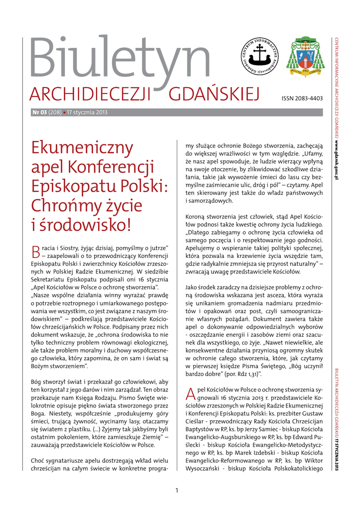 Nr 03 (208) • 17 stycznia 2013 Ekumeniczny apel Konferencji Episkopatu Polski: Chrońmy życie i środowisko! B my służące ochronie Bożego stworzenia, zachęcają do większej wrażliwości w tym względzie. „Ufamy, że nasz apel spowoduje, że ludzie wierzący wpłyną na swoje otoczenie, by zlikwidować szkodliwe działania, takie jak wywożenie śmieci do lasu czy bezmyślne zaśmiecanie ulic, dróg i pól” – czytamy. Apel ten skierowany jest także do władz państwowych i samorządowych. Centrum Informacyjne Archidiecezji Gdańskiej www.gdansk.gosc.pl ISSN 2083-4403 Koroną stworzenia jest człowiek, stąd Apel Kościołów podnosi także kwestię ochrony życia ludzkiego. „Dlatego zabiegamy o ochronę życia człowieka od samego poczęcia i o respektowanie jego godności. Apelujemy o wspieranie takiej polityki społecznej, która pozwala na krzewienie życia wszędzie tam, gdzie radykalnie zmniejsza się przyrost naturalny” – zwracają uwagę przedstawiciele Kościołów. Jako środek zaradczy na dzisiejsze problemy z ochroną środowiska wskazana jest asceza, która wyraża się unikaniem gromadzenia nadmiaru przedmiotów i opakowań oraz post, czyli samoograniczanie własnych pożądań. Dokument zawiera także apel o dokonywanie odpowiedzialnych wyborów - oszczędzanie energii i zasobów ziemi oraz szacunek dla wszystkiego, co żyje. „Nawet niewielkie, ale konsekwentne działania przyniosą ogromny skutek w ochronie całego stworzenia, które, jak czytamy w pierwszej księdze Pisma Świętego, „Bóg uczynił bardzo dobre” (por. Rdz 1,31)”. Bóg stworzył świat i przekazał go człowiekowi, aby ten korzystał z jego darów i nim zarządzał. Ten obraz przekazuje nam Księga Rodzaju. Pismo Święte wielokrotnie opisuje piękno świata stworzonego przez Boga. Niestety, współcześnie „produkujemy góry śmieci, trującą żywność, wycinamy lasy, otaczamy się światem z plastiku. (...) Żyjemy tak jakbyśmy byli ostatnim pokoleniem, które zamieszkuje Ziemię” – zauważają przedstawiciele Kościołów w Polsce. A pel Kościołów w Polsce o ochronę stworzenia sygnowali 16 stycznia 2013 r. przedstawiciele Kościołów zrzeszonych w Polskiej Radzie Ekumenicznej i Konferencji Episkopatu Polski: ks. prezbiter Gustaw Cieślar - przewodniczący Rady Kościoła Chrześcijan Baptystów w RP, ks. bp Jerzy Samiec - biskup Kościoła Ewangelicko-Augsburskiego w RP, ks. bp Edward Puślecki - biskup Kościoła Ewangelicko-Metodystycznego w RP, ks. bp Marek Izdebski - biskup Kościoła Ewangelicko-Reformowanego w RP, ks. bp Wiktor Wysoczański - biskup Kościoła Polskokatolickiego Choć sygnatariusze apelu dostrzegają wkład wielu chrześcijan na całym świecie w konkretne progra- 1 Biuletyn Archidiecezji Gdańskiej 17 stycznia 2013 racia i Siostry, żyjąc dzisiaj, pomyślmy o jutrze” – zaapelowali o to przewodniczący Konferencji Episkopatu Polski i zwierzchnicy Kościołów zrzeszonych w Polskiej Radzie Ekumenicznej. W siedzibie Sekretariatu Episkopatu podpisali oni 16 stycznia „Apel Kościołów w Polsce o ochronę stworzenia”. „Nasze wspólne działania winny wyrażać prawdę o potrzebie roztropnego i umiarkowanego postępowania we wszystkim, co jest związane z naszym środowiskiem” – podkreślają przedstawiciele Kościołów chrześcijańskich w Polsce. Podpisany przez nich dokument wskazuje, że „ochrona środowiska to nie tylko techniczny problem równowagi ekologicznej, ale także problem moralny i duchowy współczesnego człowieka, który zapomina, że on sam i świat są Bożym stworzeniem”. Centrum Informacyjne Archidiecezji Gdańskiej www.gdansk.gosc.pl nr 03 (208) Plan nabożeństw: w RP, ks. bp Ludwik Jabłoński - biskup Naczelny Kościoła Starokatolickiego Mariawitów w RP, Metropolita Sawa - prawosławny Metropolita Warszawski i Całej Polski, ks. abp Józef Michalik - przewodniczący Konferencji Episkopatu Polski. Uroczyste podpisanie odbyło się w siedzibie Konferencji Episkopatu Polski w Warszawie. 18.01.2013 (piątek) – Kościół Ewangelicko-Metodystyczny ►► Gdańsk-Wrzeszcz, ul. Pniewskiego 8 – godz. 17.00. 19.01.2013 (sobota) – Kościół Prawosławny p.w. św. Mikołaja ►►Gdańsk-Wrzeszcz, ul. Traugutta 45 – godz. 17.00. Tydzień Powszechnej Modlitwy o Jedność Chrześcijan 20.01.2013 (niedziela) – Kościół Polskokatolicki p.w. św. Bożego Ciała ►►Gdańsk, ul. 3 Maja 19 – godz. 18.00. 22.01.2013 (wtorek) – Kościół Rzymskokatolicki p.w. Św. Ignacego ►►Gdańsk-Stare Szkot, ul. Brzegi 49 – godz. 18.30. Homilia Bp Marcin Hintz. 23.01.2013 (środa) – Kościół Ewangelicko-Augsburski ►►Sopot, skwer ks. O Bowiena 5 - godz. 18.00 Homilia Abp Sławoj Leszek Głódź Biuletyn Archidiecezji Gdańskiej 17 stycznia 2013 J ak podaje KEP hasłem tegorocznego Tygodnia Modlitw o Jedność Chrześcijan są słowa z Księgi proroka Micheasza „Czego Bóg od nas oczekuje?”. 24.01.2013 (czwartek) – Kościół Chrześcijan Baptystów ►►Sopot, ul. Chopina 32 – godz. 18.00. Jako element przewodni tygodnia wybrano motyw wędrówki. Wskazuje on na dynamikę chrześcijańskiego bycia uczniem, nawiązuje też do hasła Dziesiątego Zgromadzenia Światowej Rady Kościołów, które odbędzie się w Busan w Korei w 2013 r. Brzmi ono „Bóg życia prowadzi nas do sprawiedliwości i pokoju”. 25.01.2013 (piątek) – Centrum Ekumeniczne św. Brygidy ►►Gdańsk ul. Polanki 124 – godz. 18.00. Modlitwa o pokój z przedstawicielami innych religii. Materiały, z których można korzystać przez cały rok, przygotowują tym razem chrześcijanie z Indii. Polską wersję materiałów przygotował ekumeniczny zespół redakcyjny powołany przez Komisję ds. Dialogu między Polską Radą Ekumeniczną o Konferencją Episkopatu Polski. Komisji obecnie współprzewodniczą: abp Jeremiasz (Kościół Prawosławny) i bp Krzysztof Nitkiewicz (Kościół Rzymskokatolicki). /-/ Ks. Dariusz