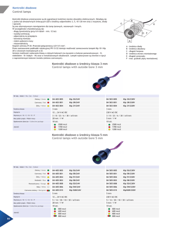 kontrolki diodowe control lamps kontrolki diodowe przeznaczone są do sygnalizacji świetlnej stanów obwodów elektrycznych. Składają się z jedno lub dwubarwnych świecących LeD o średnicy odpowiednio 3, 5, 10 i 20 mm oraz z rezystora, diody i oprawki. Są one alternatywnym rozwiązaniem dla lamp żarowych, neonowych i innych. W szczególności charakteryzują się: · długą żywotnością (przy 6 h/dzień - min. 12 lat) · wysoką luminacją · odpornością na przepięcia · łatwością montażu · niskim poborem mocy · niezawodnością Stopień ochrony ip 20. przewód połączeniowy LGy 0.5 mm2. przez zastosowanie podkładki redukcyjnej pR 13/22 istnieje możliwość zamocowania lampek klp 10 i klp 20 w otworach montażowych ø 22. istnieje możliwość wykonania kloszy o różnych kolorach (na życzenie w kolorze pomarańczowym - O, niebieskim - B i białym - W) oraz w metalizowanych obudowach. Lampki wykonywane są również w opcji z naprzemiennym kolorem światła (zielono-czerwonym). E D F a - średnica diody B - średnica obudowy c - długość korpusu D - średnica otworu montażowego e - długość przewodu f - max. grubość płyty montażowej kontrolki diodowe o średnicy klosza 3 mm control lamps with outside bore 3 mm Nr kat.- kolor / No. cat.- colour Zielony / Green 84 403 005 Klp 3G/24V 84 503 005 Klp 3G/230V czerwony / Red 84 403 001 Klp 3R/24V 84 503 001 Klp 3R/230V Żółty / yellow 84 403 004 Klp 3Y/24V 84 503 004 Klp 3Y/230V Średnica klosza 3 mm 3 mm Napięcie 12 … 24 V ac/Dc 230 V ac/Dc Wymiary a / B / c / D / e / f Max pobór prądu / pobór mocy 3 / 8 / 23 / 6 / 30 / ø 8 mm 20 ma / 1 W 3 / 8 / 23 / 6 / 30 / ø 8 mm 5 ma / 1 W Opakowanie zbiorcze / collective package 10 szt. 10 szt. 2500 mcd 1700 mcd 1200 mcd jasność 2500 mcd 1700 mcd 1200 mcd kontrolki diodowe o średnicy klosza 5 mm control lamps with outside bore 5 mm Nr kat.- kolor / No. cat.- colour 84 405 005 Klp 5G/24V 84 505 005 Klp 5G/230V 84 405 001 Klp 5R/24V 84 505 001 Klp 5R/230V Żółty / yellow 84 405 004 Klp 5Y/24V 84 505 004 Klp 5Y/230V Niebieski / Blue 84 405 003 Klp 5B/24V 84 505 003 Klp 5B/230V pomarańczowy / Orange 84 405 008 Klp 5O/24V 84 505 008 Klp 5O/230V Biały / White 84 405 006 Klp 5W/24V 84 505 006 Klp 5W/230V czerwono-zielony / Red-green 84 405 015 Klp 5GR/24V 84 505 015 Klp5GR/230V Średnica klosza 5 mm 5 mm Napięcie 12 … 24 V ac/Dc 230 V ac/Dc Wymiary a / B / c / D / e / f Max pobór prądu / pobór mocy 5 / 14 / 30 / 10 / 30 / ø 8 mm 20 ma / 1 W 5 / 14 / 30 / 10 / 30 / ø 8 mm 5 ma / 1 W Opakowanie zbiorcze / collective package 10 szt. 10 szt. jasność 80 Zielony / Green czerwony / Red 800 mcd 600 mcd 800 mcd 800 mcd 800 mcd 600 mcd 800 mcd 800 mcd