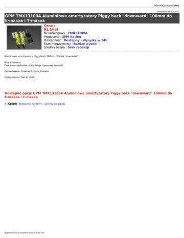 Informacje o produkcie Utworzono 08-03-2017 GPM TMX13100A Aluminiowe amortyzatory Piggy back "downward" 100mm do E-maxxa i T-maxxa Cena : 91,24 zł Nr katalogowy : TMX13100A Producent : GPM Racing Dostępność : Dostępny - Wysyłka w 24h Stan magazynowy : bardzo wysoki Średnia ocena : brak recenzji Aluminiowe amortyzatory piggy back 100mm. Wersja "downward". W opakowaniu: Para amortyzatorów, śruby tuleje i gumowe kapturki. Zastosowanie: Traxxas T-maxx, E-maxx Kod produktu: TMX13100A Dostępne opcje GPM TMX13100A Aluminiowe amortyzatory Piggy back "downward" 100mm do E-maxxa i T-maxxa » Kolor: Niebieski, Srebrny, Ciemny niebieski. Wygenerowano w programie www.oscGold.com