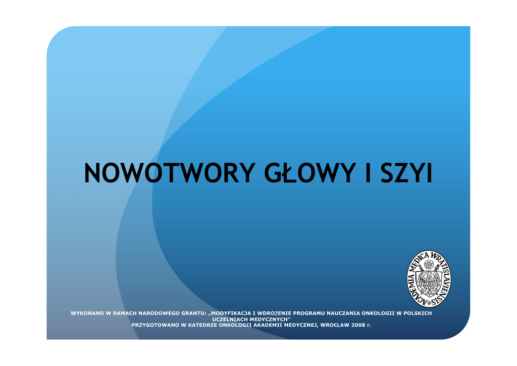 NOWOTWORY GŁOWY I SZYI WYKONANO W RAMACH NARODOWEGO GRANTU: „MODYFIKACJA I WDROŻENIE PROGRAMU NAUCZANIA ONKOLOGII W POLSKICH UCZELNIACH MEDYCZNYCH” PRZYGOTOWANO W KATEDRZE ONKOLOGII AKADEMII MEDYCZNEJ, WROCŁAW 2008 r. Wg L. Phillips. Textbook of Radiation Oncology. Sec. Edit. REGION GŁOWY I SZYI y OBSZAR JAMY USTNEJ: wargi, policzki, przednia część języka, dno jamy ustnej, podniebienie twarde, dziąsła dolne i górne, trójkąty zatrzonowcowe y OBSZAR GARDŁA: nosogardło, gardło środkowe (migdałki podniebienne, nasada języka, podniebienie miękkie, tylna ściana gardła), gardło dolne (zachyłki gruszkowate, okolica zapierścienna, dolnoboczne ściany gardła, dołki językowonagłośniowe) Wg L. Phillips. Textbook of Radiation Oncology. Sec. Edit. REGION GŁOWY I SZYI y OBSZAR KRTANI: okolica nadgłośniowa, głośnia, okolica podgłośniowa y OBSZAR JAMY NOSOWEJ I ZATOK PRZYNOSOWYCH – zatoki szczękowe, sitowe, czołowe i klinowa y OBSZAR GRUCZOŁÓW ŚLINOWYCH: ślinianki przyuszne, podżuchwowe, podjęzykowe i drobne gruczoły ślinowe błony śluzowej podniebienia Wg L. Phillips. Textbook of Radiation Oncology. Sec. Edit. Wg L. Phillips. Textbook of Radiation Oncology. Sec. Edit. EPIDEMIOLOGIA y Ponad 6% wszystkich nowotworów u ludzi y Są przyczyną około 5% zgonów nowotworowych y Rak krtani – najczęściej – zapadalność i umieralność - 6-7 miejsce u mężczyzn y M:K = 5:1 y M:K = 10:1 - rak krtani EPIDEMIOLOGIA W POLSCE y Nowotwory głowy i szyi stanowiły 4,5% zachorowań (5732 / 126019) – w 2006r y U mężczyzn – 7,2% zachorowań (4605 / 64092) y U kobiet – 1,8% zachorowań (1127 / 61 927) y W 2006 r było 3857 zgonów na te nowotwory – co stanowi 4,2% wszystkich zgonów na nowotwory y 6,1% zgonów u mężczyzn i 1,7% zgonów u kobiet EPIDEMIOLOGIA W POLSCE y Zachorowania: współczynnik płci - 4:1 mężczyzn: kobiet y Krtań – 41% - sex ratio – 7:1 y Jama ustna – 27% zachorowań – sex ratio – 3:1 y Gardło – 24% zachorowań – sex ratio – 4:1 y Gruczoły ślinowe – 4,5% zachorowań – sex ratio – 1:1 y Jama nosowa + zatoki – 3,5% zachorowań – sex ratio 1:1 EPIDEMIOLOGIA y 50% to nowotwory krtani i krtaniowej części gardła y Współczynnik zachorowalności u mężczyzn: Polska 13.3/100 000 Najwyższy Węgry 20.1, Hiszpania 20.7, Chorwacja 21.2 Najniższy: Irlandia 4.6, Finlandia 4.4, Szwecja3.7 EPIDEMIOLOGIA y 5,1% krtań y 0,4% dno jamy ustnej y 1,4% warga y 0,3% gardło dolne y 0,7% język y 0,2% ślinianki y 0,6% gardło środkowe (migdałek) y 0,2% jamy nosowe, ucho, zatoki y 0,2% nosogardło ETIOLOGIA y Palenie papierosów – palacze mają 15 –20 krotnie większe ryzyko zachorowania y Nadużywanie alkoholu y Zanieczyszczenia powietrza y Przewlekłe stany zapalne y Zaniedbania higieniczne y Niewłaściwie dobrane protezy ETIOLOGIA y RAK WARGI – narażenie na promienie słoneczne y RAK NOSA I ZATOK PRZYNOSOWYCH – narażenie na nikiel i pył drzewny y RAK NOSOGARDŁA – predyspozycje genetyczne (HLA), wirus Epsteina –Barr, spożywanie wędzonych ryb i warzyw, inne czynniki środowiskowe (płd-wsch Chiny) ETIOLOGIA y Obszary karcinogenezy: przekształcenie prawidłowej błony śluzowej w raka pod wpływem czynników karcinogennych z reguły przebiega wieloetapowo poprzez dysplazję i raka nieinwazyjnego y Mnogie nowotwory synchroniczne lub metachroniczne w tym regionie występują w 15 – 25% przypadków (prawdopodobieństwo drugiego nowotworu u wyleczonych pacjentów -3 -5% na rok) ETIOLOGIA Nowotworom nabłonkowym często towarzyszą zaburzenia molekularne: y Mutacje genów supresorowych (np. TP53) y Sekwencje mikrosatelitarne (mutacje genów missmatch repair) y Nadekspresja i mutacje receptora EGFR y Amplifikacja niektórych onkogenów (bcl-1) STANY PRZEDRAKOWE y Rogowacenie białe – leukoplakie – około 30% raków rozwija się na podłożu leukoplakii, przemiana złośliwa 10-36% y Rogowacenie czerwone – erytroplakia, przemiana złośliwa 50% y Nadmierne rogowacenie - hiperkeratoza y Pachydermia krtani y Brodawczaki krtani y Dysplazja HISTOPATOLOGIA y Nowotwory nabłonkowe – Ca planoepitheliale - 85-95% y Raki z komórek przejściowych – Ca transitionale (pierścień Waldeyera) y Raki z komórek nabłonka naczyń chłonnych – Lymphoepithelioma - (pierścień Waldeyera) y Raki gruczołowe – Adenocarcinoma – (gruczoły ślinowe) HISTOPATOLOGIA y Nowotwory rozwijające się z tkanki limfatycznej – chłoniaki i ziarnice – Lymphoma malignum, Lymphogranulomatosis maligna y Szpiczak - Plasmocytoma y Nowotwory rozwijające się z tkanek mezenchymalnych – mięsaki – Sarcoma y Nowotwory z pozostałości struny grzbietowej y Czerniak złosliwy – Melanoma malignum y Guzy pochodzenia neuroektodermalnego HISTOPATOLOGIA - GUZY ŚLINIANEK y Guz mieszany – mixed tumor, pleomorphic adenoma – miejscowo złośliwy y Guz Warthina – adenolymhomata – łagodny y Gruczolak onkocytarny - oncocytoma - łagodny HISTOPATOLOGIA - RAKI ŚLINIANEK y LOW GRADE - 80-90% 5- LETNICH PRZEŻYĆ 1. rak zrazikowokomórkowy – acinic cell carcinoma 2. raki śluzowonaskórkowe wysoko dojrzałe – low grade mucoepidermoid carcinoma y HIGH GRADE – 50% - 5 LETNICH PRZEŻYĆ 1. raki śluzowonaskórkowe nisko dojrzałe – high grade mucoepidermoid carcinoma 2. rak gruczołowato- torbielowaty – adenoid cystic carcinoma 3. gruczolakorak - adenocarcinoma BIOLOGIA NOWOTWORÓW y Naciekanie miejscowe y Przerzuty do węzłów chłonnych (różne powinowactwo w zależności od lokalizacji ogniska pierwotnego) y Przerzuty odległe (płuca, kości) – różnicowanie z drugim ogniskiem nowotworu tytoniozależnego WĘZŁY CHŁONNE SZYI I –podżuchwowe, podbródkowe II –szyjne głębokie górne III –szyjne głębokie środkowe IV –szyjne głębokie dolne V –szyje tylne VI –przednie przedtchawicze, Wg Gregoire et al..Clin Target Volumes in Conf…. okołotchawicze, węzeł delficki, okołotarczowe ROZP