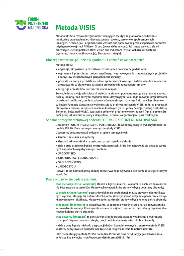 FORUM PRZESTRZENI MAŁOPOLSKA Metoda VISIS Metoda VISIS to zestaw narzędzi umożliwiających efektywne planowanie, wdrażanie, monitoring oraz ewaluację zrównoważonego rozwoju, zarówno w społecznościach lokalnych, firmach, jak i organizacjach. Została ona opracowana przez ekspertów i doradców międzynarodowej sieci AtKisson Group (www.atkisson.com). Jej nazwa wywodzi się od pierwszych liter angielskich słów: Vision and Indicators (wizja i wskaźniki), Systems (systemy), Innovation (innowacje), Strategy (strategia). Dlaczego warto wziąć́ udział w spotkaniu i poznać́ nowe narzędzie? Metoda VISIS: • angażuje, aktywizuje uczestników i inspiruje ich do wspólnego działania; • usprawnia i przyspiesza proces wspólnego wypracowywania innowacyjnych projektów i pomysłów w różnorodnych grupach interesariuszy; • pozwala na pracę z przedstawicielami społeczności lokalnych i ułatwia budowanie ich zaangażowania w planowane działania prowadzać do rzeczywistej zmiany; • integruje uczestników i wzmacnia ducha zespołu. Ze względu na swoje właściwości metoda ta stanowi pomocne narzędzie pracy ze społecznością̨ lokalną, nad różnymi zagadnieniami dotyczącymi lokalnego rozwoju, projektowania przestrzeni publicznej, czy też szukania zrównoważonych rozwiązań złożonych problemów. W Polsce Fundacja Sendzimira wykorzystuje w praktyce narzędzia VISIS, m.in. w procesach planowania rozwoju ze społecznościami lokalnymi (m.in. gminy Zawoja, Suchej Beskidzkiej, Zielonek, Solca nad Wisłą), tworzenia gminnych programów rewitalizacji (np. dla gminy Środa Śląska) jak również̇ w pracy z ekspertami, firmami i organizacjami pozarządowymi. Schemat pracy warsztatowej podczas FORUM PRZESTRZENI. MAŁOPOLSKA Uczestnicy FORUM PRZESTRZENI. MAŁOPOLSKA doświadczą pracy z wykorzystaniem narzędzia PIRAMIDA – jednego z narzędzi metody VISIS. Uczestnicy będą pracować w dwóch grupach tematycznych: • Grupa 1. Miejskie ekosystemy • Grupa 2. Aktywność dla przestrzeni, przestrzeń do działania Każda z grup pracować będzie w czterech zespołach, które koncentrować się będą na wybranych aspektach rozpatrywanego problemu: • ŚRODOWISKO • GOSPODARKA I FINANSOWANIE • SPOŁECZEŃSTWO • JAKOŚĆ ŻYCIA Pozwoli to na kompleksową analizę rozpatrywanego wyzwania bez pomijania jego istotnych aspektów. Praca odbywać się będzie etapami: Etap pierwszy (wizja i wskaźniki) stanowić będzie analiza – w oparciu o osobiste doświadczenia i obserwacje uczestników kluczowych wyzwań, które stanowić będą podstawę piramidy; W etapie drugim (systemy) uczestnicy dokonają pogłębionej analizy przyczyn zidentyfikowanych wyzwań, starając się dotrzeć do ich źródła, zidentyfikować wzajemne powiązania, związki przyczynowo - skutkowe. Kluczowe pętle, zależności stanowić będą kolejne piętro piramidy. Etap trzeci (innowacje) to poszukiwanie, w oparciu o wcześniejsze analizy, rozwiązań dla wprowadzenia zmiany. Rozwiązania uznane za najbardziej skuteczne zostaną zapisane stanowiąc kolejne piętro piramidy. Etap czwarty (strategia) to poszukiwanie najlepszych sposobów wdrażania wybranych rozwiązań. Wypracowane strategie, drogi dojścia stanowią wierzchołek piramidy. Każda z grup będzie miała do dyspozycji dwóch licencjonowanych trenerów metody VISIS, w którzy będą również posiadać wiedzę ekspercką w zakresie tematu warsztatu. Film prezentujący metodę VISIS i narzędzie Piramida oraz przykłady jego zastosowania w Polsce i na świecie: http://www.sendzimir.org.pl/ISIS_film