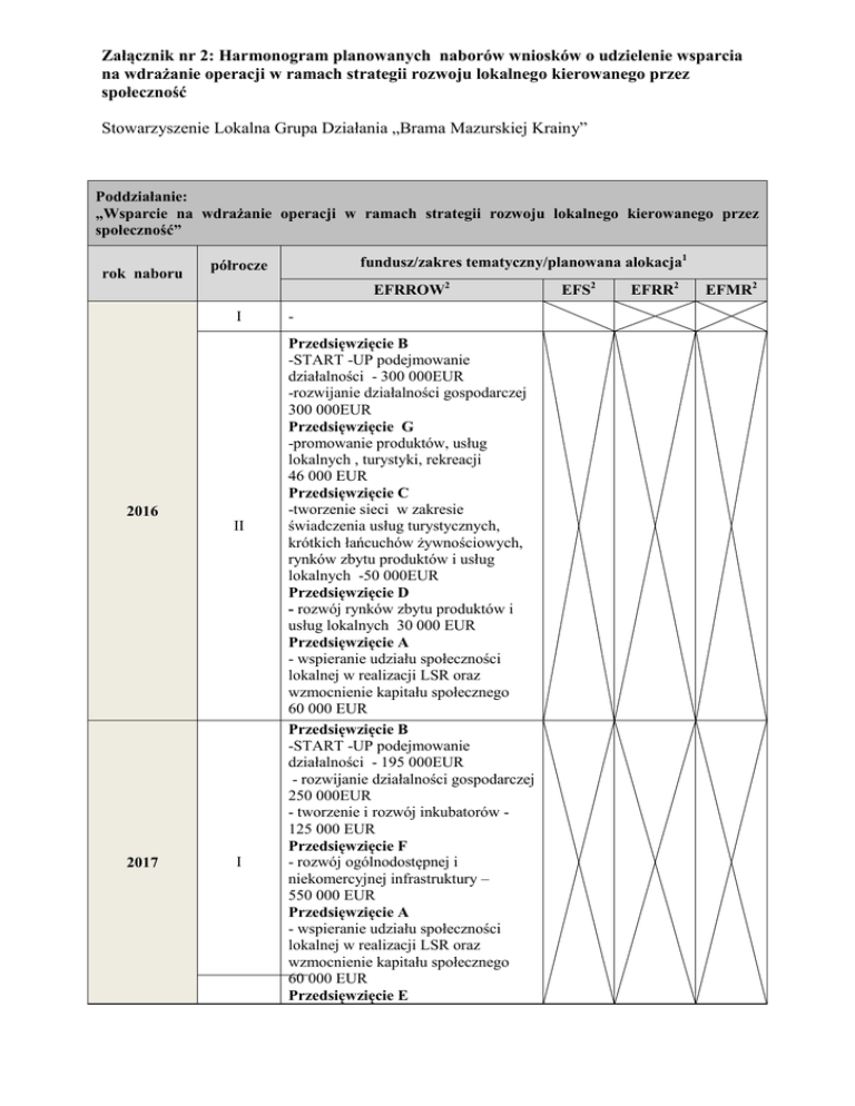 Załącznik nr 2: Harmonogram planowanych naborów wniosków o udzielenie wsparcia na wdrażanie operacji w ramach strategii rozwoju lokalnego kierowanego przez społeczność Stowarzyszenie Lokalna Grupa Działania „Brama Mazurskiej Krainy” Poddziałanie: „Wsparcie na wdrażanie operacji w ramach strategii rozwoju lokalnego kierowanego przez społeczność” rok naboru fundusz/zakres tematyczny/planowana alokacja1 półrocze EFRROW2 I 2016 II 2017 1 I Przedsięwzięcie B -START -UP podejmowanie działalności - 300 000EUR -rozwijanie działalności gospodarczej 300 000EUR Przedsięwzięcie G -promowanie produktów, usług lokalnych , turystyki, rekreacji 46 000 EUR Przedsięwzięcie C -tworzenie sieci w zakresie świadczenia usług turystycznych, krótkich łańcuchów żywnościowych, rynków zbytu produktów i usług lokalnych -50 000EUR Przedsięwzięcie D - rozwój rynków zbytu produktów i usług lokalnych 30 000 EUR Przedsięwzięcie A - wspieranie udziału społeczności lokalnej w realizacji LSR oraz wzmocnienie kapitału społecznego 60 000 EUR Przedsięwzięcie B -START -UP podejmowanie działalności - 195 000EUR - rozwijanie działalności gospodarczej 250 000EUR - tworzenie i rozwój inkubatorów 125 000 EUR Przedsięwzięcie F - rozwój ogólnodostępnej i niekomercyjnej infrastruktury – 550 000 EUR Przedsięwzięcie A - wspieranie udziału społeczności lokalnej w realizacji LSR oraz wzmocnienie kapitału społecznego 60 000 EUR Przedsięwzięcie E EFS2 EFRR2 EFMR2 -zachowanie dziedzictwa lokalnego – renowacja zabytków 75 000 EUR Przedsięwzięcie G - promowanie produktów, usług lokalnych , turystyki, rekreacji 45 500 EUR II - I Przedsięwzięcie F - rozwój ogólnodostępnej i niekomercyjnej infrastruktury – 137 500 EUR Przedsięwzięcie G - promowanie produktów, usług lokalnych , turystyki, rekreacji 46 000 EUR II - I Przedsięwzięcie B -START -UP podejmowanie działalności - 75 000 EUR -rozwijanie działalności gospodarczej 61 250 EUR Przedsięwzięcie E -zachowanie dziedzictwa lokalnego – renowacja zabytków 50 000 EUR Przedsięwzięcie C tworzenie sieci w zakresie świadczenia usług turystycznych, krótkich łańcuchów żywnościowych, rynków zbytu produktów i usług lokalnych -25 000EUR II - I Przedsięwzięcie A - wspieranie udziału społeczności lokalnej w realizacji LSR oraz wzmocnienie kapitału społecznego 60 000 EUR Przedsięwzięcie D - rozwój rynków zbytu produktów i usług lokalnych 20 000 EUR 2018 2019 2020 II I 2021 II I 2022 II I 2023 II Przedsięwzięcie A - wspieranie udziału społeczności lokalnej w realizacji LSR oraz wzmocnienie kapitału społecznego 51 250 EUR