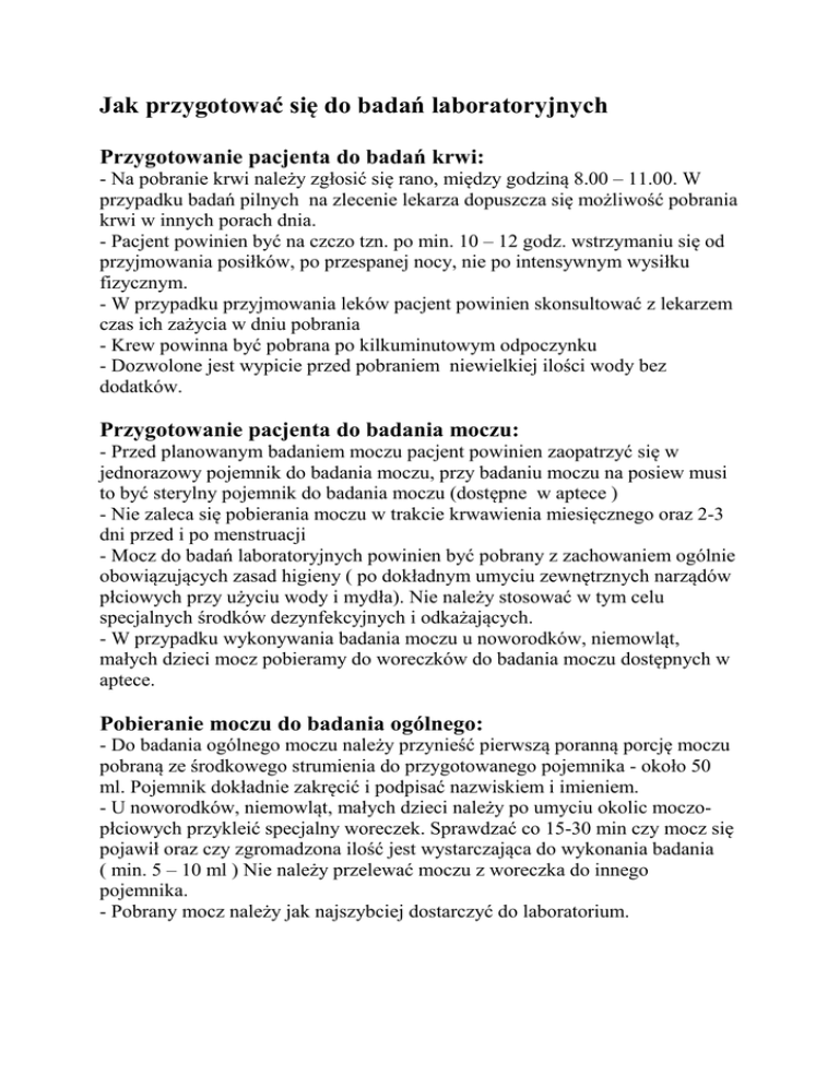 Jak przygotować się do badań laboratoryjnych Przygotowanie pacjenta do badań krwi: - Na pobranie krwi należy zgłosić się rano, między godziną 8.00 – 11.00. W przypadku badań pilnych na zlecenie lekarza dopuszcza się możliwość pobrania krwi w innych porach dnia. - Pacjent powinien być na czczo tzn. po min. 10 – 12 godz. wstrzymaniu się od przyjmowania posiłków, po przespanej nocy, nie po intensywnym wysiłku fizycznym. - W przypadku przyjmowania leków pacjent powinien skonsultować z lekarzem czas ich zażycia w dniu pobrania - Krew powinna być pobrana po kilkuminutowym odpoczynku - Dozwolone jest wypicie przed pobraniem niewielkiej ilości wody bez dodatków. Przygotowanie pacjenta do badania moczu: - Przed planowanym badaniem moczu pacjent powinien zaopatrzyć się w jednorazowy pojemnik do badania moczu, przy badaniu moczu na posiew musi to być sterylny pojemnik do badania moczu (dostępne w aptece ) - Nie zaleca się pobierania moczu w trakcie krwawienia miesięcznego oraz 2-3 dni przed i po menstruacji - Mocz do badań laboratoryjnych powinien być pobrany z zachowaniem ogólnie obowiązujących zasad higieny ( po dokładnym umyciu zewnętrznych narządów płciowych przy użyciu wody i mydła). Nie należy stosować w tym celu specjalnych środków dezynfekcyjnych i odkażających. - W przypadku wykonywania badania moczu u noworodków, niemowląt, małych dzieci mocz pobieramy do woreczków do badania moczu dostępnych w aptece. Pobieranie moczu do badania ogólnego: - Do badania ogólnego moczu należy przynieść pierwszą poranną porcję moczu pobraną ze środkowego strumienia do przygotowanego pojemnika - około 50 ml. Pojemnik dokładnie zakręcić i podpisać nazwiskiem i imieniem. - U noworodków, niemowląt, małych dzieci należy po umyciu okolic moczopłciowych przykleić specjalny woreczek. Sprawdzać co 15-30 min czy mocz się pojawił oraz czy zgromadzona ilość jest wystarczająca do wykonania badania ( min. 5 – 10 ml ) Nie należy przelewać moczu z woreczka do innego pojemnika. - Pobrany mocz należy jak najszybciej dostarczyć do laboratorium. Pobieranie moczu na posiew: - Na posiew pobieramy mocz do sterylnego jednorazowego pojemnika lub woreczka ( w przypadku małych dzieci) - Do badania należy przynieść pierwszą poranną porcję moczu pobraną ze środkowego strumienia do przygotowanego sterylnego pojemnika - około 10 ml. Pojemnik dokładnie zakręcić i podpisać nazwiskiem i imieniem - U noworodków, niemowląt, małych dzieci należy po umyciu okolic moczowopłciowych przykleić specjalny woreczek. Sprawdzać co 15-30 min czy mocz się pojawił oraz czy zgromadzona ilość jest wystarczająca do wykonania badania ( min. 5 ml ) Nie należy przelewać moczu z woreczka do innego pojemnika. - Pobrany mocz należy jak najszybciej dostarczyć do laboratorium. Przygotowanie pacjenta do badania dobowej zbiórki moczu: Przed przystąpieniem do wykonywania badania należy zaopatrzyć się w plastikowy pojemnik o pojemności 2-3 l Pobieranie moczu na zbiórkę dobową: - Zbiórkę moczu należy rozpocząć rano o godz. 7.00, a zakończyć następnego dnia o tej samej porze - Pierwszą porcję moczu należy oddać do toalety - Kolejne porcje łącznie z porcją oddaną przed zakończeniem zbiórki ( następnego dnia rano) należy oddać do przygotowanego pojemnika. - Podczas całego okresu zbiórki pojemnik z moczem należy przechowywać w chłodnym miejscu. - Po zakończeniu zbiórki podpisany imieniem i nazwiskiem pojemnik z moczem należy jak najszybciej dostarczyć do laboratorium. - Podczas prowadzenia dobowej zbiórki moczu należy zachować ogólnie przyjęte zasady higieny. Przygotowanie pacjenta do badania kału: - Przed planowanym badaniem kału pacjent powinien zaopatrzyć się w plastikowy pojemnik do badania kału dostępny w aptece. - Przy badaniu na obecność owsików należy zgłosić się wcześniej do laboratorium i pobrać specjalnie przygotowana probówkę i postępować zgonie z udzieloną instrukcją. Pobieranie kału do badań laboratoryjnych: - Świeży kał pobiera się z kilku miejsc za pomocą szpatułki do pojemnika , w ilości odpowiadającej wielkości orzecha włoskiego - Należy unikać zanieczyszczenia materiału moczem i środkami dezynfekcyjnymi do toalet - Pojemnik należy szczelnie zamknąć i podpisać imieniem i nazwiskiem - Pojemnik należy dostarczyć do laboratorium w jak najkrótszym czasie - Jeżeli nie ma możliwości dostarczenia materiału do laboratorium bezpośrednio po pobraniu należy materiał przechować w chłodnym miejscu w temp. lodówki jednak nie dłużej niż 24 godziny. - Kał na badania parazytologiczne pobiera się 3-krotnie w odstępach 3-5 dniowych. Zaleca się pobieranie nie wcześniej niż 2 tygodnie po zakończeniu kuracji antybiotykowej - Nie należy pobierać kału na krew utajona w trakcie menstruacji.