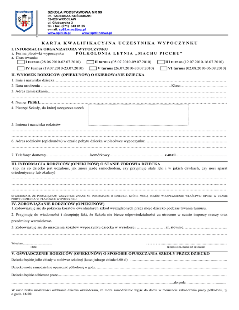 SZKOŁA PODSTAWOWA NR 99 im. TADEUSZA KOŚCIUSZKI 52-026 WROCŁAW ul. Głubczycka 3 tel. / fax. (071) 343 01 25 e-mail: [email protected] www.sp99.i5.pl www.sp99.nazwa.pl KARTA KWALIFIKACYJNA UCZESTNIKA WYPOCZYNKU I. INFORMACJA ORGANIZATORA WYPOCZYNKU 1. Forma placówki wypoczynku PÓŁKOLONIA LETNIA „MACHU PICCHU” 2. Czas trwania: I turnus (28.06.2010-02.07.2010) II turnus (05.07.2010-09.07.2010) III turnus (12.07.2010-16.07.2010) IV turnus (19.07.2010-23.07.2010) V turnus (26.07.2010-30.07.2010) VI turnus (02.08.2010-06.08.2010) II. WNIOSEK RODZICÓW (OPIEKUNÓW) O SKIEROWANIE DZIECKA 1. Imię i nazwisko dziecka……………………………………………………………………………………………………..…………. 2. Data urodzenia ……………………………………………………….……………………….……Klasa……….….………..…....….. 3. Adres zamieszkania……………………………………………………………………………………………………………..……… ……………………………………………………………………………………………………………………………………..……… 4. Numer PESEL…………………………………………………………………………………………………………………..……… 4. Pieczęć Szkoły, do której uczęszcza uczeń 5. Imiona i nazwiska rodziców …………………………………………………………………………………………………………………………………..………… …………………………………………………………………………………………………………………………………..………… 6. Adres rodziców (opiekunów) w czasie pobytu dziecka w placówce wypoczynku:…………………………………………..………... …………………………………………………………………………………………………………………………………..………… 7. Telefony: domowy.……..………….…………komórkowy……………………..…..…...……e-mail…………………....................... III. INFORMACJA RODZICÓW (OPIEKUNÓW) O STANIE ZDROWIA DZIECKA (np. na co dziecko jest uczulone, jak znosi jazdę samochodem, czy przyjmuje stale leki i w jakich dawkach, czy nosi aparat ortodontyczny lub okulary) ………………………………………………………………………………………………………………………………………..…… ………………………………………………………………………………………………………………………………………..…… ………………………………………………………………………………………………………………………………………..…… STWIERDZAM, ŻE PODAŁEM(AM) WSZYSTKIE ZNANE MI INFORMACJE O DZIECKU, KTÓRE MOGĄ POMÓC W ZAPEWNIENIU WŁAŚCIWEJ OPIEKI W CZASIE POBYTU DZIECKA W PLACÓWCE WYPOCZYNKU. IV. ZOBOWIĄZANIE RODZICÓW (OPIEKUNÓW) 1.Zobowiązuję się do pokrycia kosztów ewentualnych szkód wyrządzonych przez moje dziecko podczas trwania turnusu. 2. Przyjmuję do wiadomości i akceptuję fakt, że Szkoła nie bierze odpowiedzialności za utracone w czasie imprezy rzeczy oraz przedmioty wartościowe. 3. Zobowiązuję się do uiszczenia kosztów wypoczynku dziecka w wysokości ………………… zł, słownie………………..………….. …………………………………………………………………………………………………………………………………..….……… Wrocław.................................... (data) ………....................................................... (podpis ojca, matki lub opiekuna) V. OŚWIADCZENIE RODZICÓW (OPIEKUNÓW) O SPOSOBIE OPUSZCZANIA SZKOŁY PRZEZ DZIECKO Dziecko będzie jadło obiady w stołówce szkolnej (koszt jednego obiadu 6,00 zł) …………………………………………….………………..…...…. Dziecko może samodzielnie opuszczać półkolonię o godz. ………………………………………………………..……………………………..…..….. Dziecko będzie odbierane przez…………………………………………………………….………………………………....…………………..……… …………………………………………………………………………………….…………………………….…..do godz. …………………..…...….. W razie braku możliwości odebrania dziecka oświadczam, że może samodzielnie wyjść do domu w momencie zakończenia pracy półkolonii, tj. o godz. 16:00. Akceptuję treść regulaminu wewnętrznego półkolonii letnich „M A C H U P I C C H U ”. ………....................................................... Wrocław.................................... (data) (podpis ojca, matki lub opiekuna) VI. INFORMACJA PIELĘGNIARKI O SZCZEPIENIACH lub przedstawienie książeczki zdrowia z aktualnym wpisem szczepień (kserokopia zestawienia szczepień) Szczepienia ochronne (podać rok): tężec ................................................, błonica ................................................, dur ..................................................., Inne………………………………………………………………………………………………………………………………………………………… …………..……...………………………………………………………………………………………………………………………….………………. Wrocław................................. (data) …………………………………………………………………………… (podpis osoby upoważnionej) VII. INFORMACJA WYCHOWAWCY