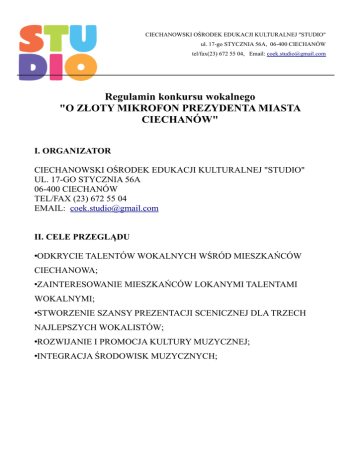 CIECHANOWSKI OŚRODEK EDUKACJI KULTURALNEJ "STUDIO" ul. 17-go STYCZNIA 56A, 06-400 CIECHANÓW tel/fax(23) 672 55 04, Email: [email protected] Regulamin konkursu wokalnego "O ZŁOTY MIKROFON PREZYDENTA MIASTA CIECHANÓW" I. ORGANIZATOR CIECHANOWSKI OŚRODEK EDUKACJI KULTURALNEJ "STUDIO" UL. 17-GO STYCZNIA 56A 06-400 CIECHANÓW TEL/FAX (23) 672 55 04 EMAIL: [email protected] II. CELE PRZEGLĄDU •ODKRYCIE TALENTÓW WOKALNYCH WŚRÓD MIESZKAŃCÓW CIECHANOWA; •ZAINTERESOWANIE MIESZKAŃCÓW LOKANYMI TALENTAMI WOKALNYMI; •STWORZENIE SZANSY PREZENTACJI SCENICZNEJ DLA TRZECH NAJLEPSZYCH WOKALISTÓW; •ROZWIJANIE I PROMOCJA KULTURY MUZYCZNEJ; •INTEGRACJA ŚRODOWISK MUZYCZNYCH; III.WARUNKI UCZESTNICTWA •W KONKURSIE WOKALNYM "O ZŁOTY MIKROFON PREZYDENTA MIASTA CIECHANÓW" MOGĄ WZIĄĆ UDZIAŁ NASTĘPUJĄCE FORMY MUZYCZNO-SCENICZNE: SOLISTA •KONKURS WOKALNY "O ZŁOTY MIKROFON PREZYDENTA MIASTA CIECHANÓW" PRZEZNACZONY JEST DLA MIESZKAŃCÓW CIECHANOWA ORAZ POWIATU CIECHANOWSKIEGO POWYŻEJ 13 ROKU ŻYCIA; •NIEPEŁNOLETNI UCZESTNICY KONKURSU MUSZĄ OKAZAĆ W PUNKCIE PRZYJĘCIA ZGŁOSZEŃ PISEMNĄ ZGODĘ RODZICÓW NA UDZIAŁ W WW. KONKURSIE (BEZ ZGODY RODZICA UCZESTNIK NIE MOŻE WZIĄĆ UDZIAŁU W KONKURSIE); •UCZESTNICY PRZYGOTOWUJĄ UTWÓR MUZYCZNY ZAŚPIEWANY W DOWOLNYM JĘZYKU; •UCZESTNICY MOGĄ KORZYSTAĆ Z PODKŁADÓW MUZYCZNYCH NA NOŚNIKU USB; •NA NOŚNIKACH MOŻE ZNAJDOWAĆ SIĘ JEDYNIE PODKŁAD MUZYCZNY; •DŁUGOŚĆ PREZENTACJI NIE MOŻE PRZEKROCZYĆ 5 MIN.; •UTWORY ZGŁOSZONE DO KONKURSU NIE PODLEGAJĄ ZMIANIE. IV. TERMINY •FORMULARZ ZGŁOSZENIOWY NALEŻY WYPEŁNIĆ W PUNKCIE ORGANIZATORA(NAMIOT) UL. WARSZAWSKA PRZY POMNIKU ŚW. PIOTRA W SOBOTĘ 29.08.2015R. MIĘDZY GODZINĄ 15.30 A 17.30. •KONKURS ZACZYNA SIĘ O GODZINIE 18.00. UL.WARSZAWSKA -POMNIK ŚW. PIOTRA. • NOŚNIK USB Z PODKŁADEM MUZYCZNYM KAŻDY UCZESTNIK TRZYMA PRZY SOBIE. •OGŁOSZENIE WYNIKÓW KONKURSU ODBĘDZIE SIĘ NA UL. WARSZAWSKIEJ – POMNIK ŚW. PIOTRA, DNIA 29.08.2015R. ROKU, OKOŁO GODZINY 19.30.; •FINAŁ KONKURSU ODBĘDZIE SIĘ 29.08.2015 ROKU, OK. GODZINY 19.30. V. JURY- NAGRODY •OCENY PREZENTACJI DOKONA PUBLICZNOŚĆ W TAJNYM GŁOSOWANIU- KAŻDEMU UCZESTNIKOWI ZOSTANIE PRZYZNANY NUMER; •DO FINAŁU PRZECHODZĄ 3 OSOBY WYBRANE PRZEZ PUBLICZNOŚĆ; •GŁÓWNĄ NAGRODĘ PRZYZNAJE POWOŁANE PRZEZ ORGANIZATORA 3-OSOBOWE JURY; •GŁÓWNA NAGRODA TO 1.000 ZŁ. •WERDYKT JURY W ZAKRESIE PREZENTACJI JEST OSTATECZNY; •FINALIŚCI BĘDĄ MOGLI BEZPŁATNIE NAGRAĆ SWÓJ UTWÓR W SIEDZIBIE ORGANIZATORA; VI. UWAGI KOŃCOWE •UCZESTNIK KONKURSU MOŻE ZAPREZENTOWAĆ SIĘ NA PRZESŁUCHANIU TYLKO RAZ; •WYKONAWCY WYSTĘPUJĄ W PORZĄDKU USTALONYM PRZEZ ORGANIZATORA – DECYDUJE KOLEJNOŚĆ ZGŁOSZEŃ; •ORGANIZATOR ZAPEWNIA NAGŁOŚNIENIE, ODTWARZACZ NOŚNIKA USB ORAZ OBSŁUGĘ TECHNICZNĄ; •ZGŁOSZENIE UDZIAŁU W KONKURSIE PRZEZ WYPEŁNIENIE FORMULARZA JEST RÓWNOZNACZNE Z PRZYJĘCIEM NINIEJSZEGO REGULAMINU ORAZ ZGODY DO PRZETWARZANIA DANYCH OSOBOWYCH W CELU PROMOCJI ORGANIZATORA; •OPIEKUNOWIE WYRAŻAJĄ ZGODĘ NA WYKORZYSTANIE WIZERUNKU UCZESTNIKÓW KONKURSU DO CELÓW PROMOCYJNYCH ORGANIZATORA; •JEDYNĄ FORMĄ ZGŁOSZENIA UCZESTNICTWA W KONKURSIE JEST WYPEŁNIENIE FORMULARZA ZGODNIE Z POWYŻSZYMI KRYTERIAMI; OSOBY NIESPEŁNIAJĄCE WARUNKÓW UCZESTNICTWA, NIE ZOSTANĄ DOPUSZCZONE DO UDZIAŁU W KONKURSIE; •SPRAWY NIEUJĘTE W REGULAMINIE ROZSTRZYGA ORGANIZATOR;