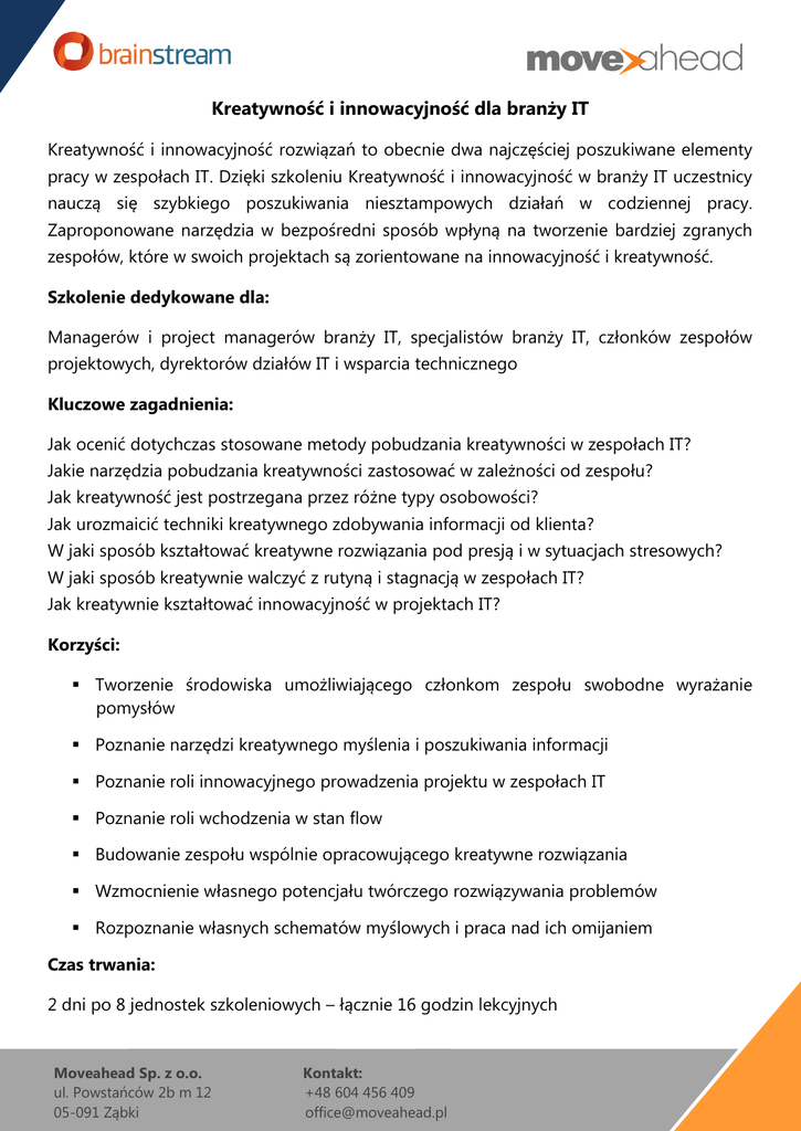 Kreatywność i innowacyjność dla branży IT Kreatywność i innowacyjność rozwiązań to obecnie dwa najczęściej poszukiwane elementy pracy w zespołach IT. Dzięki szkoleniu Kreatywność i innowacyjność w branży IT uczestnicy nauczą się szybkiego poszukiwania niesztampowych działań w codziennej pracy. Zaproponowane narzędzia w bezpośredni sposób wpłyną na tworzenie bardziej zgranych zespołów, które w swoich projektach są zorientowane na innowacyjność i kreatywność. Szkolenie dedykowane dla: Managerów i project managerów branży IT, specjalistów branży IT, członków zespołów projektowych, dyrektorów działów IT i wsparcia technicznego Kluczowe zagadnienia: Jak ocenić dotychczas stosowane metody pobudzania kreatywności w zespołach IT? Jakie narzędzia pobudzania kreatywności zastosować w zależności od zespołu? Jak kreatywność jest postrzegana przez różne typy osobowości? Jak urozmaicić techniki kreatywnego zdobywania informacji od klienta? W jaki sposób kształtować kreatywne rozwiązania pod presją i w sytuacjach stresowych? W jaki sposób kreatywnie walczyć z rutyną i stagnacją w zespołach IT? Jak kreatywnie kształtować innowacyjność w projektach IT? Korzyści: Tworzenie środowiska umożliwiającego członkom zespołu swobodne wyrażanie pomysłów Poznanie narzędzi kreatywnego myślenia i poszukiwania informacji Poznanie roli innowacyjnego prowadzenia projektu w zespołach IT Poznanie roli wchodzenia w stan flow Budowanie zespołu wspólnie opracowującego kreatywne rozwiązania Wzmocnienie własnego potencjału twórczego rozwiązywania problemów Rozpoznanie własnych schematów myślowych i praca nad ich omijaniem Czas trwania: 2 dni po 8 jednostek szkoleniowych – łącznie 16 godzin lekcyjnych Moveahead Sp. z o.o. Mo ul. Powstańców 2b m 12 05-091 Ząbki Kontakt: +48 604 456 409 [email protected] Program: Dzień 1 Moduł 1 – Kreatywność a efektywny zespół Autodiagnoza dotychczas wykorzystywanych narzędzi pobudzania kreatywności własnej i zespołu Wyłonienie istniejącej strategii myślenia i działania kreatywnego w zespole Ocena wpływu innowacyjności na efektywność zespołu Moduł 2 – Praca z informacją Rozwój umiejętności wyłaniania informacji od klienta i siebie wzajemnie w sposób kreatywny Rozwój umiejętności kreatywnego wykorzystania informacji do pracy w zespole Rozpoznawanie własnych schematów myślenia i praca z nimi Moduł 3 – Narzędzia kreatywnego myślenia Techniki kreatywnej pracy zespołowej Techniki kreatywnej pracy indywidualnej Dostosowanie technik kreatywnego myślenia do indywidualnego stylu działania Dzień 2 Moduł 4 – Kreatywność w walce ze stresem Ukształtowanie umiejętności kreatywnego myślenia w sytuacjach stresu i presji Kreatywne myślenie jako sposób obniżenia napięcia w zespole Narzędzia kreatywnego myślenia a podział odpowiedzialności w zespole Moduł 5 – Innowacyjność – remedium na rutynę Wzmocnienie umiejętności wychodzenia z poziomu rutyny czy stagnacji zespołowej Poszukiwanie kreatywnych rozwiązań jako element teambuildingu dla IT Wpływ kreatywnego myślenia na relacje w zespole Moveahead Sp. z o.o. Mo ul. Powstańców 2b m 12 05-091 Ząbki Kontakt: +48 604 456 409 [email protected] Moduł 6 – Kreatywność w pracy projektowej Rozwinięcie i ukształtowanie nowych umiejętności kreatywnego tworzenia projektów Rozwinięcie i ukształtowanie nowych narzędzi kreatywnego tworzenia projektów Rozwinięcie umiejętności kreatywnej ewaluacji projektu Metody szkoleniowe: Miniwykład Ćwiczenia indywidualne Ćwiczenia grupowe Studia przypadków Indywidualne studia przypadków oraz informacje zwrotne Gry grupowe Symulacje W przypadku pytań do dyspozycji pozostaje Izabela Żyłka +48 604 456 409 [email protected] Moveahead Sp. z o.o. Mo ul. Powstańców 2b m 12 05-091 Ząbki Kontakt: +48 604 456 409 [email protected]