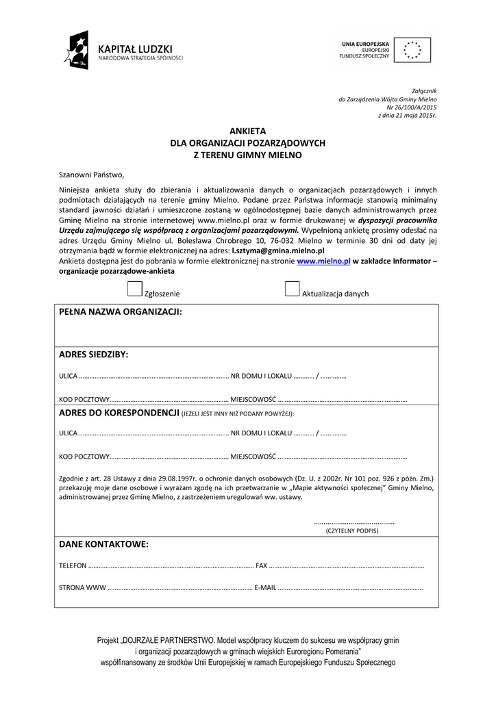 Załącznik do Zarządzenia Wójta Gminy Mielno Nr 26/100/A/2015 z dnia 21 maja 2015r. ANKIETA DLA ORGANIZACJI POZARZĄDOWYCH Z TERENU GIMNY MIELNO Szanowni Państwo, Niniejsza ankieta służy do zbierania i aktualizowania danych o organizacjach pozarządowych i innych podmiotach działających na terenie gminy Mielno. Podane przez Państwa informacje stanowią minimalny standard jawności działań i umieszczone zostaną w ogólnodostępnej bazie danych administrowanych przez Gminę Mielno na stronie internetowej www.mielno.pl oraz w formie drukowanej w dyspozycji pracownika Urzędu zajmującego się współpracą z organizacjami pozarządowymi. Wypełnioną ankietę prosimy odesłać na adres Urzędu Gminy Mielno ul. Bolesława Chrobrego 10, 76-032 Mielno w terminie 30 dni od daty jej otrzymania bądź w formie elektronicznej na adres: [email protected] Ankieta dostępna jest do pobrania w formie elektronicznej na stronie www.mielno.pl w zakładce Informator – organizacje pozarządowe-ankieta Zgłoszenie Aktualizacja danych PEŁNA NAZWA ORGANIZACJI: ADRES SIEDZIBY: ULICA …………………………………………………………………………… NR DOMU I LOKALU ………… / …………… KOD POCZTOWY…………………………………………………………… MIEJSCOWOŚĆ ………………………………………………………………… ADRES DO KORESPONDENCJI (JEŻELI JEST INNY NIŻ PODANY POWYŻEJ): ULICA …………………………………………………………………………… NR DOMU I LOKALU ………… / …………… KOD POCZTOWY…………………………………………………………… MIEJSCOWOŚĆ ………………………………………………………………… Zgodnie z art. 28 Ustawy z dnia 29.08.1997r. o ochronie danych osobowych (Dz. U. z 2002r. Nr 101 poz. 926 z późn. Zm.) przekazuję moje dane osobowe i wyrażam zgodę na ich przetwarzanie w „Mapie aktywności społecznej” Gminy Mielno, administrowanej przez Gminę Mielno, z zastrzeżeniem uregulowań ww. ustawy. …………………………………… (CZYTELNY PODPIS) DANE KONTAKTOWE: TELEFON …………………………………………………………………………………… FAX ……………………………………………………………………………… STRONA WWW ………………………………………………………………………… E-MAIL ………………………………………………………………………… Projekt „DOJRZAŁE PARTNERSTWO. Model współpracy kluczem do sukcesu we współpracy gmin i organizacji pozarządowych w gminach wiejskich Euroregionu Pomerania” współfinansowany ze środków Unii Europejskiej w ramach Europejskiego Funduszu Społecznego STATUS PRAWNY ORGANIZACJI: STATUS ORAGNIZACJI PUBLICZNEGO: STOWARZYSZENIE REJESTROWANE STOWARZYSZENIE ZWYKŁE POŻYTKU POSIADA STOWARZYSZENIE KULTURY FIZYCZNEJ NIE POSIADA INNY (PODAĆ JAKI) …………………………………………………… NUMER KRS: NUMER W INNYM REJESTRZE LUB EWIDENCJI: (PROSZĘ WSKAZAĆ JAKI REJESTR/EWIDENCJA) DATA REJESTRACJI: ZASIĘG DZIAŁANIA: GMINA POWIAT WOJEWÓDZTWO KRAJ AKTUALNY SKŁAD WŁADZ ORGANIZACJI (IMIONA I NAZWISKA WSZYSTKICH CZŁONKÓW WŁADZ ORGANIZACJI): 1. ………………………………………………………………………………………………………… FUNKCJA …………………………………………………… 2. ………………………………………………………………………………………………………… FUNKCJA …………………………………………………… 3. ………………………………………………………………………………………………………… FUNKCJA …………………………………………………… 4. ………………………………………………………………………………………………………… FUNKCJA …………………………………………………… 5. ………………………………………………………………………………………………………… FUNKCJA …………………………………………………… 6. ………………………………………………………………………………………………………… FUNKCJA …………………………………………………… 7. ………………………………………………………………………………………………………… FUNKCJA …………………………………………………… 8. ………………………………………………………………………………………………………… FUNKCJA …………………………………………………… 9. ………………………………………………………………………………………………………… FUNKCJA …………………………………………………… 10. ………………………………………………………………………………………………………… FUNKCJA …………………………………………………… LICZBA CZŁONKÓW ORGANIZACJI (NIE DOTYCZY FUNDACJI): Projekt „DOJRZAŁE PARTNERSTWO. Model współpracy kluczem do sukcesu we współpracy gmin i organizacji pozarządowych w gminach wiejskich Euroregionu Pomerania” współfinansowany ze środków Unii Europejskiej w ramach Europejskiego Funduszu Społecznego DOTYCHCZASOWE OSIĄGNIĘCIA I DOŚWIADCZENIA (OGÓLNIE): PRZEDSIĘWZIĘCIA PLANOWANE DO REALIZACJI (PROSZĘ PODAĆ INFORMACJĘ O PLANOWANYCH PRZEDSIĘWZIĘCIACH W PERSPEKTYWIE NAJBLIŻSZYCH 12 MIESIĘCY NP. FESTYN, KONKURS, OTWARTE SZKOLENIE I INNE) Projekt „DOJRZAŁE PARTNERSTWO. Model współpracy kluczem do sukcesu we współpracy gmin i organizacji pozarządowych w gminach wiejskich Euroregionu Pomerania