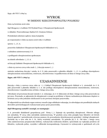 Sygn. akt VII U 1769/14 WYROK W IMIENIU RZECZYPOSPOLITEJ POLSKIEJ Dnia 04 kwietnia 2016 roku Sąd Okręgowy w Lublinie VII Wydział Pracy i Ubezpieczeń Społecznych w składzie: Przewodniczący Sędzia S.O. Grażyna Cichosz Protokolant sekretarz sądowy Anna Łempicka po rozpoznaniu w dniu 23 marca 2016 roku w Lublinie sprawy (...) I. A. przeciwko Zakładowi Ubezpieczeń Społecznych Oddziałowi w L. z udziałem zainteresowanej J. S. o podleganie ubezpieczeniom społecznym na skutek odwołania (...) I. A. od decyzji Zakładu Ubezpieczeń Społecznych Oddziału w L. z dnia 03 czerwca 2014 roku znak: (...) decyzja numer (...) zmienia zaskarżoną decyzję i ustala, że J. S. jako pracownik u płatnika składek (...) I. A. podlega obowiązkowo ubezpieczeniom emerytalnemu, rentowym, chorobowemu i wypadkowemu od dnia 01 lutego 2014 roku. Sygn. akt VII U 1769/14 UZASADNIENIE Decyzją z dnia 3 czerwca 2014 roku nr (...) Zakład Ubezpieczeń Społecznych Oddział w L. stwierdził, że J. S. jako pracownik u płatnika składek A. I. A. nie podlega obowiązkowo ubezpieczeniom emerytalnemu, rentowym, chorobowemu i wypadkowemu od dnia 1 lutego 2014 roku. Odwołanie od powyższej decyzji wniosła I. A. wskazując, że J. S. faktycznie od dnia 1 lutego 2014 roku pracowała na jej rzecz. Przyznała, ze zgłoszenie do ubezpieczeń z uwagi na problemy w biurze rachunkowym dokonano dopiero w kwietniu 2014 roku jednakże okoliczność ta nie powinna obciążać pracownika. W odpowiedzi na odwołanie organ rentowy wnosił o jego oddalenie wskazując, że odwołująca nie przedłożyła żadnych dowodów potwierdzających wykonywanie pracy przez pracownika. Sąd Okręgowy ustalił i zważył, co następuje: I. A. prowadzi działalność gospodarczą pod firmą (...). Zajmuje się sprzedażą ubezpieczeń. Obecnie nikogo nie zatrudnia. W 2014 roku zatrudniła zainteresowaną. W grudniu 2013 roku przejęła bazy klientów od dwóch innych agentów i potrzebowała wówczas pomocy do prowadzenia dotychczasowej sprzedaży i obsługi ubezpieczeń. Zwróciła się w tym celu do J. B., którą wcześniej zatrudniała. Ta poleciła jej J. S.. Od dnia 1 lutego 2014 roku zainteresowana przyjmowała telefony, wykonywała rozliczenia druków, sprawdzała czy wpłynęły przelewy od klientów, wydawała polisy, wysyłała i odbierała korespondencję. Czynności te wykonywała w godzinach od 9 do 16. Podpisywała listę obecności. Pracowała do dnia 26 marca 2014 roku. Wnioskodawczyni wiedziała w chwili zatrudnienia zainteresowanej, że jest ona w ciąży. Nie miała jednak innej zaufanej osoby, której mogłaby powierzyć prowadzenie swojego biznesu. Miejscem pracy zainteresowanej było biuro przy ul. (...). Po przejściu zainteresowanej na zwolnienie lekarskie wnioskodawczyni poprosiła męża o pomoc, a w pozostałym zakresie czynności przekazała menedżerowi z W.. Przed tą decyzją wnioskodawczyni spróbowała zatrudnić inną osobę, ale wówczas zginęła gotówka z utargu i zrezygnowała z tego zamysłu (zeznania wnioskodawczyni – k. 24v-25, 49v, zeznania zainteresowanej – k. 25v, 50, 70v, umowa najmu – k. 29-35, zeznania A. T. – k. 48v-49, zeznania A. S. – k. 49). W dniu 1 lipca 2010 roku zawarła umowę zlecenia na obsługę rachunkową z Biurem (...) (umowa – k. 12). Zainteresowana w dniu 1 lutego 2014 roku była w (...) tygodniu ciąży, która przebiegała prawidłowo. Brak było przeciwskazań zdrowotnych do podjęcia niniejszego zatrudnienia (opinia biegłego – k. 53). Powyższy stan faktyczny został ustalony w oparciu o powołane dowody z dokumentów oraz zeznania wnioskodawczyni, zainteresowanej i wskazanych świadków. Dokumenty dostarczone przez wnioskodawczynię jak i zainteresowaną zostały prawidłowo sporządzone, były czytelne i pozbawione poprawek. Brak było podstaw do odmówienia dania im wiary. Przesłuchane w sprawie osoby są osobami obcymi dla stron procesu. A. T. zajmuje się sprzątaniem w galerii przy ul. (...), a A. S. prowadzi tam sklep zoologiczny. Świadkowie mieli zatem obiektywną możliwość obserwowania zainteresowanej w pracy. Z ich zeznań wynika jednoznacznie, że J. S. wykonywała pracę na stoisku I. A. od lutego do kwietnia 2014 roku, po czym na stoisku tym widywali wnioskodawczynię a sporadycznie także jej męża. Zeznania te w pełni korelują z twierdzeniami wnioskodawczyni, która stanowczo wskazała, że poza zainteresowaną nie udało jej się znaleźć innej osoby do do pomocy, gdyż próba zatrudnienia osoby nieznajomej zakończyła się utratą gotówki z utargu. Twierdzenia te znalazły również poparcie w zeznaniach zainteresowanej, która potwierdziła charakter wykonywanych czynności, miejsce ich wykonywania. Treść tych dowodów w pełni ze sobą korelowała oraz uzupełniała się nawzajem. Nie zawierały one sprzeczności, które mogłyby wpłynąć na ich wiarygodność. Odwołanie I. A. zasługuje na uwzględnienie. Zgodnie z art. 6 ust. l pkt l, art. 11, art. 12 i art. 13 pkt l ustawy z dnia 13 października 1998 roku o systemie ubezpieczeń społecznych (tekst jedn. Dz.U. z 2015 roku, poz. 121) obowiązkowo ubezpieczeniom emerytalnemu, rentowym, chorobowemu i wypadkowemu podlegają osoby fizyczne będące pracownikami w okresie od dnia nawiązania stosunku pracy do dnia ustania tego stosunku. Stosownie do treści art. 22 k.p. przez nawiązanie stosunku pracy pracownik zobowiązuje się do wykonywania pracy określonego rodzaju na rzecz pracodawcy i pod jego kierownictwem oraz w miejscu i czasie wyznaczonym przez pracodawcę, a pracodawca - do zatrudnienia pracownika za wynagrodzeniem. Obowiązek podlegania ubezpieczeniom społecznym dotyczy więc wyłącznie pracowników faktycznie wykonujących zatrudnienie w ramach ważnego stosunku pracy. Zgodnie z art. 83 § l k.c. nieważne jest oświadczenie woli złożone drugiej stronie za jej zgodą dla pozoru. Pozorność jest wadą oświadczenia woli polegającą na świadomej, a prz