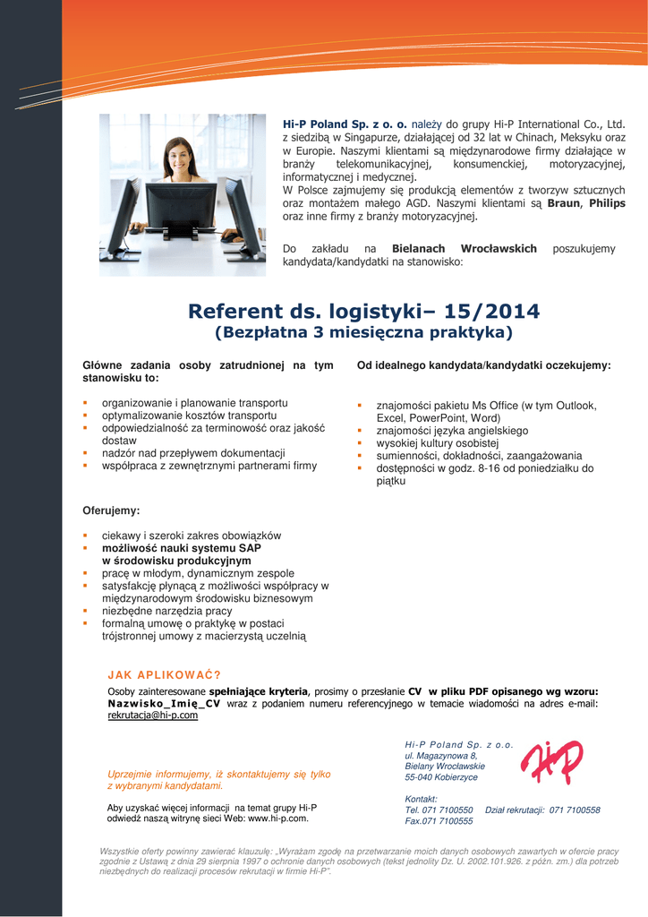 Hi-P Poland Sp. z o. o. należy do grupy Hi-P International Co., Ltd. z siedzibą w Singapurze, działającej od 32 lat w Chinach, Meksyku oraz w Europie. Naszymi klientami są międzynarodowe firmy działające w branży telekomunikacyjnej, konsumenckiej, motoryzacyjnej, informatycznej i medycznej. W Polsce zajmujemy się produkcją elementów z tworzyw sztucznych oraz montażem małego AGD. Naszymi klientami są Braun, Philips oraz inne firmy z branży motoryzacyjnej. Do zakładu na Bielanach Wrocławskich kandydata/kandydatki na stanowisko: poszukujemy Referent ds. logistyki– 15/2014 (Bezpłatna 3 miesięczna praktyka) Główne zadania osoby zatrudnionej na tym stanowisku to: organizowanie i planowanie transportu optymalizowanie kosztów transportu odpowiedzialność za terminowość oraz jakość dostaw nadzór nad przepływem dokumentacji współpraca z zewnętrznymi partnerami firmy Od idealnego kandydata/kandydatki oczekujemy: znajomości pakietu Ms Office (w tym Outlook, Excel, PowerPoint, Word) znajomości języka angielskiego wysokiej kultury osobistej sumienności, dokładności, zaangażowania dostępności w godz. 8-16 od poniedziałku do piątku Oferujemy: ciekawy i szeroki zakres obowiązków możliwość nauki systemu SAP w środowisku produkcyjnym pracę w młodym, dynamicznym zespole satysfakcję płynącą z możliwości współpracy w międzynarodowym środowisku biznesowym niezbędne narzędzia pracy formalną umowę o praktykę w postaci trójstronnej umowy z macierzystą uczelnią J AK AP L I KO W AĆ ? Osoby zainteresowane spełniające kryteria, prosimy o przesłanie CV w pliku PDF opisanego wg wzoru: N a z w i s k o _ I m i ę _ C V wraz z podaniem numeru referencyjnego w temacie wiadomości na adres e-mail: [email protected] Uprzejmie informujemy, iż skontaktujemy się tylko z wybranymi kandydatami. Aby uzyskać więcej informacji na temat grupy Hi-P odwiedź naszą witrynę sieci Web: www.hi-p.com. Hi-P Poland Sp. z o.o. ul. Magazynowa 8, Bielany Wrocławskie 55-040 Kobierzyce Kontakt: Tel. 071 7100550 Fax.071 7100555 Dział rekrutacji: 071 7100558 Wszystkie oferty powinny zawierać klauzulę: „Wyrażam zgodę na przetwarzanie moich danych osobowych zawartych w ofercie pracy zgodnie z Ustawą z dnia 29 sierpnia 1997 o ochronie danych osobowych (tekst jednolity Dz. U. 2002.101.926. z późn. zm.) dla potrzeb niezbędnych do realizacji procesów rekrutacji w firmie Hi-P”.