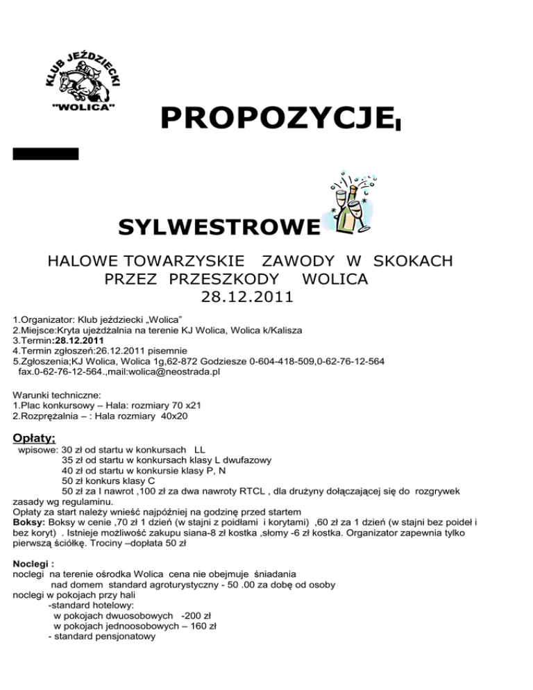 PROPOZYCJE SYLWESTROWE HALOWE TOWARZYSKIE ZAWODY W SKOKACH PRZEZ PRZESZKODY WOLICA 28.12.2011 1.Organizator: Klub jeździecki „Wolica” 2.Miejsce:Kryta ujeżdżalnia na terenie KJ Wolica, Wolica k/Kalisza 3.Termin:28.12.2011 4.Termin zgłoszeń:26.12.2011 pisemnie 5.Zgłoszenia;KJ Wolica, Wolica 1g,62-872 Godziesze 0-604-418-509,0-62-76-12-564 fax.0-62-76-12-564.,mail:[email protected] Warunki techniczne: 1.Plac konkursowy – Hala: rozmiary 70 x21 2.Rozprężalnia – : Hala rozmiary 40x20 Opłaty; wpisowe: 30 zł od startu w konkursach LL 35 zł od startu w konkursach klasy L dwufazowy 40 zł od startu w konkursie klasy P, N 50 zł konkurs klasy C 50 zł za I nawrot ,100 zł za dwa nawroty RTCL , dla drużyny dołączającej się do rozgrywek zasady wg regulaminu. Opłaty za start należy wnieść najpóźniej na godzinę przed startem Boksy: Boksy w cenie ,70 zł 1 dzień (w stajni z poidłami i korytami) ,60 zł za 1 dzień (w stajni bez poideł i bez koryt) . Istnieje możliwość zakupu siana-8 zł kostka ,słomy -6 zł kostka. Organizator zapewnia tylko pierwszą ściółkę. Trociny –dopłata 50 zł Noclegi : noclegi na terenie ośrodka Wolica cena nie obejmuje śniadania nad domem standard agroturystyczny - 50 .00 za dobę od osoby noclegi w pokojach przy hali -standard hotelowy: w pokojach dwuosobowych -200 zł w pokojach jednoosobowych – 160 zł - standard pensjonatowy w pokojach jednoosobowych przy – 140 zł za pokój na dobę w pokojach dwuosobowych przy -170 zł za pokój na dobę. w pokojach trzyosobowych przy – 230 zł za pokój na dobę no Noclegi Program zawodów: Środa 28.12.2011 Godzina 12.00 Konkurs nr 1 - LL dokładności art.238.1.1 Konkurs nr 2 - L dwufazowy art.274.5.3 Konkurs nr 3 Regional Team Champions League –Konkurs drużynowy dwunawrotowy 90-95cm Konkurs nr 4 - P dwufazowy art.274.5.3. Konkurs nr 5 - N dwufazowy art.274.5.3 Konkurs nr 6 - C dwufazowy art.274.5.3 Nagrody: -.flot’s dla 25% startujących w konkursie - Konkurs nr L dwufazowy – nagrody rzeczowe - Konkurs kl. P I m-ce -300zł ,II m-ce -200 zł, III m-ce 100zł -Konkurs kl N I m-ce -400zł ,II m-ce -300 zł ,III m-ce -200 zł - Konkurs kl C I m-ce -500 zł ,II m-ce 300 zł ,III ,m-ce 200 zł Przy wypłacie nagród ma zastosowanie Art.2 par.3 Regulaminu Krajowych Zawodów w skokach przez przeszkody 2005 rok Przy ilości startujących mniejszej niż 10 w konkursie, organizator zastrzega sobie prawo wypłaty nagród w wysokości 50% zaplanowanych Konkurs klasy C odbędzie się przy minimum 6 zgłoszonych koni Sprawy organizacyjne 1.Organizator nie odpowiada za wypadki, kradzieże i inne zdarzenia losowe mogące mieć miejsce podczas trwania zawodów oraz podczas transportu. 2.Dokumentacja zawodników i koni wg przepisów PZJ 3.Zmiany na listach startowych lub zgłoszenia w dniu zawodów dodatkową opłatą 10.00.