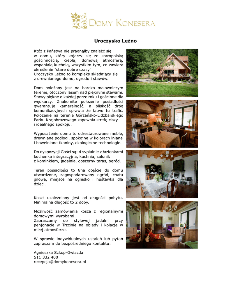 Uroczysko Leźno Któż z Państwa nie pragnąłby znaleźć się w domu, który kojarzy się ze staropolską gościnnością, ciepłą, domową atmosferą, wspaniałą kuchnią, wszystkim tym, co zawiera określenie "stare dobre czasy". Uroczysko Leźno to kompleks składający się z drewnianego domu, ogrodu i stawów. Dom położony jest na bardzo malowniczym terenie, otoczony lasem nad pięknymi stawami. Stawy piękne o każdej porze roku i gościnne dla wędkarzy. Znakomite położenie posiadłości gwarantuje kameralność, a bliskość dróg komunikacyjnych sprawia że łatwo tu trafić. Położenie na terenie Górzańsko-Lidzbarskiego Parku Krajobrazowego zapewnia strefę ciszy i idealnego spokoju. Wyposażenie domu to odrestaurowane meble, drewniane podłogi, spokojne w kolorach lniane i bawełniane tkaniny, ekologiczne technologie. Do dyspozycji Gości są: 4 sypialnie z łazienkami, kuchenka integracyjna, kuchnia, salonik z kominkiem, jadalnia, obszerny taras, ogród. Teren posiadłości to 8ha dojście do domu utwardzone, zagospodarowany ogród, chata gilowa, miejsce na ognisko i huśtawka dla dzieci. Koszt uzależniony jest od długości pobytu. Minimalna długość to 2 doby. Możliwość zamówienia kosza z regionalnymi domowymi wyrobami. Zapraszamy do stylowej jadalni przy penjonacie w Trzcinie na obiady i kolacje w miłej atmosferze. W sprawie indywidualnych ustaleń lub pytań zapraszam do bezpośredniego kontaktu: Agnieszka Szkop-Gwiazda 511 332 400 [email protected]