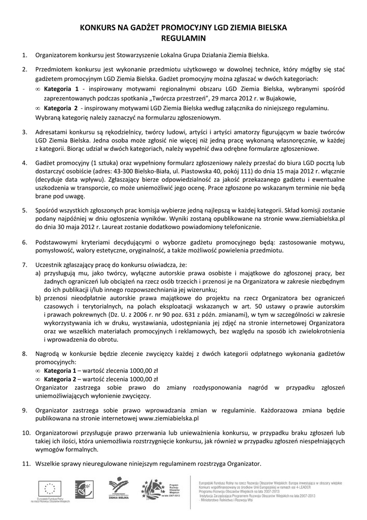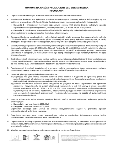 KONKURS NA GADŻET PROMOCYJNY LGD ZIEMIA BIELSKA REGULAMIN 1. Organizatorem konkursu jest Stowarzyszenie Lokalna Grupa Działania Ziemia Bielska. 2. Przedmiotem konkursu jest wykonanie przedmiotu użytkowego w dowolnej technice, który mógłby się stać gadżetem promocyjnym LGD Ziemia Bielska. Gadżet promocyjny można zgłaszać w dwóch kategoriach: • Kategoria 1 - inspirowany motywami regionalnymi obszaru LGD Ziemia Bielska, wybranymi spośród zaprezentowanych podczas spotkania „Twórcza przestrzeń”, 29 marca 2012 r. w Bujakowie, • Kategoria 2 - inspirowany motywami LGD Ziemia Bielska według załącznika do niniejszego regulaminu. Wybraną kategorię należy zaznaczyć na formularzu zgłoszeniowym. 3. Adresatami konkursu są rękodzielnicy, twórcy ludowi, artyści i artyści amatorzy figurującym w bazie twórców LGD Ziemia Bielska. Jedna osoba może zgłosić nie więcej niż jedną pracę wykonaną własnoręcznie, w każdej z kategorii. Biorąc udział w dwóch kategoriach, należy wypełnić dwa odrębne formularze zgłoszeniowe. 4. Gadżet promocyjny (1 sztuka) oraz wypełniony formularz zgłoszeniowy należy przesłać do biura LGD pocztą lub dostarczyć osobiście (adres: 43-300 Bielsko-Biała, ul. Piastowska 40, pokój 111) do dnia 15 maja 2012 r. włącznie (decyduje data wpływu). Zgłaszający bierze odpowiedzialność za jakość przekazanego gadżetu i ewentualne uszkodzenia w transporcie, co może uniemożliwić jego ocenę. Prace zgłoszone po wskazanym terminie nie będą brane pod uwagę. 5. Spośród wszystkich zgłoszonych prac komisja wybierze jedną najlepszą w każdej kategorii. Skład komisji zostanie podany najpóźniej w dniu ogłoszenia wyników. Wyniki zostaną opublikowane na stronie www.ziemiabielska.pl do dnia 30 maja 2012 r. Laureat zostanie dodatkowo powiadomiony telefonicznie. 6. Podstawowymi kryteriami decydującymi o wyborze gadżetu promocyjnego będą: zastosowanie motywu, pomysłowość, walory estetyczne, oryginalność, a także możliwość powielenia przedmiotu. 7. Uczestnik zgłaszający pracę do konkursu oświadcza, że: a) przysługują mu, jako twórcy, wyłączne autorskie prawa osobiste i majątkowe do zgłoszonej pracy, bez żadnych ograniczeń lub obciążeń na rzecz osób trzecich i przenosi je na Organizatora w zakresie niezbędnym do ich publikacji i/lub innego rozpowszechniania jej wizerunku; b) przenosi nieodpłatnie autorskie prawa majątkowe do projektu na rzecz Organizatora bez ograniczeń czasowych i terytorialnych, na polach eksploatacji wskazanych w art. 50 ustawy o prawie autorskim i prawach pokrewnych (Dz. U. z 2006 r. nr 90 poz. 631 z późn. zmianami), w tym w szczególności w zakresie wykorzystywania ich w druku, wystawiania, udostępniania jej zdjęć na stronie internetowej Organizatora oraz we wszelkich materiałach promocyjnych i reklamowych, bez względu na sposób ich zwielokrotnienia i wprowadzenia do obrotu. 8. Nagrodą w konkursie będzie zlecenie zwycięzcy każdej z dwóch kategorii odpłatnego wykonania gadżetów promocyjnych: • Kategoria 1 – wartość zlecenia 1000,00 zł • Kategoria 2 – wartość zlecenia 1000,00 zł Organizator zastrzega sobie prawo do zmiany rozdysponowania nagród w przypadku zgłoszeń uniemożliwiających wyłonienie zwycięzcy. 9. Organizator zastrzega sobie prawo wprowadzania zmian w regulaminie. Każdorazowa zmiana będzie publikowana na stronie internetowej www.ziemiabielska.pl 10. Organizatorowi przysługuje prawo przerwania lub unieważnienia konkursu, w przypadku braku zgłoszeń lub takiej ich ilości, która uniemożliwia rozstrzygnięcie konkursu, jak również w przypadku zgłoszeń niespełniających wymogów formalnych. 11. Wszelkie sprawy nieuregulowane niniejszym regulaminem rozstrzyga Organizator.