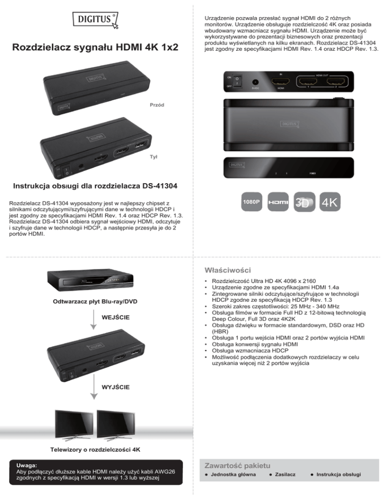 Rozdzielacz sygnału HDMI 4K 1x2 Urządzenie pozwala przesłać sygnał HDMI do 2 różnych monitorów. Urządzenie obsługuje rozdzielczość 4K oraz posiada wbudowany wzmacniacz sygnału HDMI. Urządzenie może być wykorzystywane do prezentacji biznesowych oraz prezentacji produktu wyświetlanych na kilku ekranach. Rozdzielacz DS-41304 jest zgodny ze specyfikacjami HDMI Rev. 1.4 oraz HDCP Rev. 1.3. Przód Tył Instrukcja obsługi dla rozdzielacza DS-41304 4K 1080P Rozdzielacz DS-41304 wyposażony jest w najlepszy chipset z silnikami odczytującymi/szyfrującymi dane w technologii HDCP i jest zgodny ze specyfikacjami HDMI Rev. 1.4 oraz HDCP Rev. 1.3. Rozdzielacz DS-41304 odbiera sygnał wejściowy HDMI, odczytuje i szyfruje dane w technologii HDCP, a następnie przesyła je do 2 portów HDMI. 1 Właściwości Odtwarzacz płyt Blu-ray/DVD WEJŚCIE • Rozdzielczość Ultra HD 4K 4096 x 2160 • Urządzenie zgodne ze specyfikacjami HDMI 1.4a • Zintegrowane silniki odczytujące/szyfrujące w technologii HDCP zgodne ze specyfikacją HDCP Rev. 1.3 • Szeroki zakres częstotliwości: 25 MHz - 340 MHz • Obsługa filmów w formacie Full HD z 12-bitową technologią Deep Colour, Full 3D oraz 4K2K • Obsługa dźwięku w formacie standardowym, DSD oraz HD (HBR) • Obsługa 1 portu wejścia HDMI oraz 2 portów wyjścia HDMI • Obsługa konwersji sygnału HDMI • Obsługa wzmacniacza HDCP • Możliwość podłączenia dodatkowych rozdzielaczy w celu uzyskania więcej niż 2 portów wyjścia WYJŚCIE Telewizory o rozdzielczości 4K Uwaga: Aby podłączyć dłuższe kable HDMI należy użyć kabli AWG26 zgodnych z specyfikacją HDMI w wersji 1.3 lub wyższej Zawartość pakietu Jednostka główna Zasilacz Instrukcja obsługi
