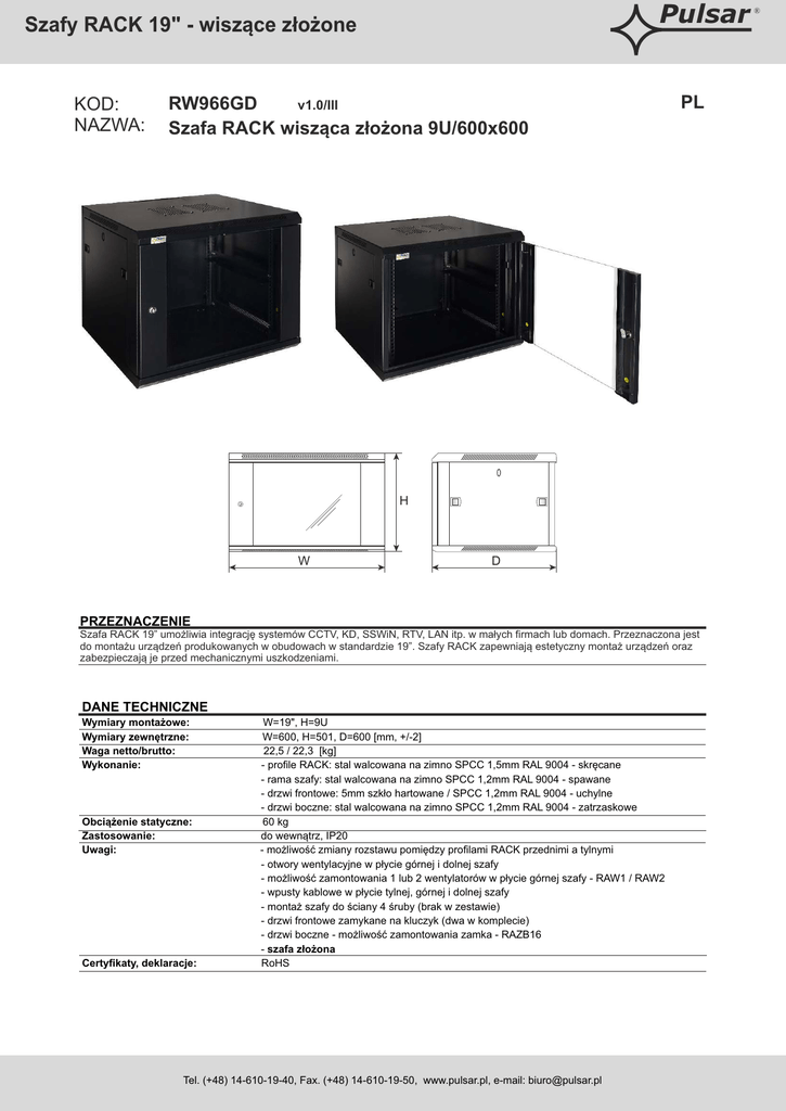 Pulsar Szafy RACK 19" - wiszące złożone KOD: NAZWA: RW966GD v1.0/III Szafa RACK wisząca złożona 9U/600x600 PL H W D PRZEZNACZENIE Szafa RACK 19” umożliwia integrację systemów CCTV, KD, SSWiN, RTV, LAN itp. w małych firmach lub domach. Przeznaczona jest do montażu urządzeń produkowanych w obudowach w standardzie 19”. Szafy RACK zapewniają estetyczny montaż urządzeń oraz zabezpieczają je przed mechanicznymi uszkodzeniami. DANE TECHNICZNE Wymiary montażowe: Wymiary zewnętrzne: Waga netto/brutto: Wykonanie: Obciążenie statyczne: Zastosowanie: Uwagi: Certyfikaty, deklaracje: W=19", H=9U W=600, H=501, D=600 [mm, +/-2] 22,5 / 22,3 [kg] - profile RACK: stal walcowana na zimno SPCC 1,5mm RAL 9004 - skręcane - rama szafy: stal walcowana na zimno SPCC 1,2mm RAL 9004 - spawane - drzwi frontowe: 5mm szkło hartowane / SPCC 1,2mm RAL 9004 - uchylne - drzwi boczne: stal walcowana na zimno SPCC 1,2mm RAL 9004 - zatrzaskowe 60 kg do wewnątrz, IP20 - możliwość zmiany rozstawu pomiędzy profilami RACK przednimi a tylnymi - otwory wentylacyjne w płycie górnej i dolnej szafy - możliwość zamontowania 1 lub 2 wentylatorów w płycie górnej szafy - RAW1 / RAW2 - wpusty kablowe w płycie tylnej, górnej i dolnej szafy - montaż szafy do ściany 4 śruby (brak w zestawie) - drzwi frontowe zamykane na kluczyk (dwa w komplecie) - drzwi boczne - możliwość zamontowania zamka - RAZB16 - szafa złożona RoHS Tel. (+48) 14-610-19-40, Fax. (+48) 14-610-19-50, www.pulsar.pl, e-mail: [email protected] ®