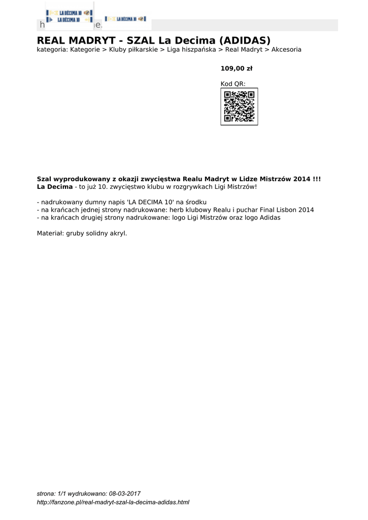 http://fanzone.pl REAL MADRYT - SZAL La Decima (ADIDAS) kategoria: Kategorie > Kluby piłkarskie > Liga hiszpańska > Real Madryt > Akcesoria 109,00 zł Kod QR: Szal wyprodukowany z okazji zwycięstwa Realu Madryt w Lidze Mistrzów 2014 !!! La Decima - to już 10. zwycięstwo klubu w rozgrywkach Ligi Mistrzów! - nadrukowany dumny napis 'LA DECIMA 10' na środku - na krańcach jednej strony nadrukowane: herb klubowy Realu i puchar Final Lisbon 2014 - na krańcach drugiej strony nadrukowane: logo Ligi Mistrzów oraz logo Adidas Materiał: gruby solidny akryl. strona: 1/1 wydrukowano: 08-03-2017 http://fanzone.pl/real-madryt-szal-la-decima-adidas.html