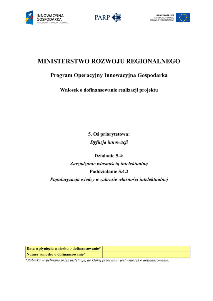 MINISTERSTWO ROZWOJU REGIONALNEGO Program Operacyjny Innowacyjna Gospodarka Wniosek o dofinansowanie realizacji projektu 5. Oś priorytetowa: Dyfuzja innowacji Działanie 5.4: Zarządzanie własnością intelektualną Poddziałanie 5.4.2 Popularyzacja wiedzy w zakresie własności intelektualnej Data wpłynięcia wniosku o dofinansowanie* Numer wniosku o dofinansowanie* *Rubryka wypełniana przez instytucję, do której przesyłany jest wniosek o dofinansowanie. I. Informacje ogólne o projekcie 1. Tytuł projektu 2. Identyfikacja rodzaju interwencji Program Operacyjny Innowacyjna Gospodarka Oś Priorytetowa 5. Dyfuzja innowacji Działanie 5.4 Zarządzanie własnością intelektualną Poddziałanie 5.4.2 Popularyzacja wiedzy w zakresie własności intelektualnej 3. Klasyfikacja projektu Temat priorytetowy Kod 09 Wartość Inne działania mające na celu pobudzenie badań, innowacji i przedsiębiorczości w MSP Forma finansowania 01 Pomoc bezzwrotna Obszar realizacji 00 Nie dotyczy Dział gospodarki 4. Typ projektu Czy stanowi duŜy projekt w rozumieniu rozporządzenia 1083/2006 Planowany cross-financing TAK NIE TAK NIE II. Identyfikacja Wnioskodawcy 5. Formy prowadzonej działalności Typ wnioskodawcy (naleŜy wybrać właściwy typ wnioskodawcy z listy podanej w instrukcji do wniosku) Forma prawna prowadzonej działalności (naleŜy wybrać właściwą formę prawną z listy podanej w instrukcji do wniosku) 6. Dane Wnioskodawcy Nazwa Wnioskodawcy NIP Numer REGON Numer w: a) Krajowym Rejestrze Sądowym b) Ewidencji Działalności Gospodarczej Kod PKD/EKD: Podstawowej działalności wnioskodawcy Projektu, (w przypadku jeśli jest inny niŜ kod działalności podstawowej) 6.A. Adres siedziby: 2 Województwo Powiat Gmina Miejscowość Ulica Nr budynku Nr lokalu Kod pocztowy Numer telefonu Numer faksu Adres poczty elektronicznej Adres strony internetowej 6.B Adres do korespondencji: Województwo Powiat Gmina Miejscowość Ulica Nr budynku Nr lokalu Kod pocztowy Numer telefonu Numer faksu Adres poczty elektronicznej Adres strony internetowej 7. Dane osoby/osób upowaŜnionych przez Wnioskodawcę do kontaktów Imię i nazwisko Stanowisko słuŜbowe Numer telefonu Numer faksu Adres poczty elektronicznej III. Charakterystyka Wnioskodawcy 8. Projekt składany przez Instytucję Otoczenia Biznesu: TAK NIE 9. Instytucja nie działa dla zysku lub przeznacza zysk na TAK cele związane z zadaniami realizowanymi przez PARP NIE 10. Doświadczenie w realizacji usług związanych z popularyzacją wiedzy w zakresie metod, moŜliwości oraz korzyści wynikających z ochrony własności intelektualnej w przedsiębiorstwach Dwa lata temu W roku poprzednim Liczba wykonanych usług Liczba przedsiębiorców objętych tymi usługami 3 <krótki opis tych usług> 11. Posiadane zasoby kadrowe Liczba zatrudnionych osób na umowę o pracę Liczba ekspertów zewnętrznych na stale współpracujących z instytucją ………………. osób ………………. osób Lista przedstawiająca kwalifikacje i doświadczenie osób działających na rzecz popularyzacji wiedzy w zakresie metod, moŜliwości oraz korzyści wynikających z ochrony własności intelektualnej Imię i nazwisko Osoba zatrudniona u Posiadane Posiadane Wnioskodawcy/konsultant kwalifikacje doświadczenie zewnętrzny 12. Potencjał finansowy, organizacyjny oraz posiadane zaplecze lokalowo-techniczne NaleŜy przedstawić krótką charakterystykę w następujących kwestiach: Pomieszczenia niezbędne do realizacji projektu, ich wyposaŜenie: Posiadane środki trwałe, które zostaną wykorzystane do realizacji projektu: Potencjał finansowy i organizacyjny niezbędny do realizacji projektu: Inne niezbędne zasoby techniczne do realizacji projektu: 13. Posiadane przez Wnioskodawcę certyfikaty akredytowany certyfikat Systemu Zarządzania Jakością zgodny z TAK wymaganiami normy ISO 9001 lub akredytowany certyfikat Systemu Zarządzania BHP zgodny z TAK wymaganiami OHSAS 18001 lub PN-N-18001 lub NIE NIE akredytowany certyfikat Systemu Zarządzania Środowiskowego NIE zgodny z wymaganiami normy ISO 14001 lub rozporządzeniem TAK EMAS 14. Doświadczenie wnioskodawcy w zarządzaniu i realizacji projektów o podobnym zakresie, w tym projektów finansowanych ze środków Unii Europejskiej Program Działanie Krótki opis projektu IV Opis projektu 15. ZałoŜenia projektu a. Cel projektu b. Opis działań podjętych w celu popularyzacji wiedzy w zakresie metod, moŜliwości oraz korzyści wynikających z ochrony własności intelektualnej w przedsiębiorstwach 4 c. Charakterystyka grupy docelowej odbiorców usługi d. Promocja projektu 16. Uzasadnienie projektu 17. Sposób realizacji projektu Opis powinien zawierać następujące elementy: Proponowane metody, narzędzia i zasoby ludzkie przewidziane do realizacji projektu Sposób koordynacji i zarządzania projektem (struktura zarządzania) Przewidywane w ramach projektu badania efektywności podjętych w ramach niego przedsięwzięć (kryterium fakultatywne) 18. Trwałość projektu Czy usługa opracowana w wyniku projektu będzie kontynuowana przez co najmniej 5 lat po zakończeniu finansowania projektu TAK NIE TAK NIE 19. Komplementarność projektu Czy istnieje powiązanie projektu i komplementarność z innymi projektami wnioskodawcy? Jeśli TAK proszę o opisanie powiązań z innymi projektami 20. Harmonogram realizacji projektu Planowany termin rozpoczęcia realizacji projektu Planowany termin zakończenia realizacji projektu Harmonogram rzeczowo – finansowy realizacji projektu Lp. Wyszczególnienie działań merytorycznych Wydatki Wydatki realizowanych w ramach etapu całkowite kwalifikowane ETAP I: Termin rozpoczęcia: dd/mm/rrrr Termin zakończenia: dd/mm/rrrr 1 2 Razem ETAP I ETAP n: Termin rozpoczęcia: dd/mm/rrrr Termin zakończenia: dd/mm/rrrr 5 1 2 Razem ETAP n Razem wydatki dla projektu 21. Lokalizacja projektu Projekt realizowany na terenie całego kraju Projekt realizowany na następującym tereni