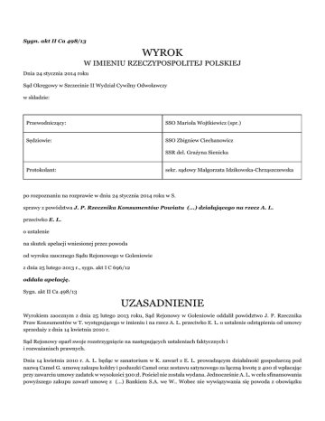 Sygn. akt II Ca 498/13 WYROK W IMIENIU RZECZYPOSPOLITEJ POLSKIEJ Dnia 24 stycznia 2014 roku Sąd Okręgowy w Szczecinie II Wydział Cywilny Odwoławczy w składzie: Przewodniczący: SSO Mariola Wojtkiewicz (spr.) Sędziowie: SSO Zbigniew Ciechanowicz SSR del. Grażyna Sienicka Protokolant: sekr. sądowy Małgorzata Idzikowska-Chrząszczewska po rozpoznaniu na rozprawie w dniu 24 stycznia 2014 roku w S. sprawy z powództwa J. P. Rzecznika Konsumentów Powiatu (...) działającego na rzecz A. L. przeciwko E. L. o ustalenie na skutek apelacji wniesionej przez powoda od wyroku zaocznego Sądu Rejonowego w Goleniowie z dnia 25 lutego 2013 r., sygn. akt I C 696/12 oddala apelację. Sygn. akt II Ca 498/13 UZASADNIENIE Wyrokiem zaocznym z dnia 25 lutego 2013 roku, Sąd Rejonowy w Goleniowie oddalił powództwo J. P. Rzecznika Praw Konsumentów w T. występującego w imieniu i na rzecz A. L. przeciwko E. L. o ustalenie odstąpienia od umowy sprzedaży z dnia 14 kwietnia 2010 r. Sąd Rejonowy oparł swoje rozstrzygnięcie na następujących ustaleniach faktycznych i i rozważaniach prawnych. Dnia 14 kwietnia 2010 r. A. L. będąc w sanatorium w K. zawarł z E. L. prowadzącym działalność gospodarczą pod nazwą Camel G. umowę zakupu kołdry i poduszki Camel oraz zestawu satynowego za łączną kwotę 2 400 zł wpłacając przy zawarciu umowy zadatek w wysokości 300 zł. Pościel nie została wydana. Jednocześnie A. L. w celu sfinansowania powyższego zakupu zawarł umowę z (...) Bankiem S.A. we W.. Wobec nie wywiązywania się powoda z obowiązku uiszczania rat z tytułu zawartej umowy- Bank wystawił bankowy tytuł egzekucyjny, który został zaopatrzony przez sąd w klauzulę wykonalności. Pismami z dnia 4 maja 2010 r. A. L. złożył pozwanemu oświadczenie o odstąpieniu od umowy sprzedaży, a bankowi oświadczenie o odstąpieniu od umowy kredytu. W odpowiedzi na pismo powoda bank wskazał, że oświadczenie zostało złożone po terminie w związku z czym bank nie wyraził zgody na odstąpienie, od łączącej strony umowy kredytowej. Pozwem wniesionym w sprawie I Nc 1283/10 powód żądał zapłaty 300 zł tytułem zwrotu zaliczki oraz ustalenia faktu skutecznego wypowiedzenia umowy. Nakazem zapłaty z dnia 16 listopada 2010 r. Sąd Rejonowy w Goleniowie zasadził od E. L. na rzecz A. L. kwotę 300 zł. Postanowieniem z dnia 14 marca 2011 roku Sąd Rejonowy w Goleniowie nadał na ww. nakazowi klauzulę wykonalności. Przechodząc do rozważań w zakresie żądania ustalenia skutecznego odstąpienia od umowy zakupu kołder zawartej w dniu 14 kwietnia 2010 r. Sąd I instancji wskazał na dyspozycje art. 189 k.p.c., którego materialnoprawną przesłanką jest istnienie po stronie powoda interesu prawnego w wytoczeniu powództwa. W ocenie Sądu I instancji przez „interes prawny” w znaczeniu art. 189 k.p.c. należy rozumieć potrzebę uzyskania korzyści w sferze sytuacji prawnej. Przy czym owa „korzyść” w jakiej osiągnięciu zainteresowana jest osoba występująca z roszczeniem w trybie art. 189 k.p.c. polega na stworzeniu stanu pewności co do aktualnej sytuacji prawnej tego podmiotu. Nadto, istnienie interesu prawnego na co zwrócił uwagę Sad Rejonowy zależy od tego od czy w drodze innego powództwa strona może uzyskać pełną ochronę (tak wyrok SN z 27 stycznia 2004 r., II CK 387/02, niepubl.). W konsekwencji powyższego, Sąd Rejonowy zwrócił uwagę powoda, że możliwość wytoczenia prze niego powództwa o zasądzenie wyklucza istnienie po jego stronie interesu prawnego w wytoczeniu powództwa o ustalenie naruszonego prawa lub stosunku prawnego. W ocenie Sądu, w niniejszej sprawie strona powodowa nie wykazała jednak by zachodziła obiektywna potrzeba ochrony prawnej uzasadniająca wytoczenie powództwa w trybie art. 189 k.p.c. Uzasadniając istnienie interesu prawnego w żądaniu ustalenia, powód podnosił, iż jego sytuacja prawna jest niepewna bowiem wierzyciel Bank wszczyna przeciwko niemu postępowania egzekucyjne na podstawie bankowego tytułu egzekucyjnego zaopatrzonego w nadaną przez Sąd klauzulę wykonalności. W ocenie Sądu Rejonowego takie uzasadnienie interesu prawnego nie pozostaje w bezpośrednim związku ze sformułowaniem żądania o ustalenie, iż A. L. skutecznie odstąpił od umowy zakupu bowiem istnieje druga umowa o kredyt na podstawie której wystawiony został bankowy tytuł egzekucyjny, który został zaopatrzony w klauzulę wykonalności. Sąd Rejonowy zwrócił jednocześnie uwagę powoda, że eliminowaniu z obrotu tytułów wykonawczych, na podstawie których prowadzona jest egzekucja służą inne środki prawne jak chociażby powództwo o pozbawienie wykonalności tytułu wykonawczego. Z powyższym orzeczeniem nie zgodził się powód, który w wywiedzionej apelacji zaskarżył go w całości, wnosząc o jego zmianę poprzez ustalenie, iż A. L. skutecznie odstąpił od umowy sprzedaży z E. L. oraz o zasądzenie od pozwanego na jego rzecz kosztów postępowania. Tak wnosząc, zarzucił wyrokowi sądu I instancji niewłaściwą ocenę przedstawionego materiału dowodowego oraz interpretację przepisów prawa. W uzasadnieniu apelacji powód rozwinął zarzuty apelacji. W ocenie powoda żądanie ustalenia odstąpienia przez powoda od umowy sprzedaży, było zasadne z uwagi na praktykę banków, które nie uznają związku pomiędzy odstąpieniem od umowy sprzedaży a odstąpieniem od umowy kredytu. Jak wskazał powództwo miało charakter prewencyjny, orzeczenie miało bowiem rozstrzygnąć czy prawo powoda istnieje. Nadto, w ocenie skarżącego niezasadne jest dochodzenie przez bank zwrotu ceny zakupu w sytuacji, kiedy to pozwany otrzymał z banku określoną kredytem kwotę i to on w momencie odstąpienia od umowy powinien zwrócić ja bankowi. Sąd Okręgowy zważył, co następuje. Apelacja powoda nie zasługiwała na uwzględnienie. Wbrew zarzutom skarżącego, w oparciu o całokształt zgromadzonego w aktach sprawy materiał