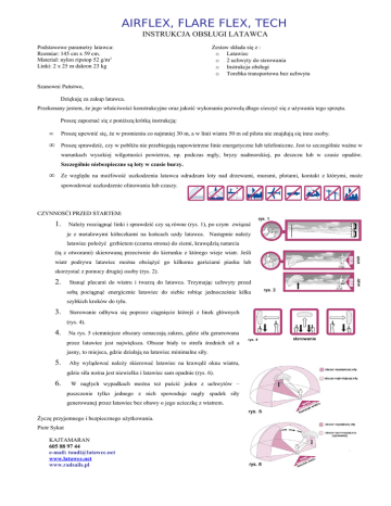AIRFLEX, FLARE FLEX, TECH INSTRUKCJA OBSŁUGI LATAWCA Podstawowe parametry latawca: Rozmiar: 145 cm x 59 cm. Materiał: nylon ripstop 52 g/m2 Linki: 2 x 25 m dakron 23 kg Zestaw składa się z : o Latawiec o 2 uchwyty do sterowania o Instrukcja obsługi o Torebka transportowa bez uchwytu Szanowni Państwo, Dziękuję za zakup latawca. Przekonany jestem, że jego właściwości konstrukcyjne oraz jakość wykonania pozwolą długo cieszyć się z używania tego sprzętu. Proszę zapoznać się z poniższą krótką instrukcją: • Proszę upewnić się, że w promieniu co najmniej 30 m, a w linii wiatru 50 m od pilota nie znajdują się inne osoby. • Proszę sprawdzić, czy w pobliżu nie przebiegają napowietrzne linie energetyczne lub telefoniczne. Jest to szczególnie ważne w warunkach wysokiej wilgotności powietrza, np. podczas mgły, bryzy nadmorskiej, po deszczu lub w czasie opadów. Szczególnie niebezpieczne są loty w czasie burzy. • Ze względu na możliwość uszkodzenia latawca odradzam loty nad drzewami, murami, płotami, kontakt z którymi, może spowodować uszkodzenie olinowania lub czaszy. CZYNNOSĆI PRZED STARTEM: 1. Należy rozciągnąć linki i sprawdzić czy są równe (rys. 1), po czym związać je z metalowymi kółeczkami na końcach uzdy latawca. Następnie należy latawiec położyć grzbietem (czarna strona) do ziemi, krawędzią natarcia (tą z otworami) skierowaną przeciwnie do kierunku z którego wieje wiatr. Jeśli wiatr podrywa latawiec można obciążyć go kilkoma garściami piasku lub skorzystać z pomocy drugiej osoby (rys. 2). 2. Stanąć plecami do wiatru i twarzą do latawca. Trzymając uchwyty przed sobą pociągnąć energicznie latawiec do siebie robiąc jednocześnie kilka szybkich kroków do tyłu. 3. Sterowanie odbywa się poprzez ciągnięcie którejś z linek głównych (rys. 4). 4. Na rys. 5 ciemniejsze obszary oznaczają zakres, gdzie siła generowana przez latawiec jest największa. Obszar biały to strefa średnich sił a jasny, to miejsca, gdzie działają na latawiec minimalne siły. 5. Aby wylądować należy skierować latawiec na krawędź okna wiatru, gdzie siła nośna jest niewielka i latawiec sam opadnie (rys. 6). 6. W nagłych wypadkach można też puścić jeden z uchwytów – puszczenie tylko jednego z nich spowoduje nagły spadek siły generowanej przez latawiec bez obawy o jego ucieczkę z wiatrem. Życzę przyjemnego i bezpiecznego użytkowania. Piotr Sykut KAJTAMARAN 605 88 97 44 e-mail: [email protected] www.latawce.net www.radsails.pl